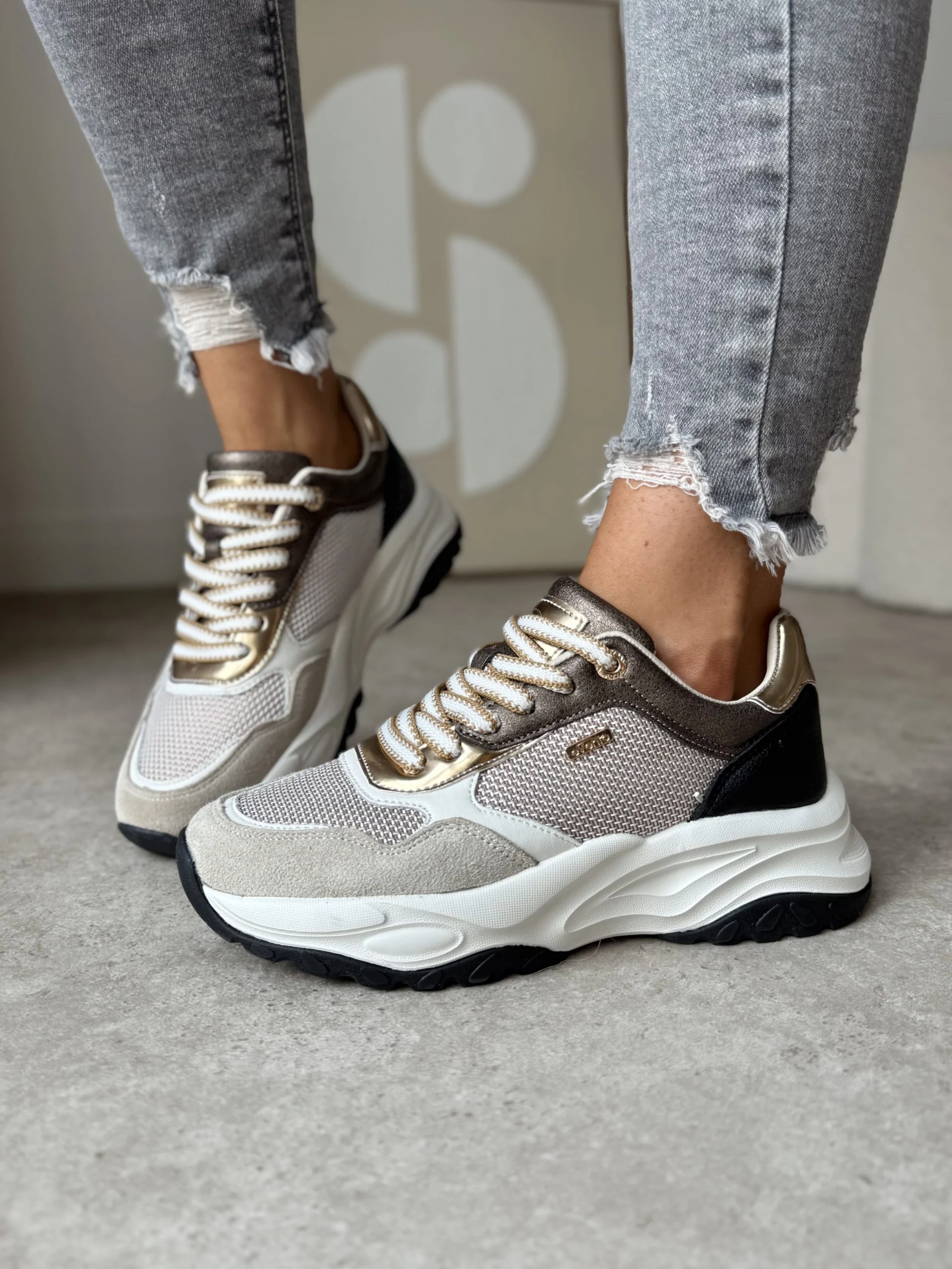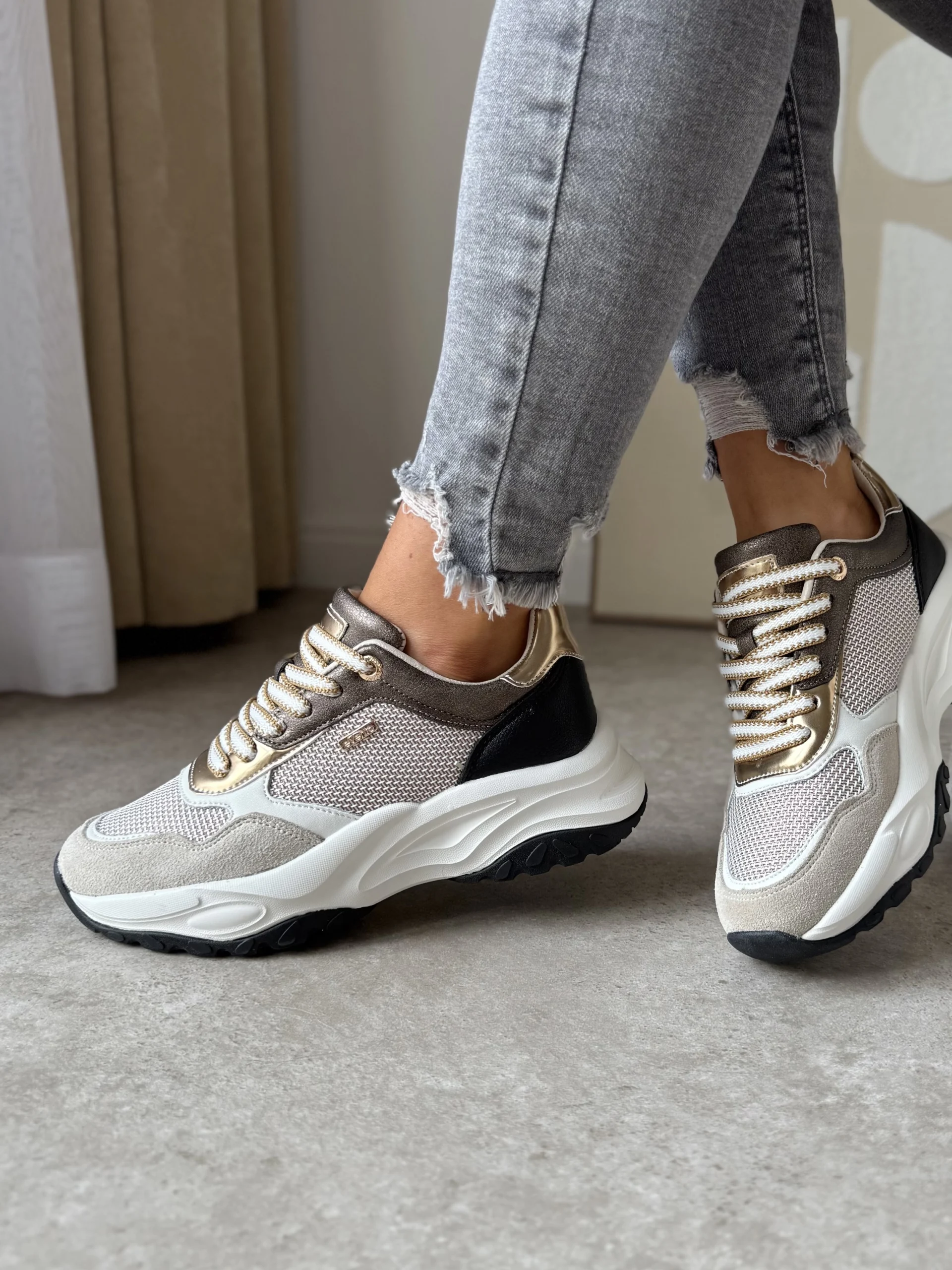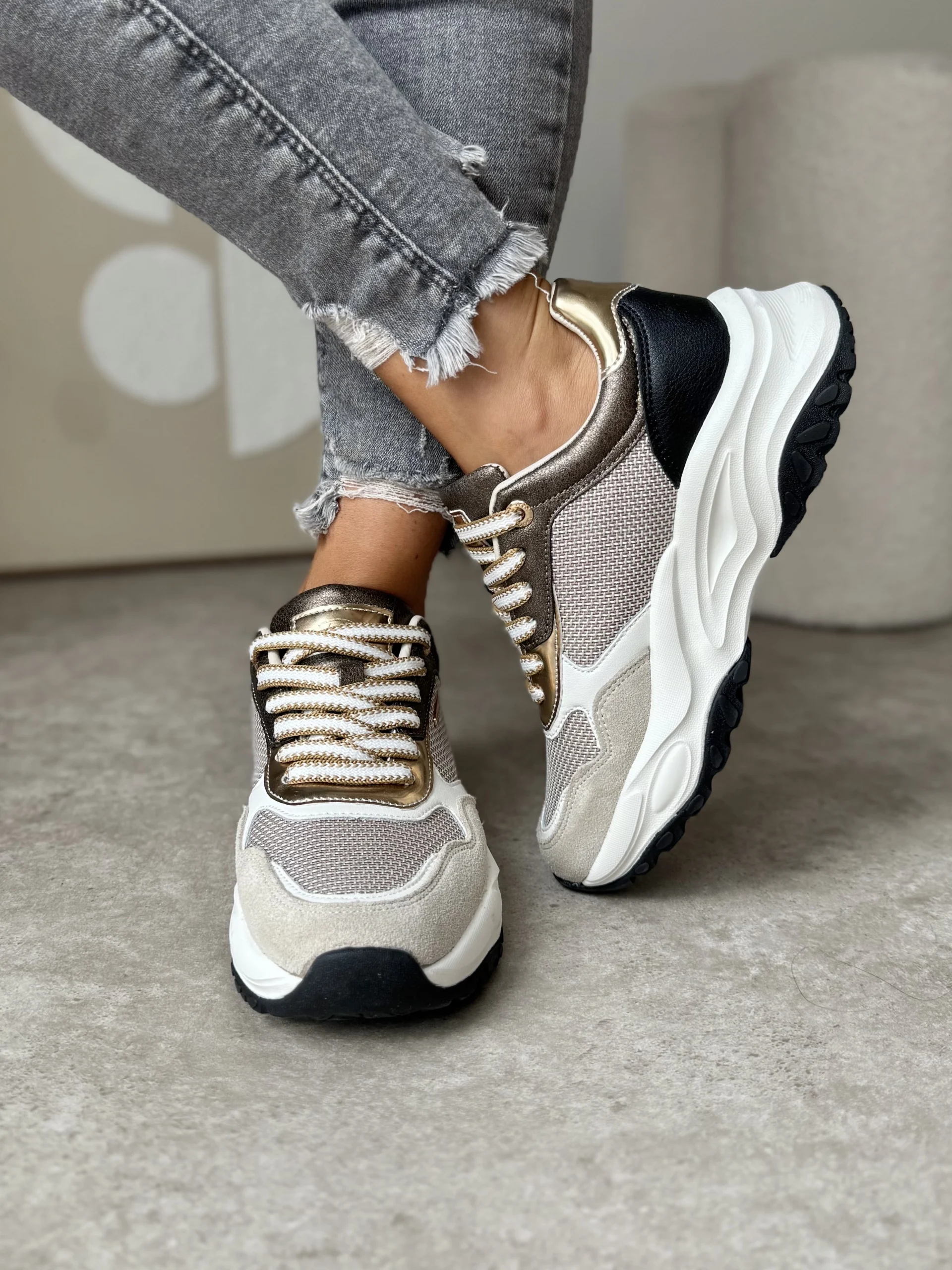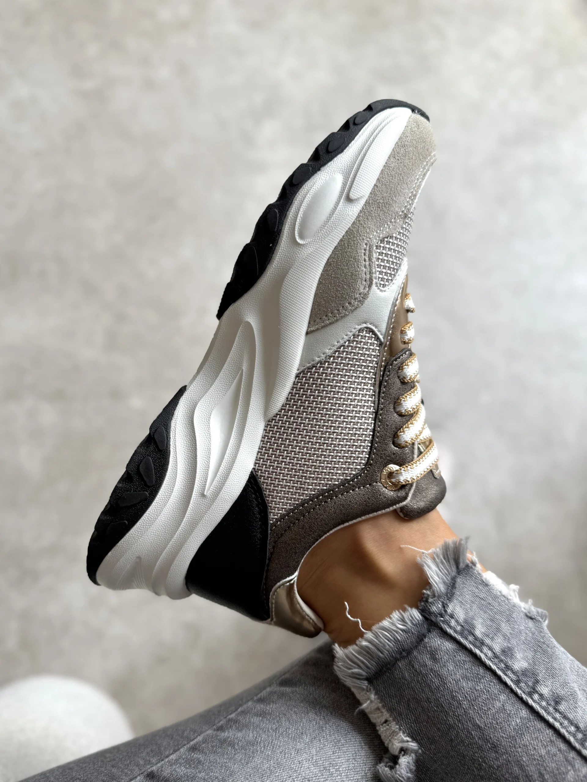 Skórzane adidasy damskie LULA 83 to połączenie modnego wyglądu i maksymalnej wygody. Już na pierwszy rzut oka przyciągają uwagę stylowym zestawieniem kolorów – beżu, złota i czerni. Dzięki temu są niezwykle uniwersalne i pasują do wielu codziennych stylizacji.