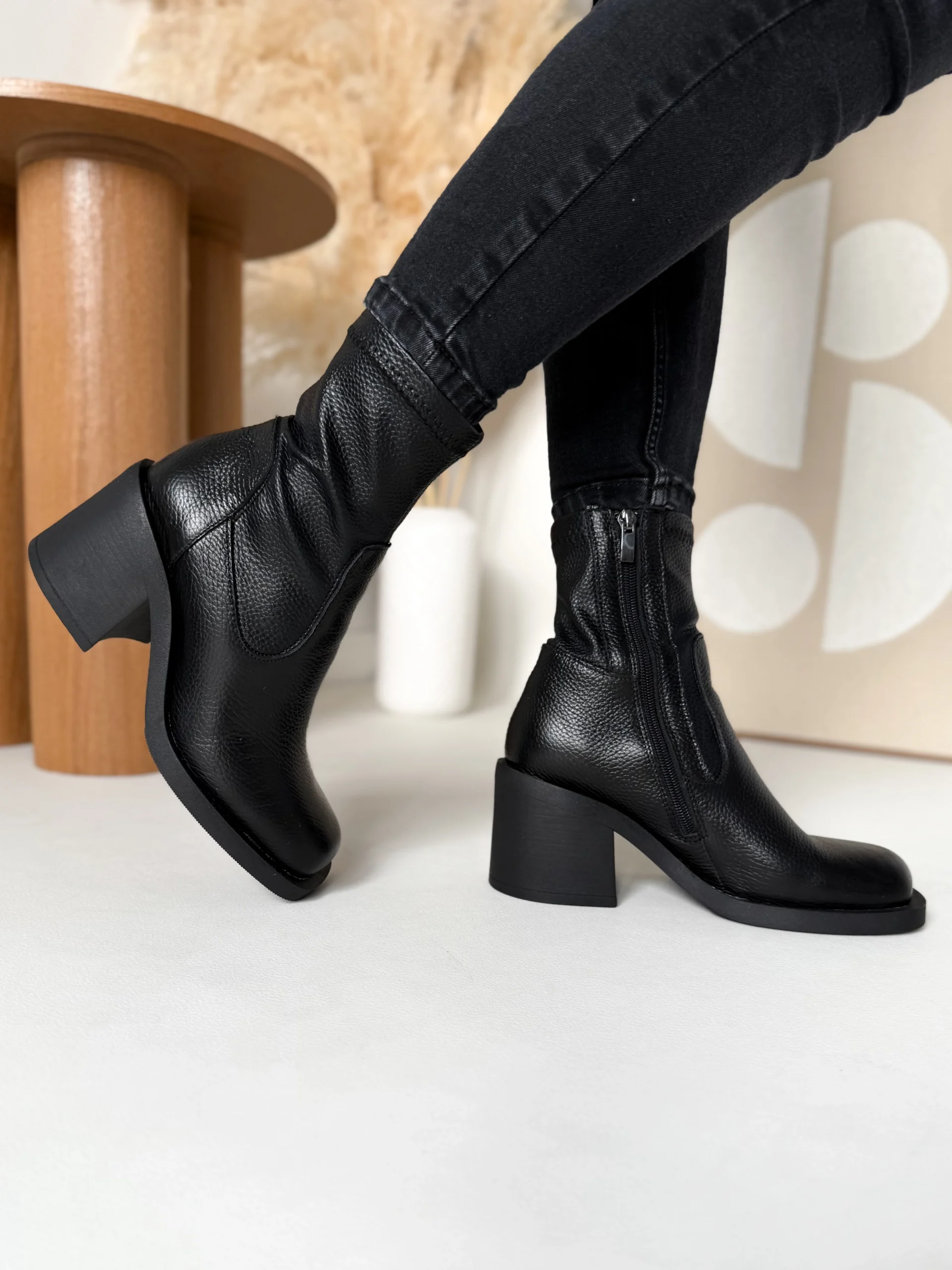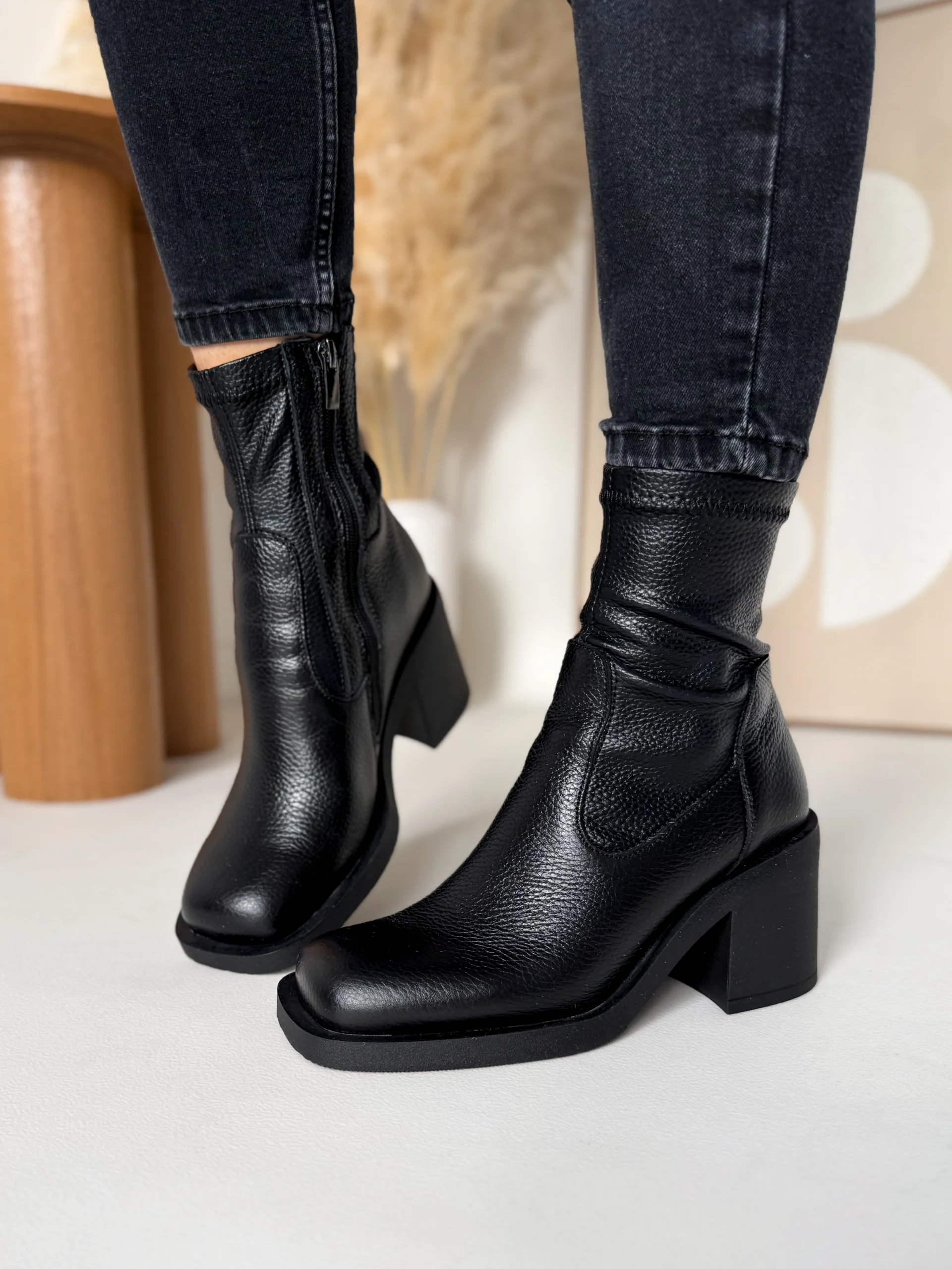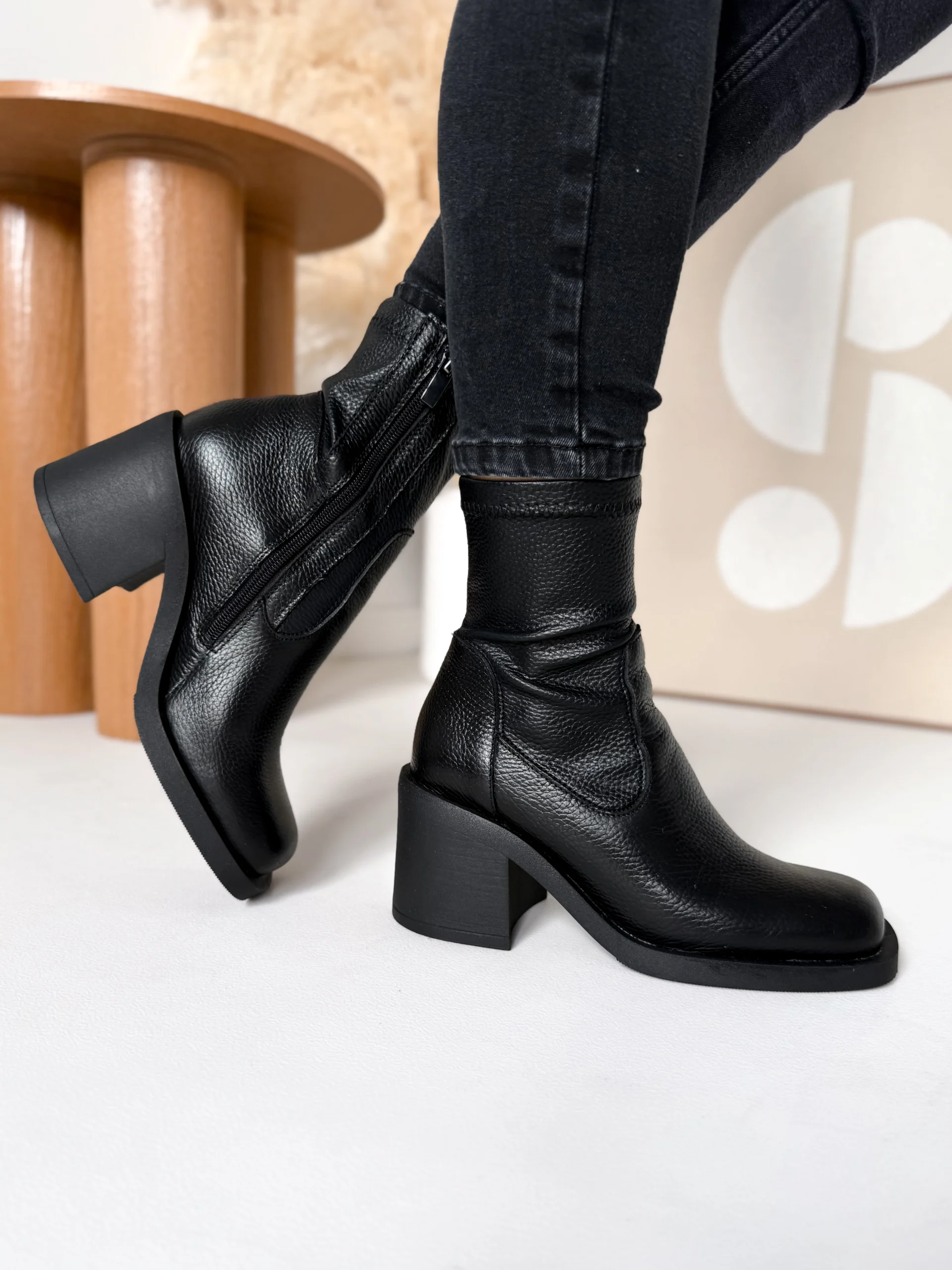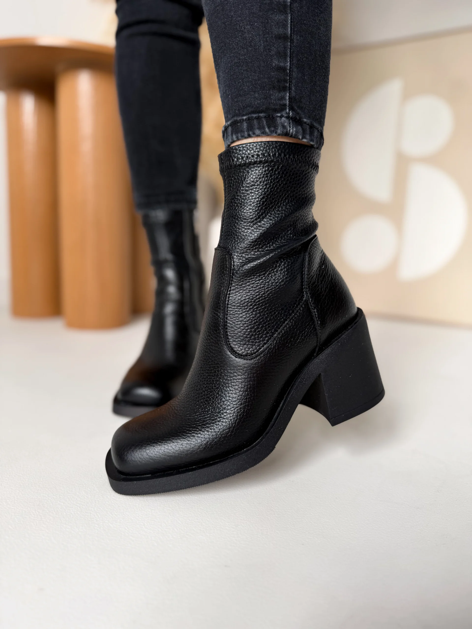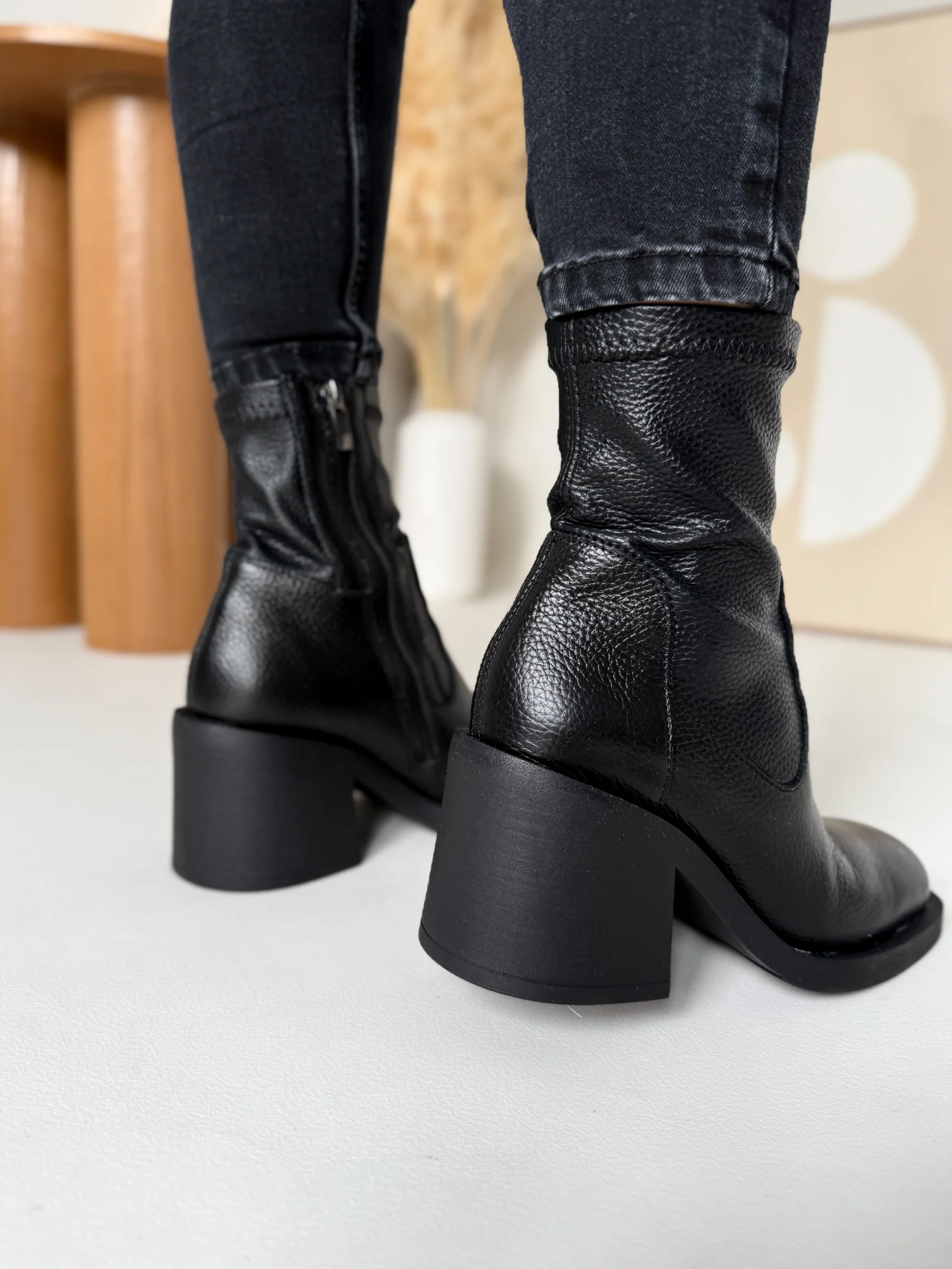 Botki skórzane na obcasie LULA 140 to model niezwykle uniwersalny. Doskonale uzupełni zarówno codzienne stylizacje z jeansami, jak i eleganckie zestawy z sukienką lub płaszczem. Geometryczny nosek dodaje im nowoczesnego charakteru, natomiast delikatny połysk skóry podkreśla ich kobiecy urok. Dzięki klasycznej czerni buty z łatwością dopasujesz do różnych kolorów i fasonów odzieży.