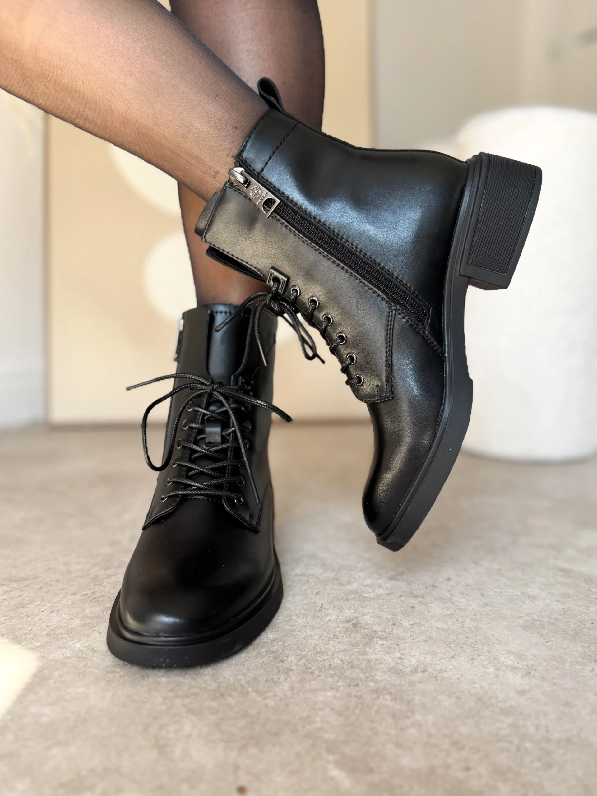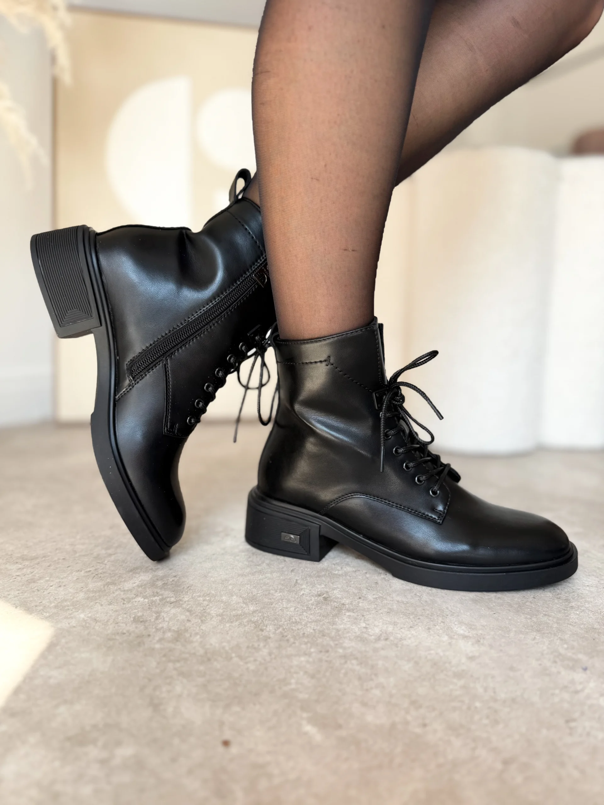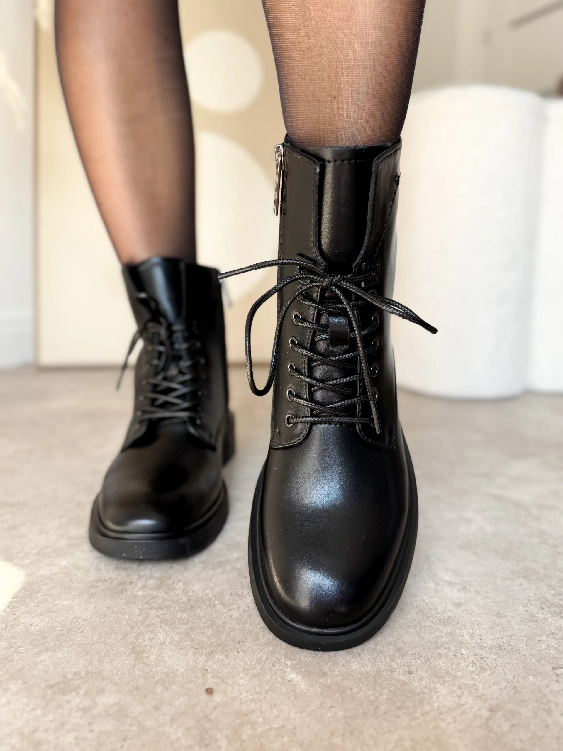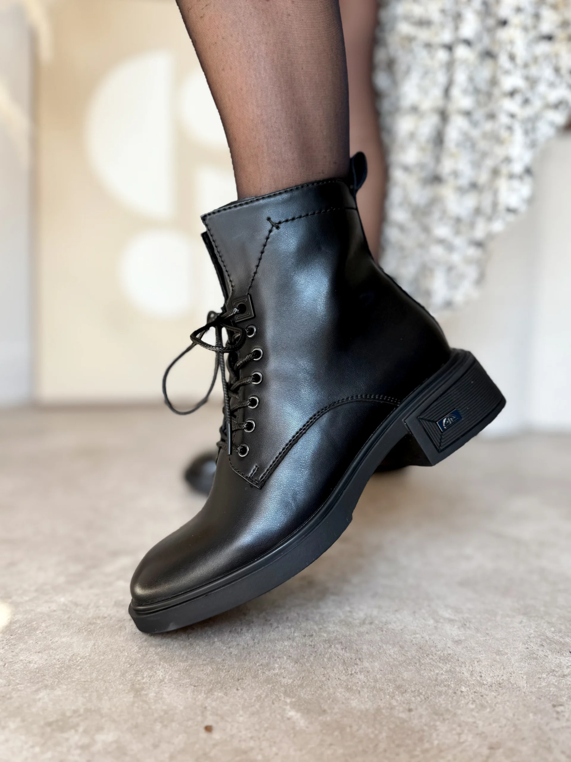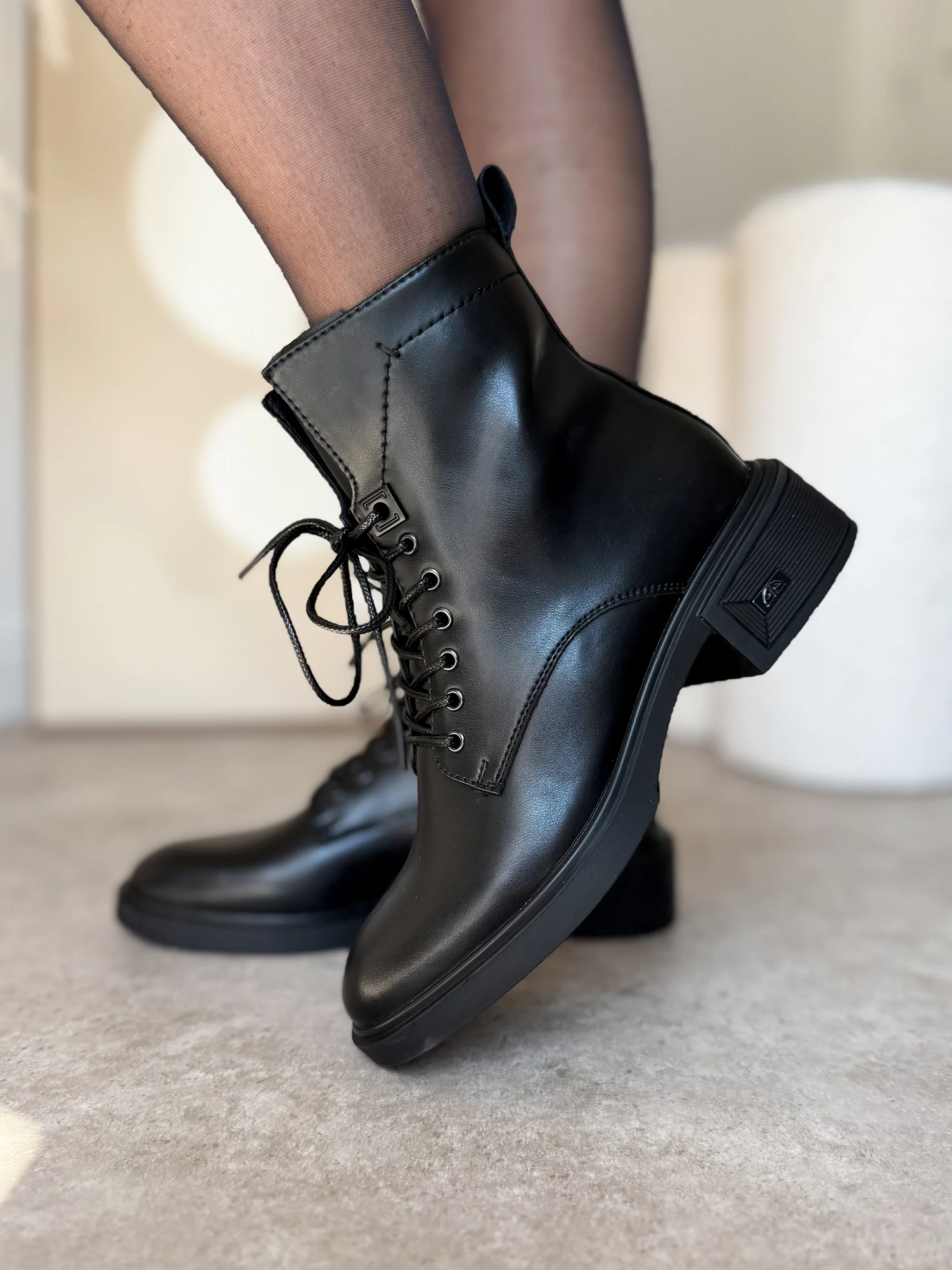 Buty zostały wyposażone w sznurowanie z przodu, które pozwala dopasować obuwie do kształtu stopy. Dodatkowo zamek błyskawiczny z boku sprawia, że zakładanie botków jest szybkie i wygodne. To połączenie funkcjonalności i estetyki, dzięki któremu model LULA 109 zyskuje nowoczesny charakter.