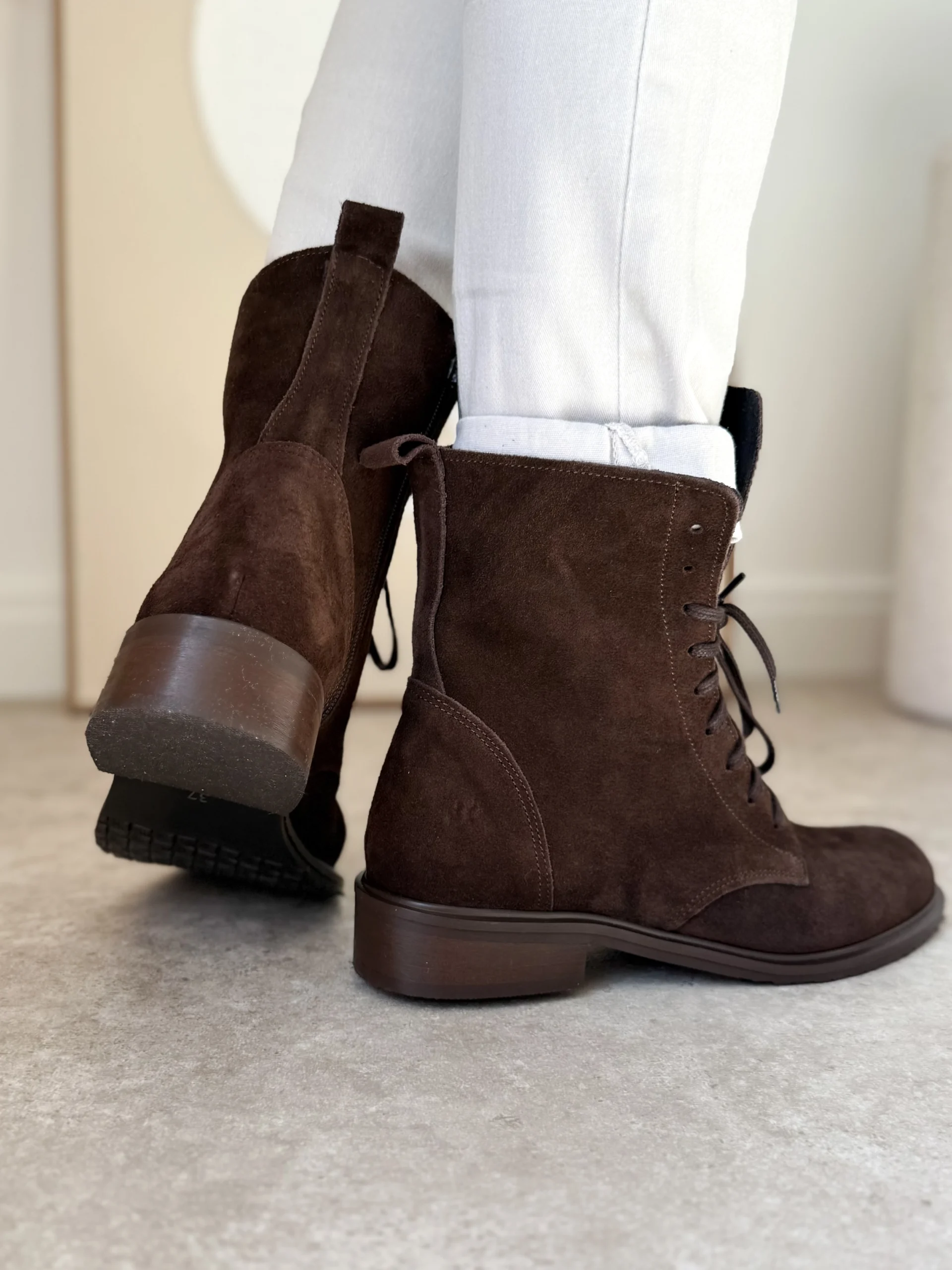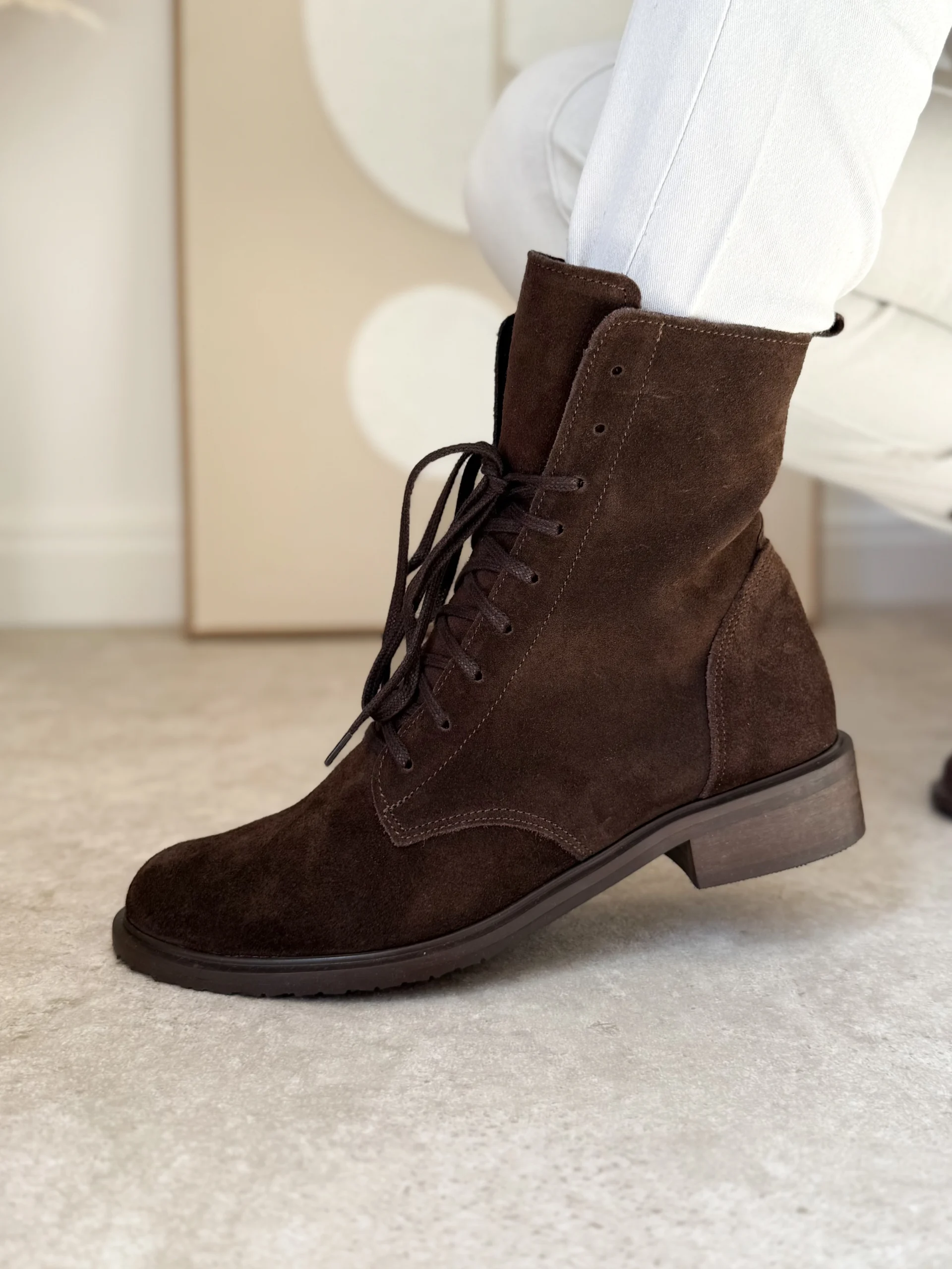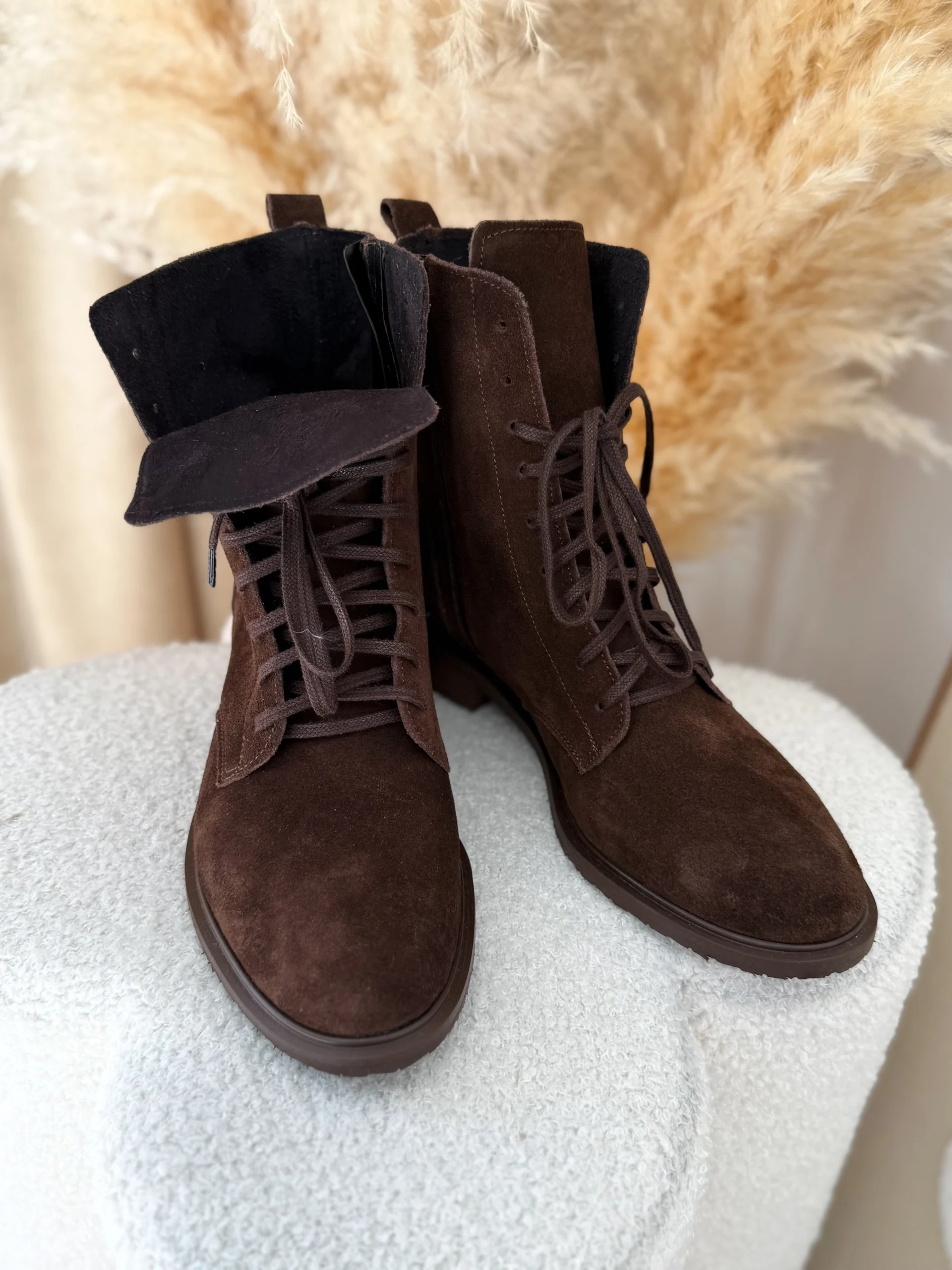 Do produkcji wykorzystano skórę naturalną zamszową w modnym kolorze gorzkiej czekolady. Skóra jest miękka, elastyczna i przyjemna w dotyku, a jednocześnie odporna na codzienne użytkowanie. Wnętrze buta oraz wkładka również zostały wykonane ze skóry naturalnej, co gwarantuje komfort oraz właściwą wentylację. Dzięki temu stopa oddycha, a buty pozostają wygodne nawet podczas wielogodzinnego noszenia.