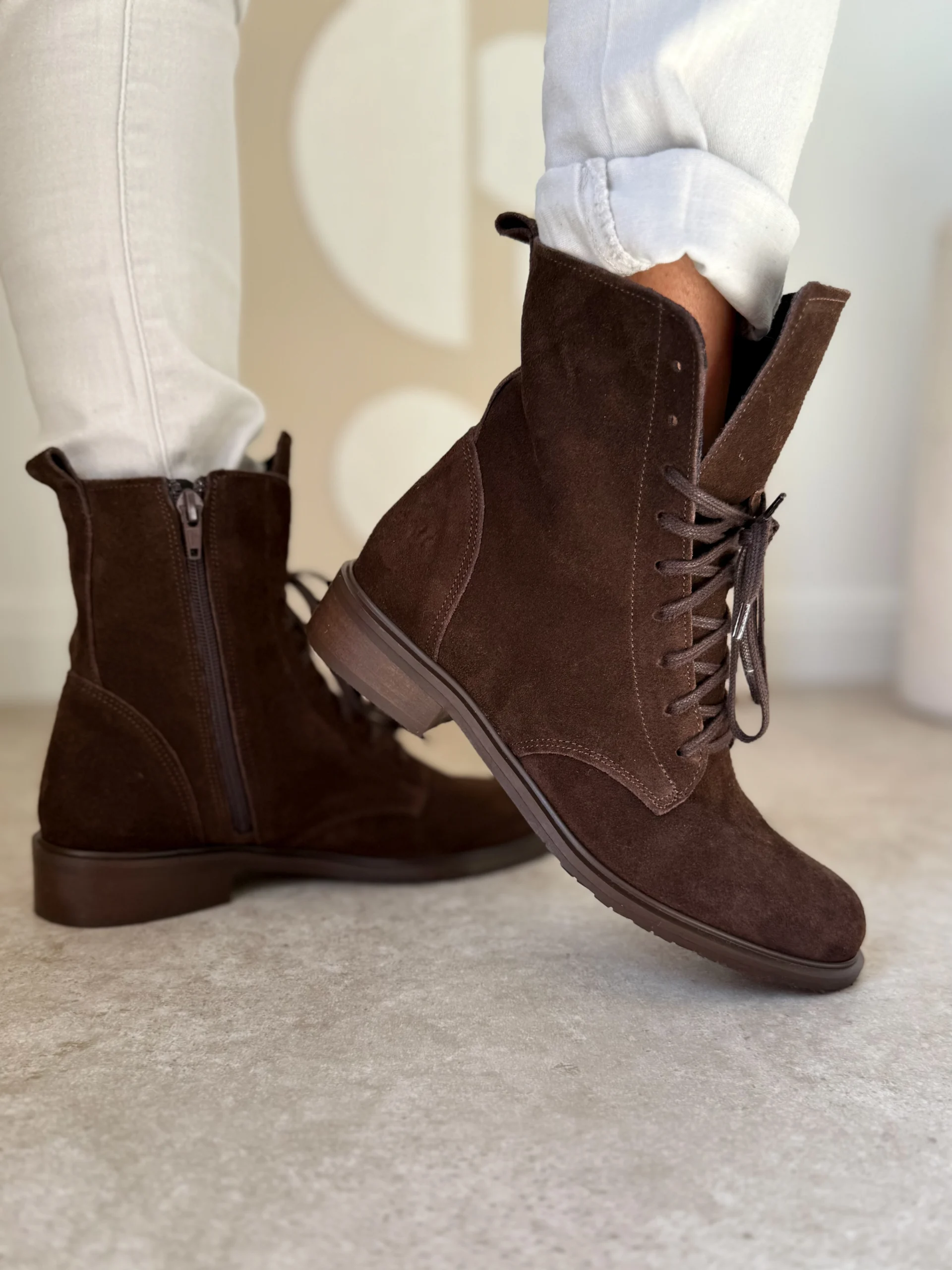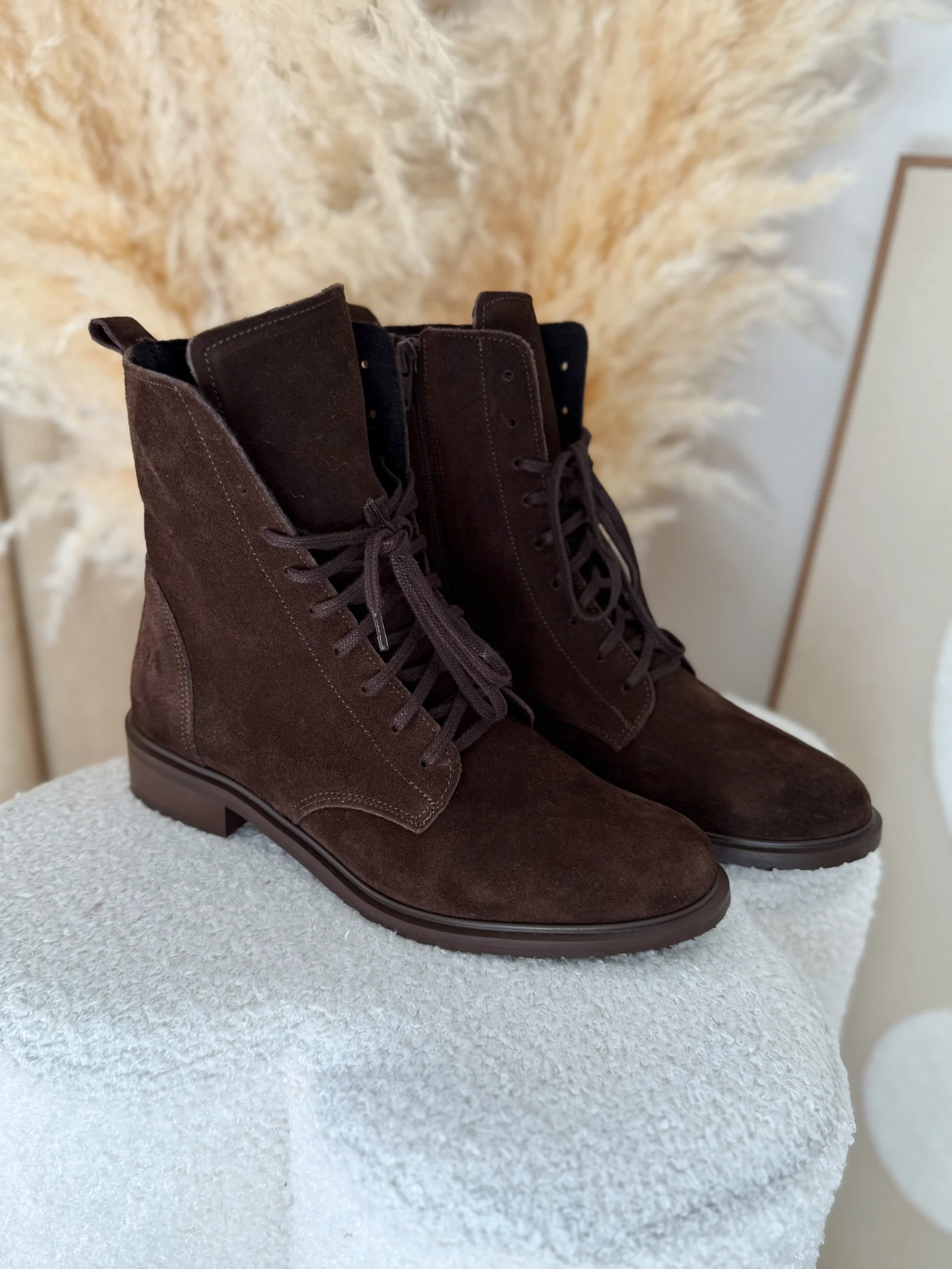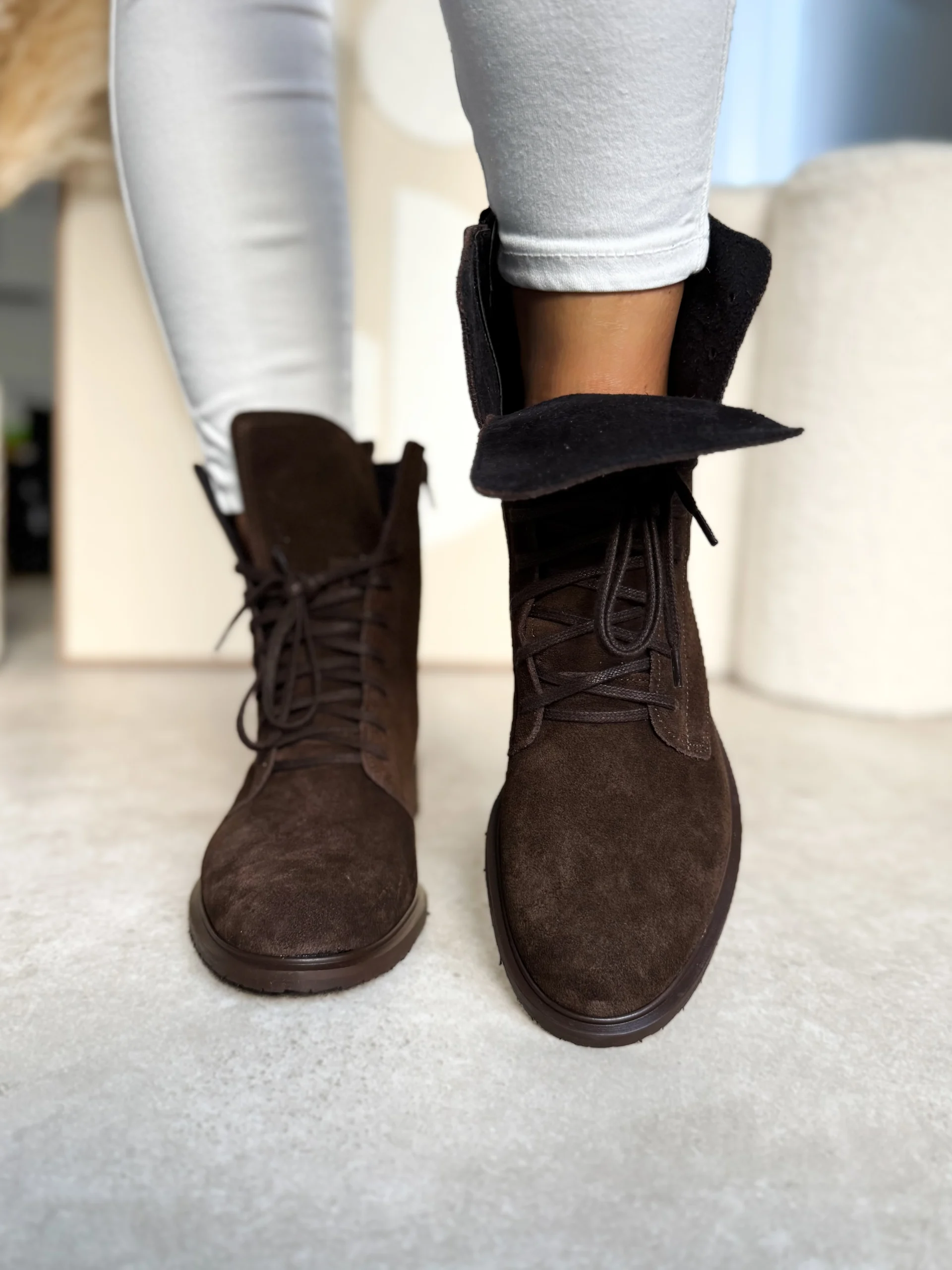 Do produkcji wykorzystano skórę naturalną zamszową w modnym kolorze gorzkiej czekolady. Skóra jest miękka, elastyczna i przyjemna w dotyku, a jednocześnie odporna na codzienne użytkowanie. Wnętrze buta oraz wkładka również zostały wykonane ze skóry naturalnej, co gwarantuje komfort oraz właściwą wentylację. Dzięki temu stopa oddycha, a buty pozostają wygodne nawet podczas wielogodzinnego noszenia.