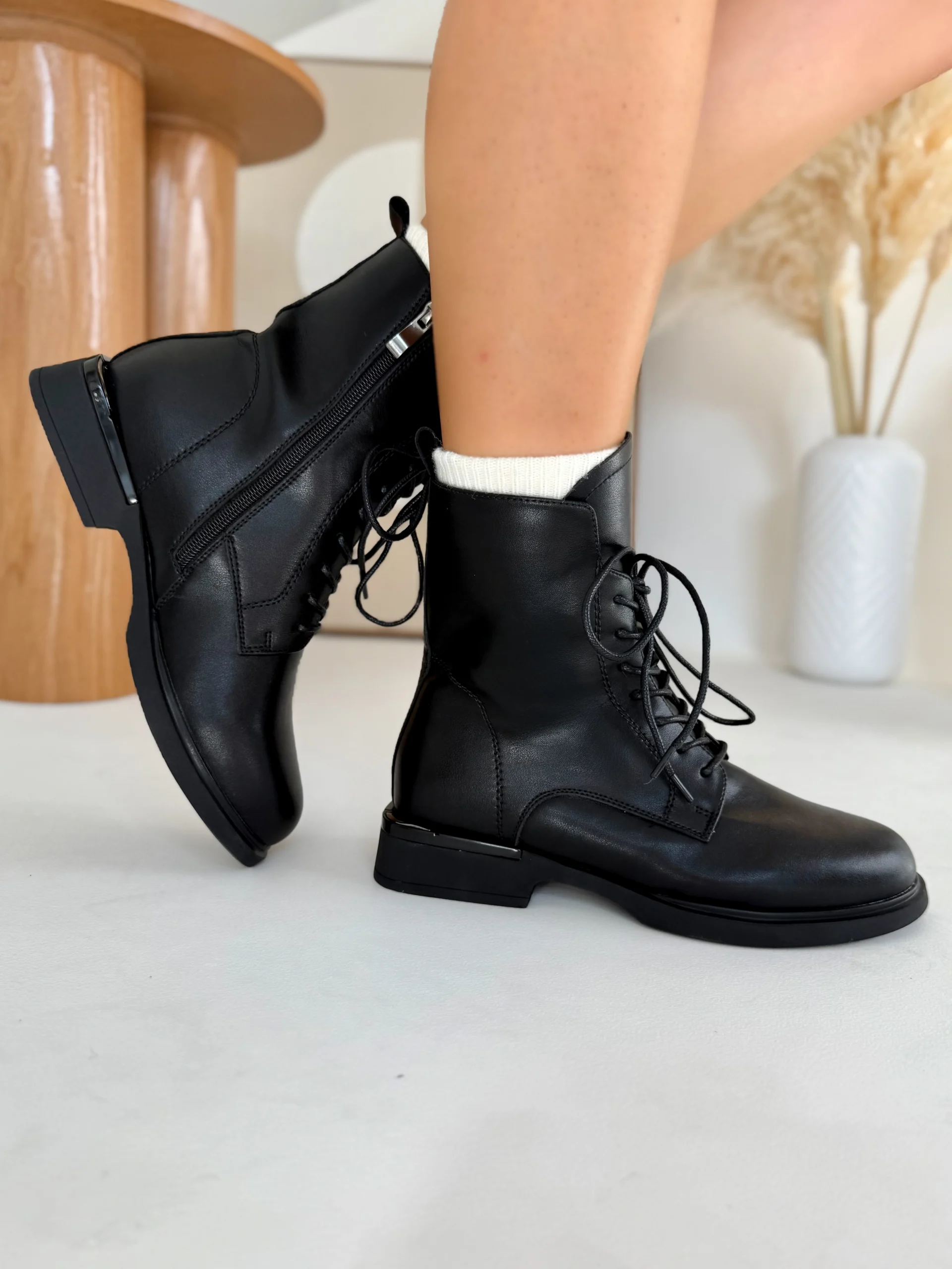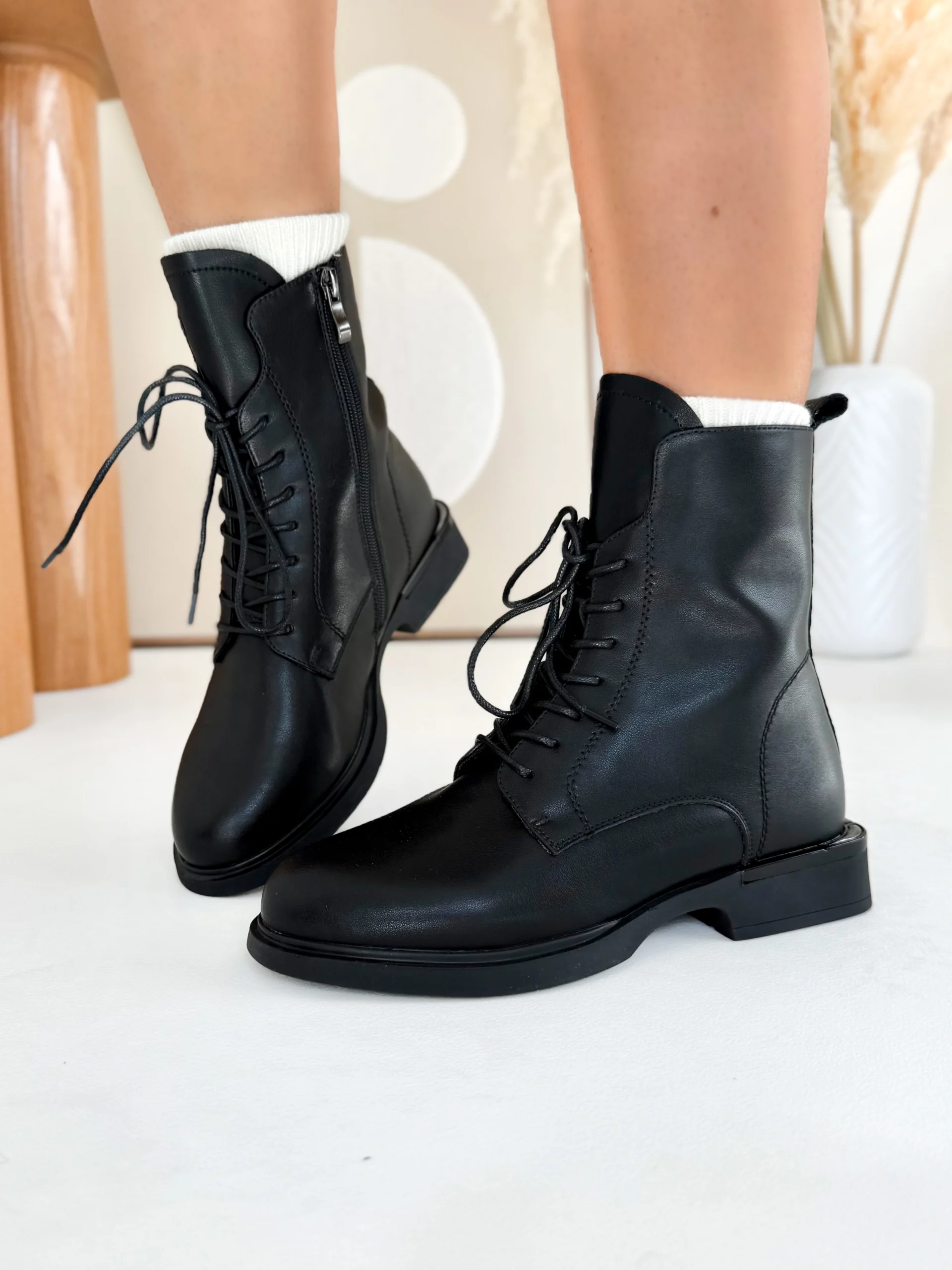 Botki posiadają zamek z boku oraz sznurowanie z przodu, co umożliwia idealne dopasowanie do stopy. Dzięki temu zakładanie i zdejmowanie butów jest szybkie i wygodne. Wewnątrz znajduje się miękkie ocieplenie futerkiem, które zapewnia komfort cieplny w chłodne dni. Co więcej, delikatna wyściółka sprawia, że buty są przyjemne w noszeniu nawet przez wiele godzin.