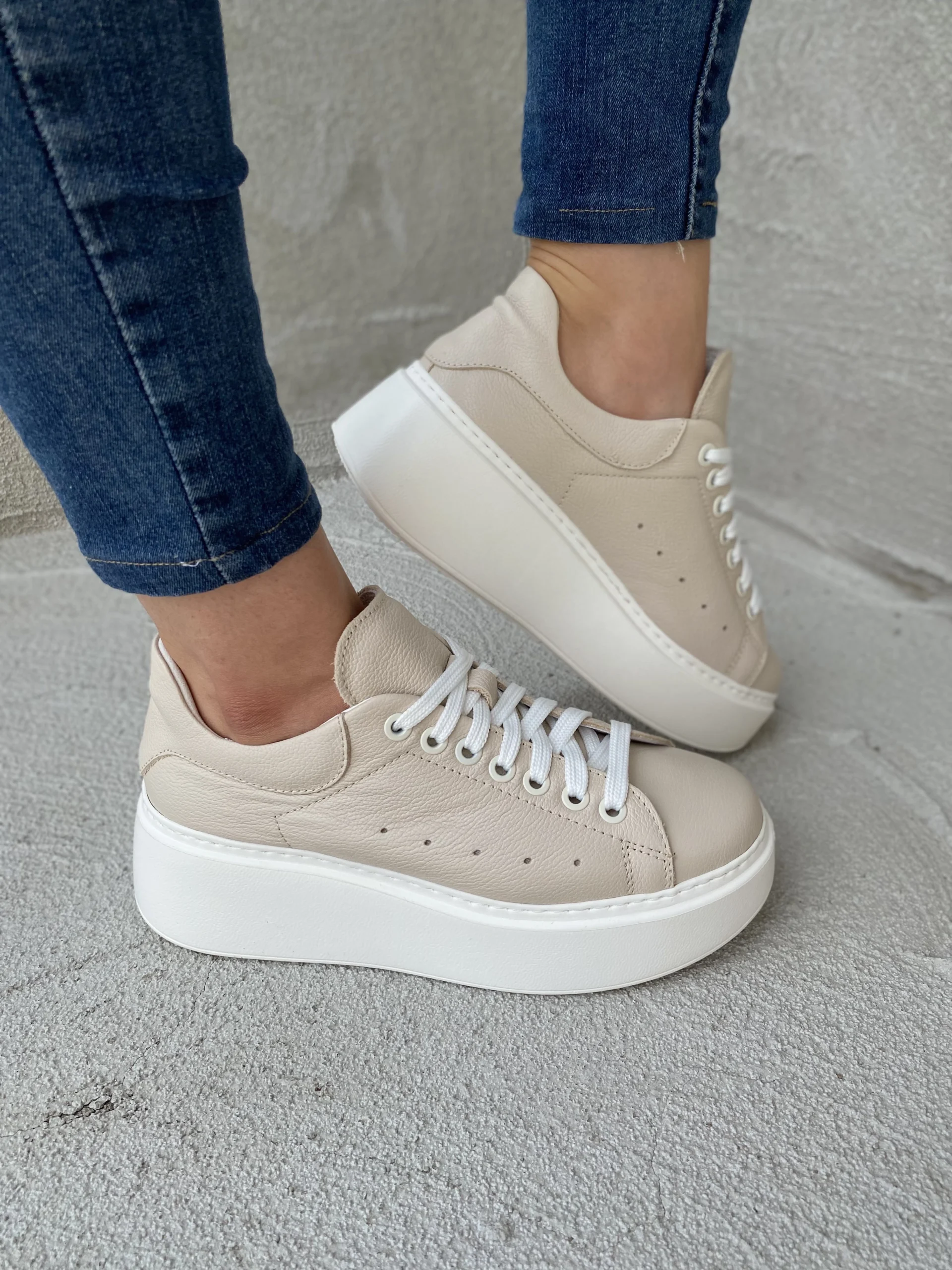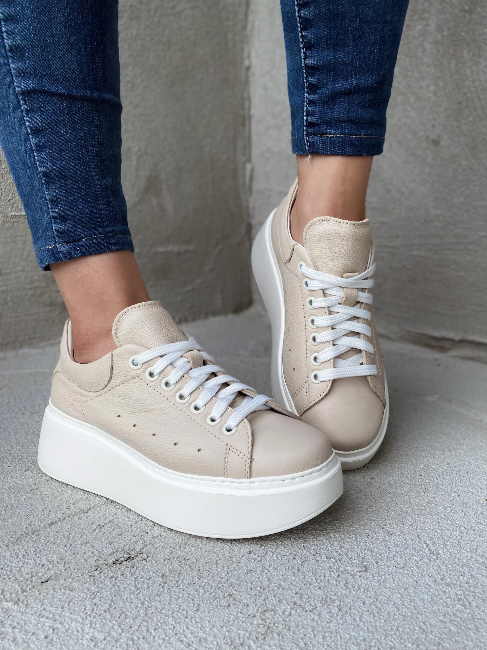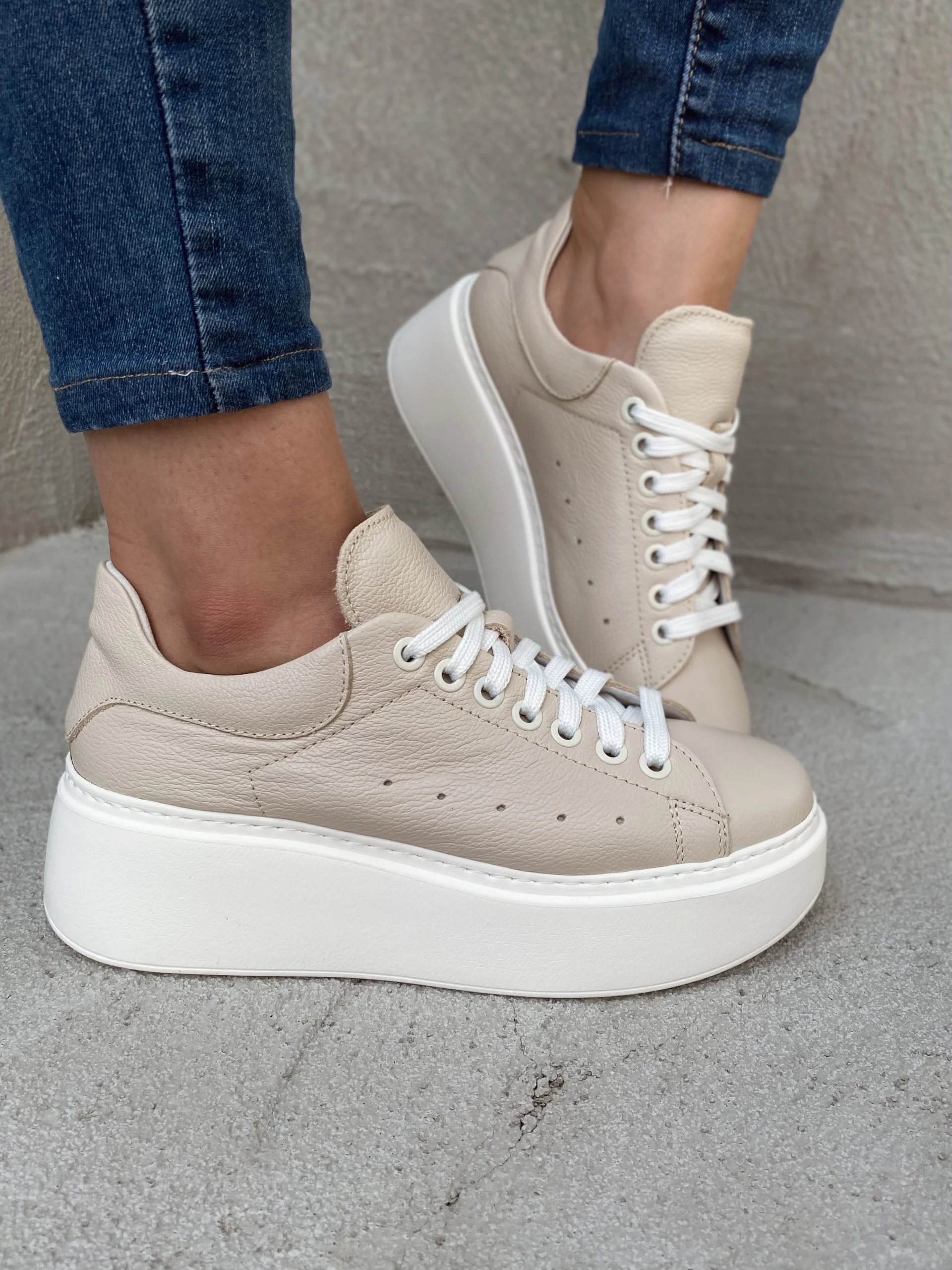 Sneakersy na wyższej podeszwie wykonane w Polsce z najwyższej jakości skóry naturalnej w kolorze modnego beige. Zapewnią Ci nie tylko wysoki komfort chodzenia , ale również będą świetnym dodatkiem do Twoich stylizacji.