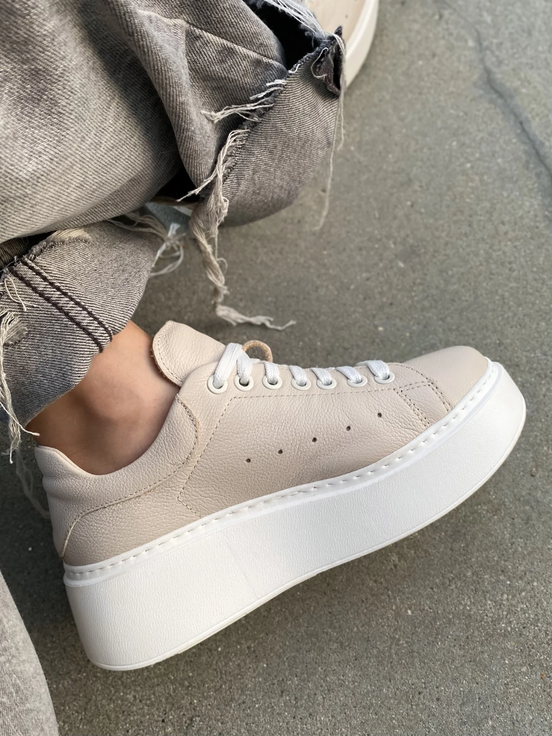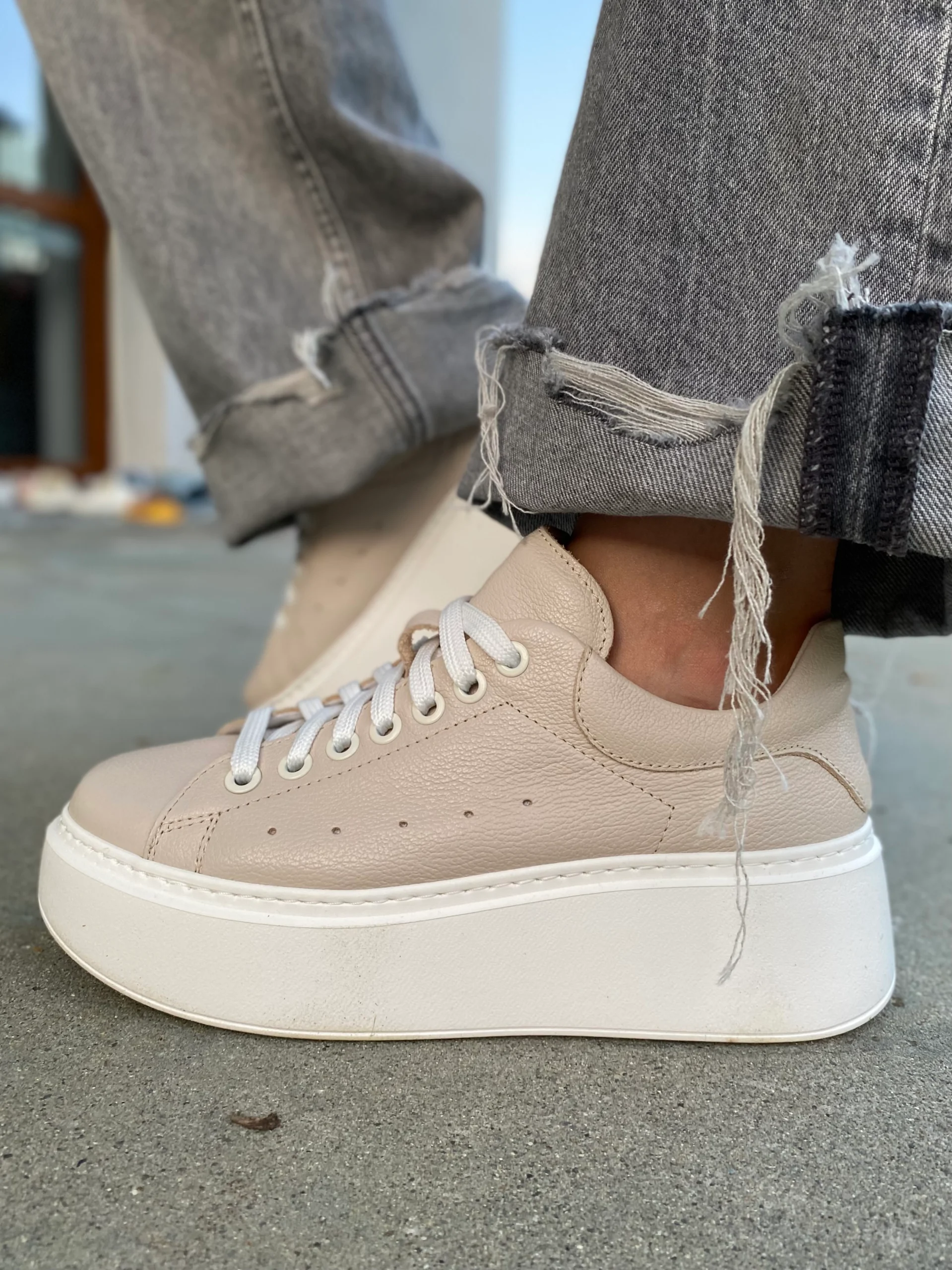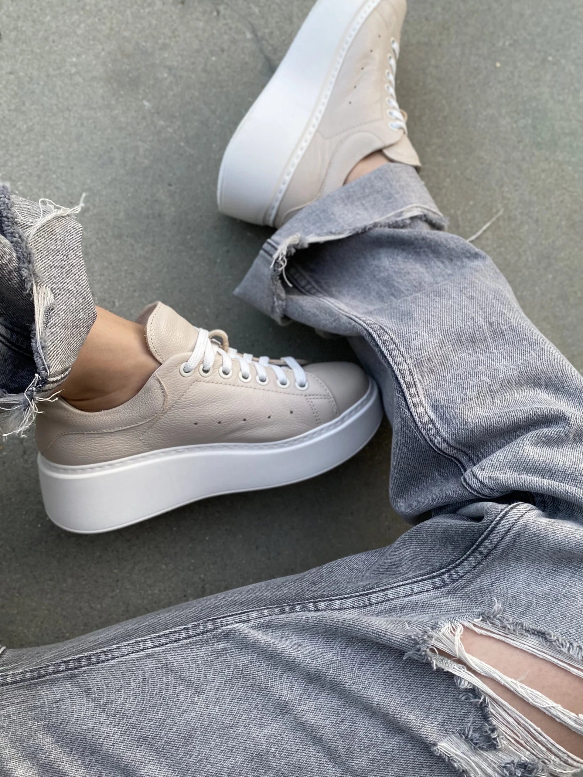 Sneakersy na wyższej podeszwie wykonane w Polsce z najwyższej jakości skóry naturalnej w kolorze modnego beige. Zapewnią Ci nie tylko wysoki komfort chodzenia , ale również będą świetnym dodatkiem do Twoich stylizacji.