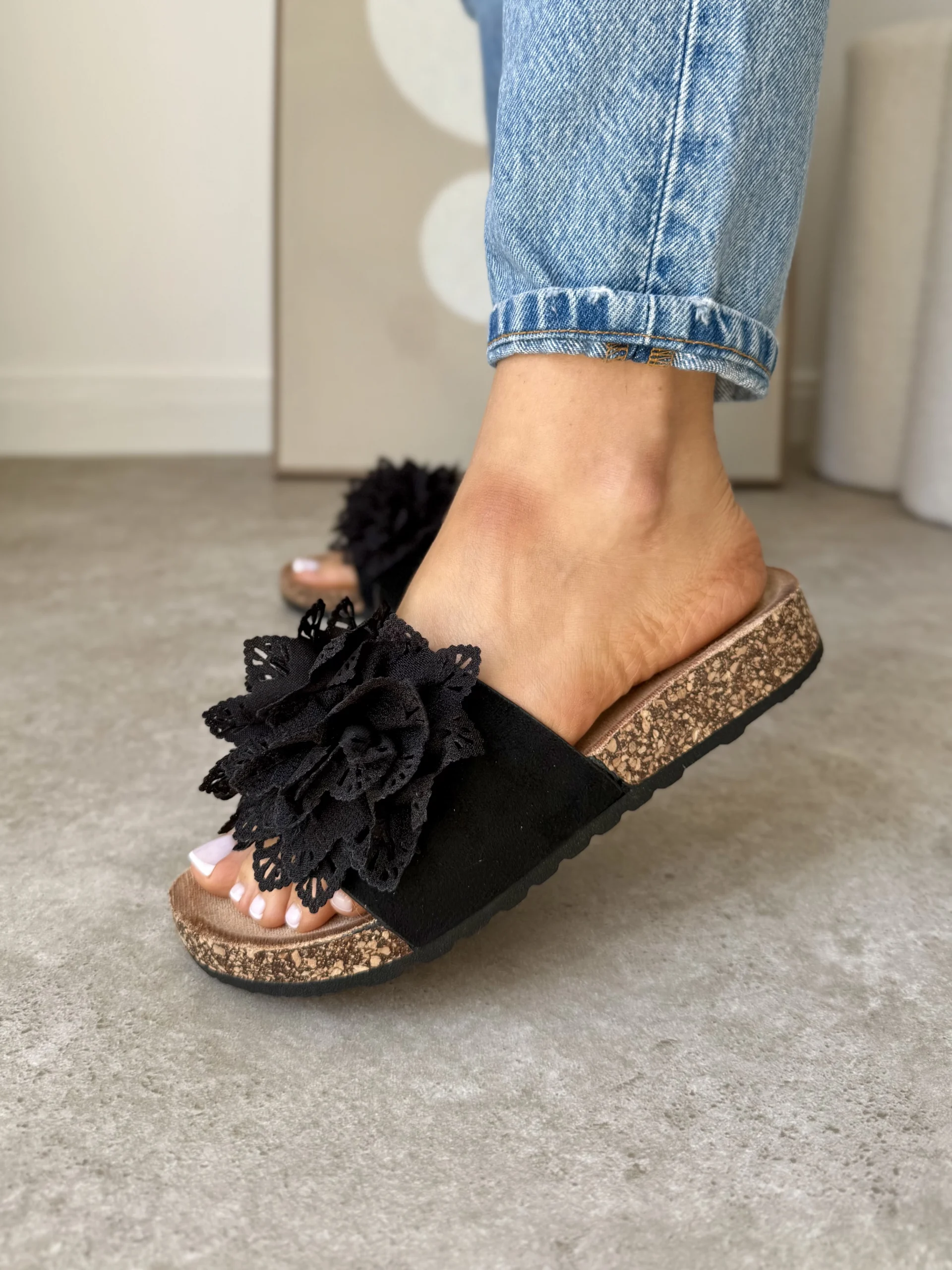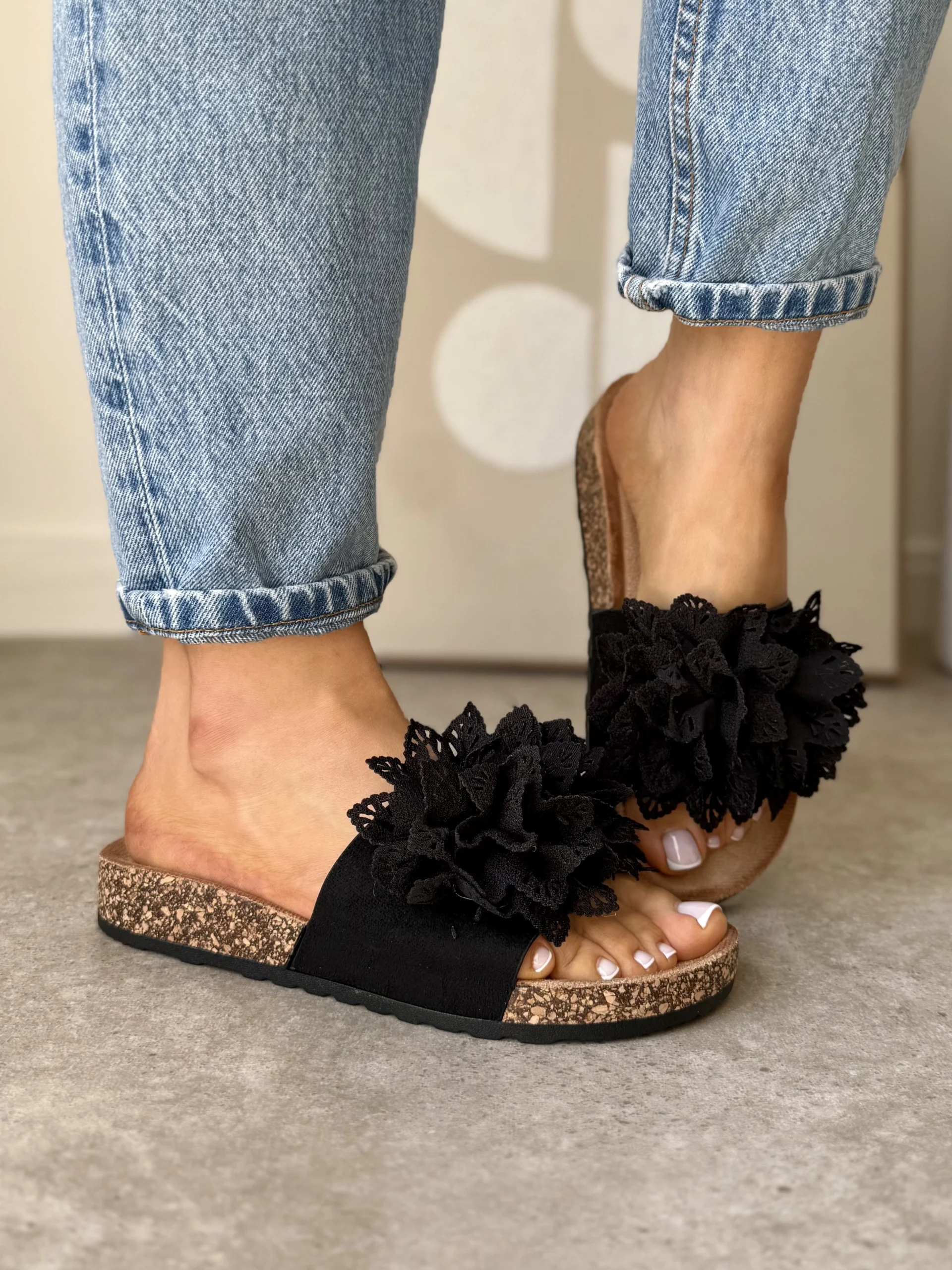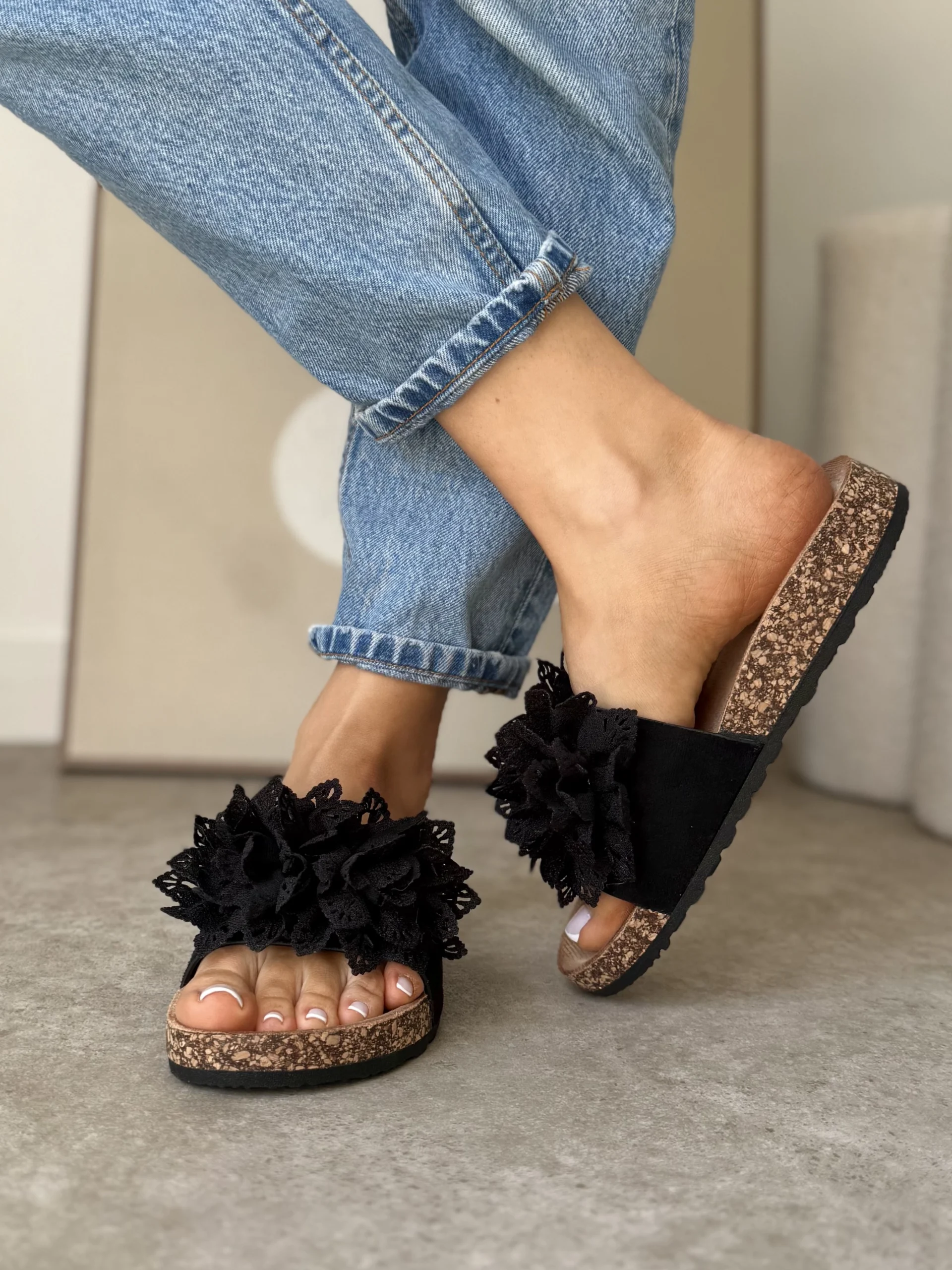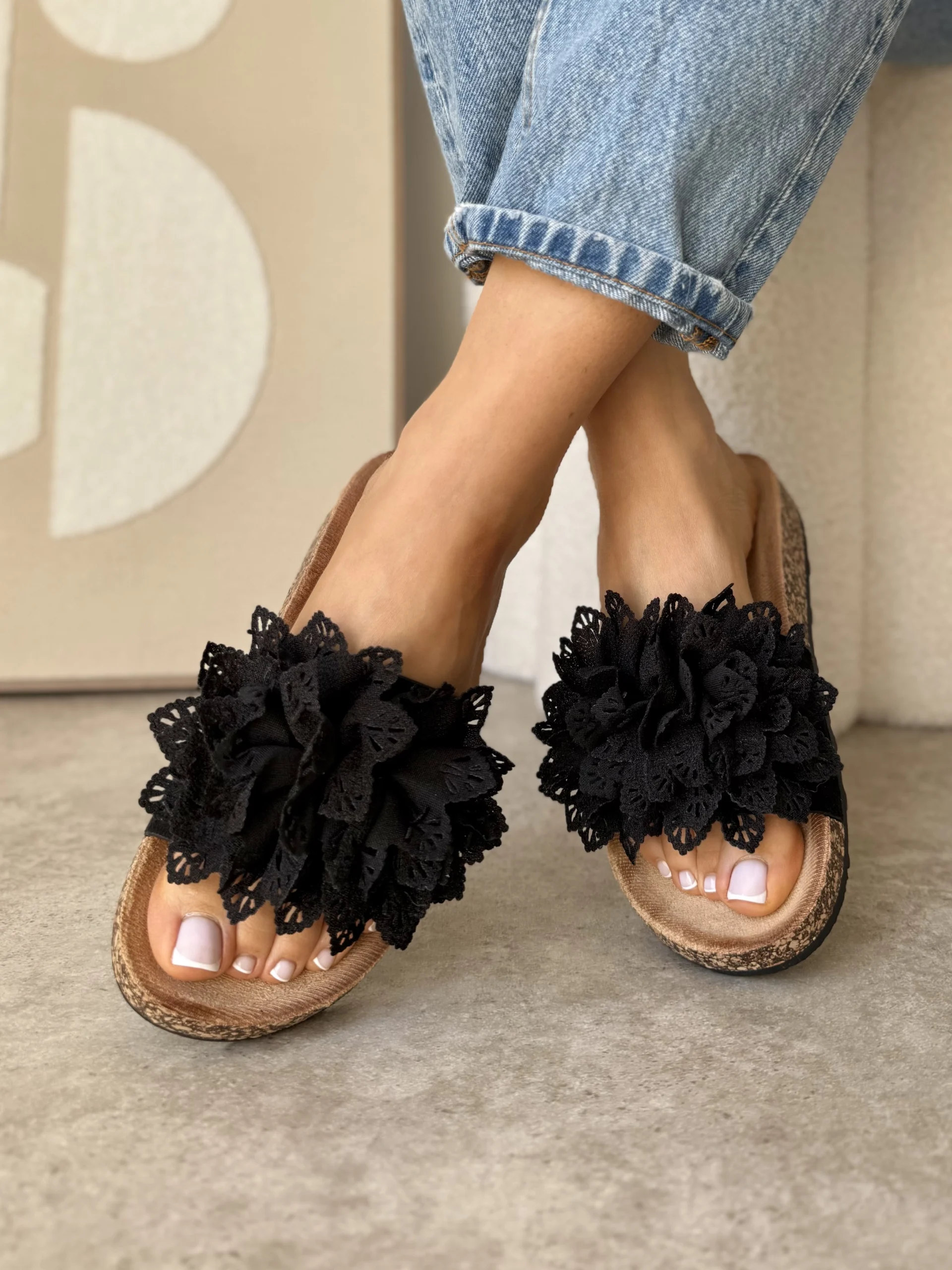 Szukasz wygodnych i stylowych butów na lato? Czarne klapki z kwiatem LULA 87 będą strzałem w dziesiątkę! To modny model, który wyróżni Twoją stylizację, a jednocześnie zapewni komfort przez cały dzień.