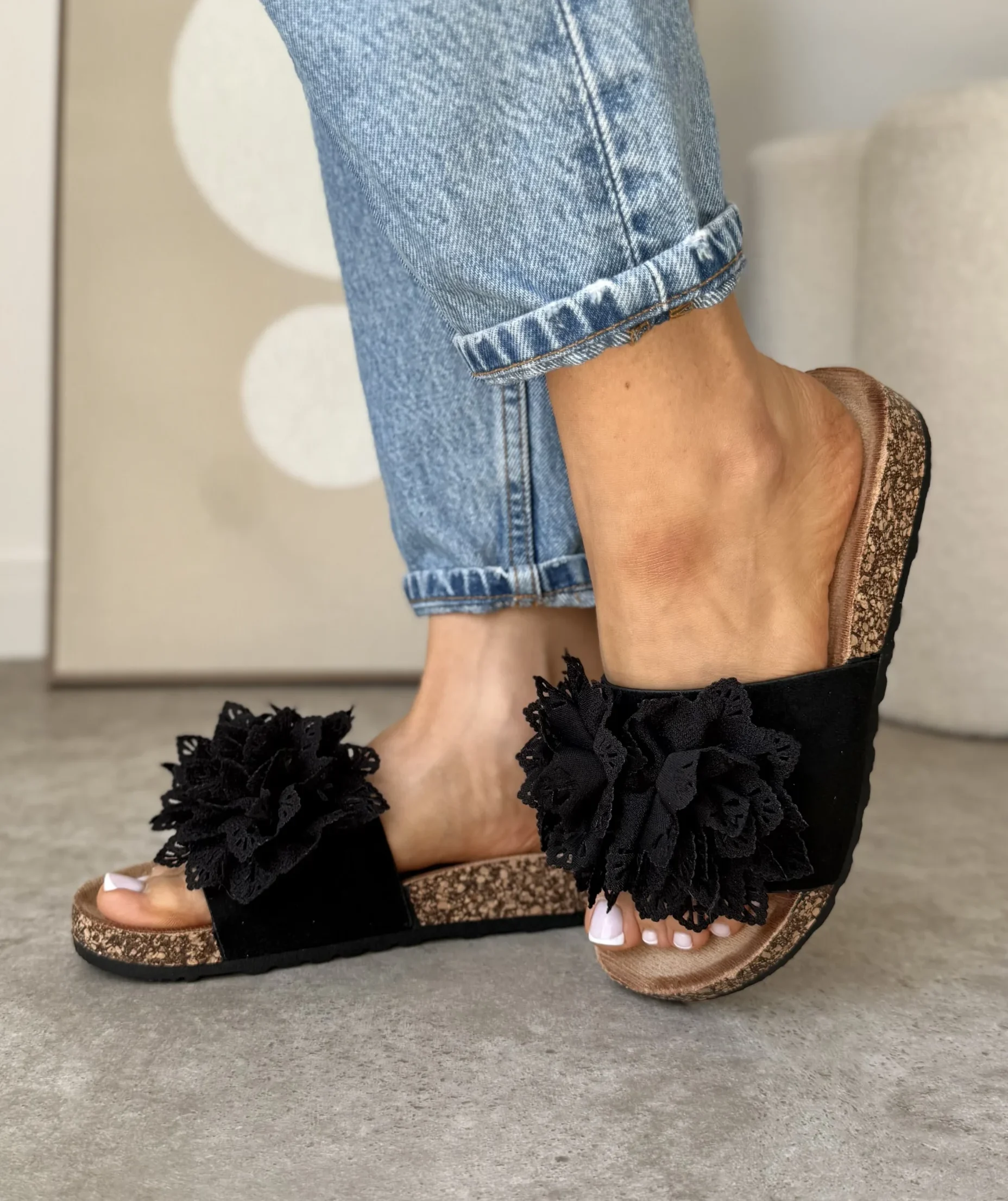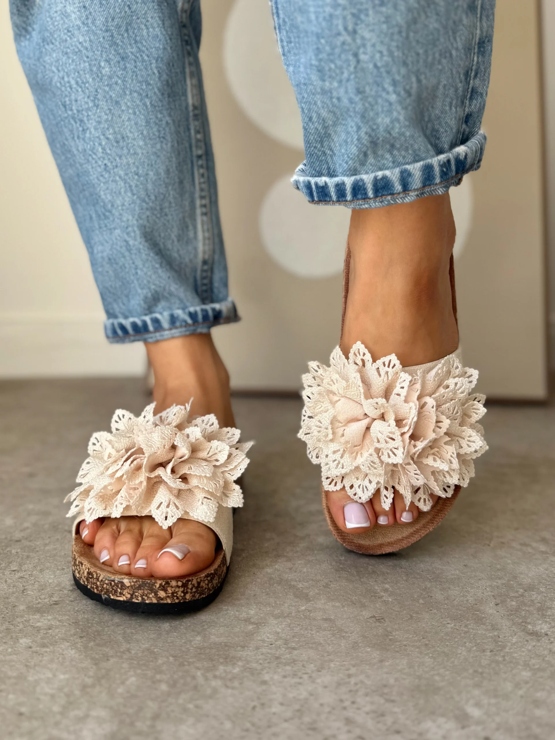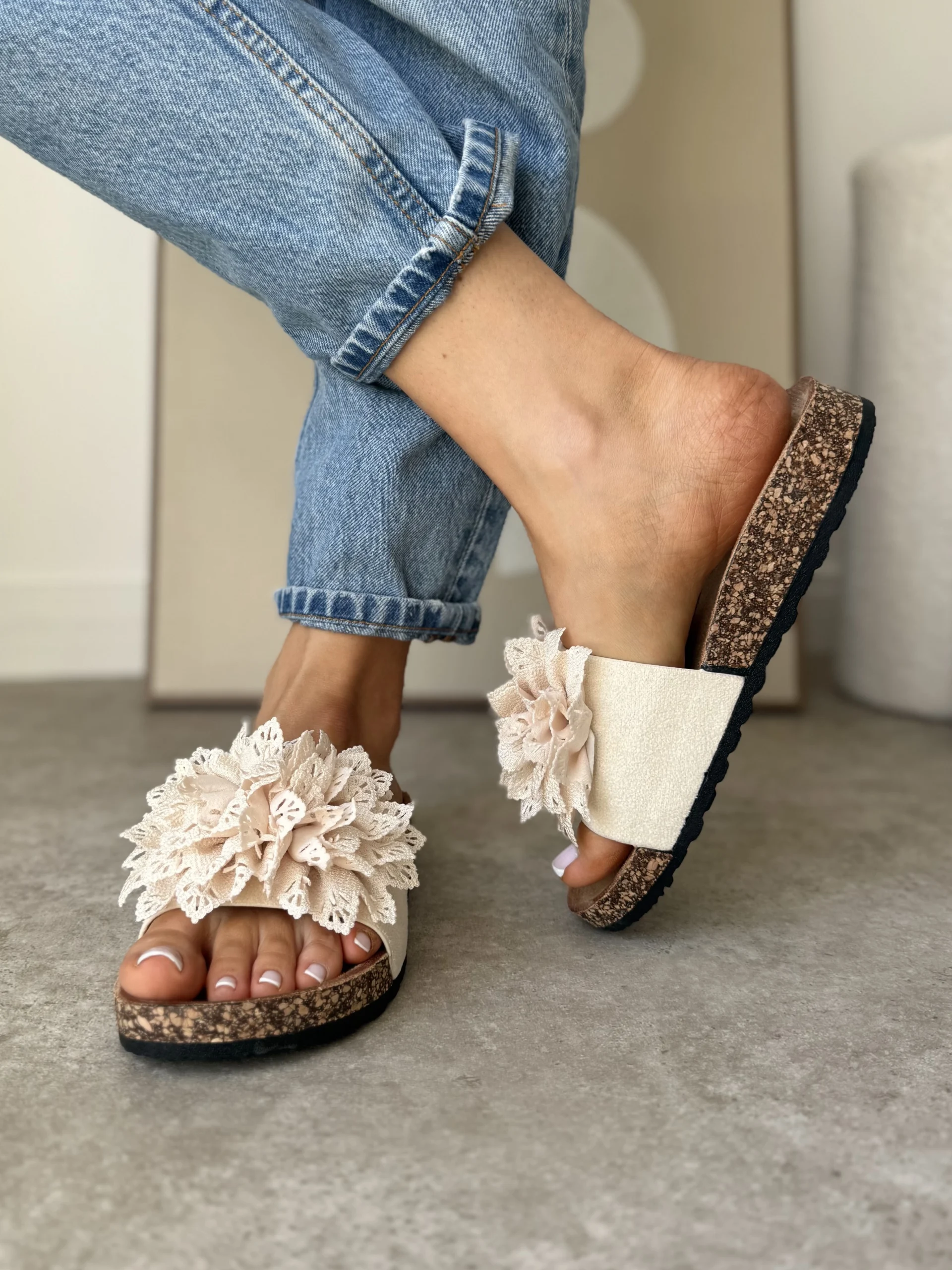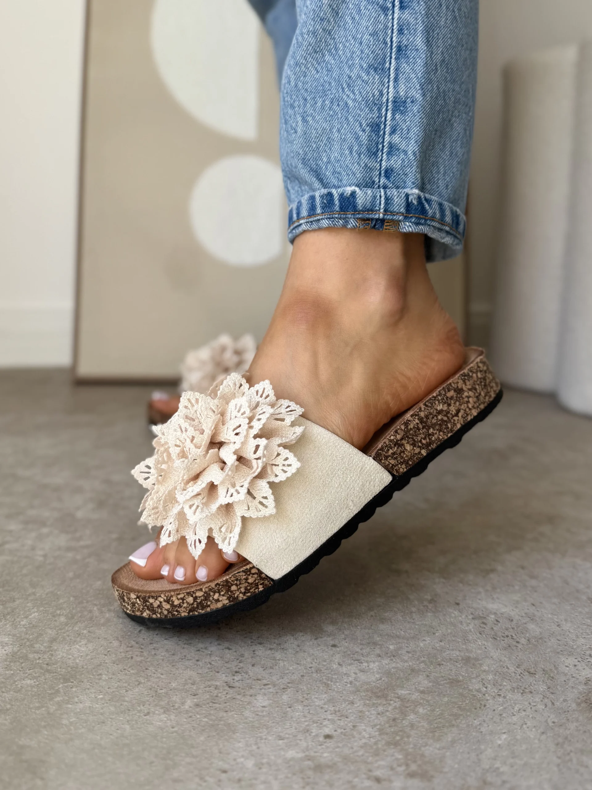 Projektanci postawili na subtelne, ale efektowne detale. Główną ozdobą klapek jest duży kwiat z koronki, umieszczony na szerokim pasku z eko zamszu. Dzięki temu buty przyciągają uwagę i dodają uroku każdej letniej stylizacji. Beżowe klapki z kwiatem idealnie pasują do sukienek, spódnic, a nawet jeansów.