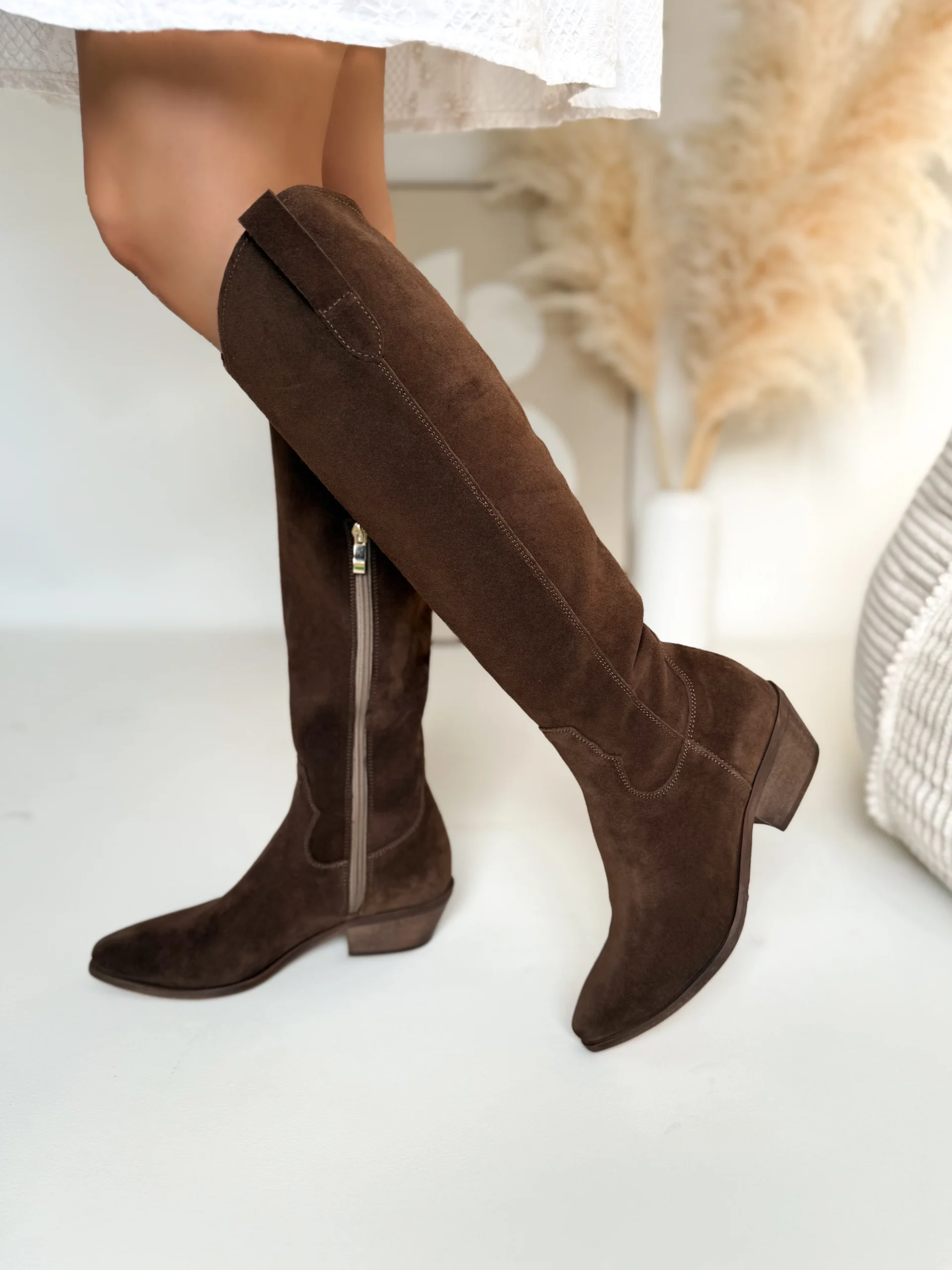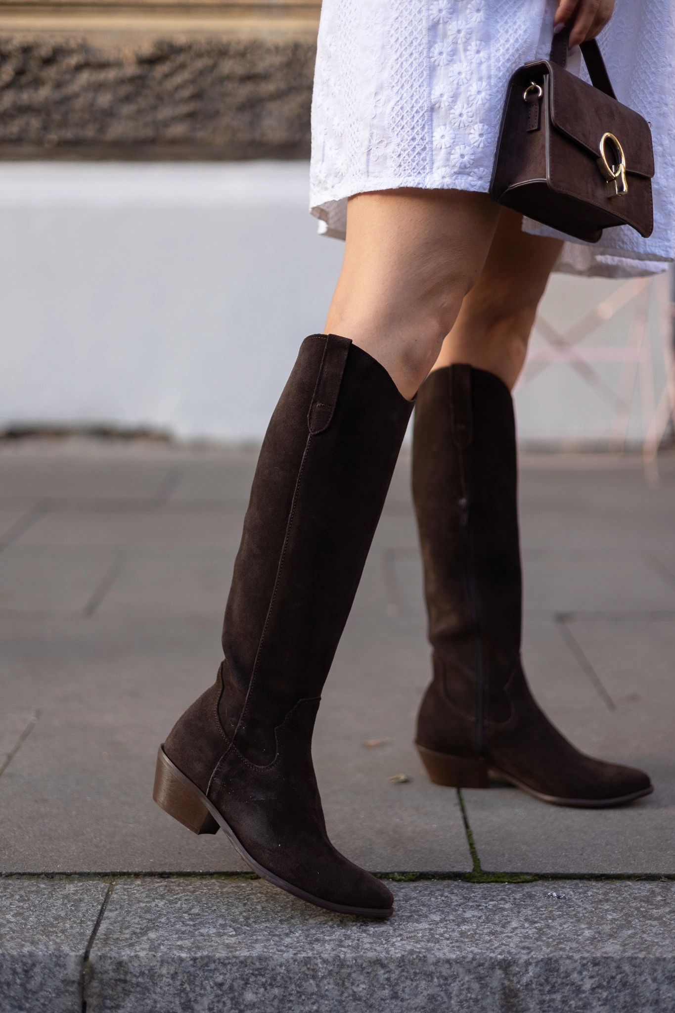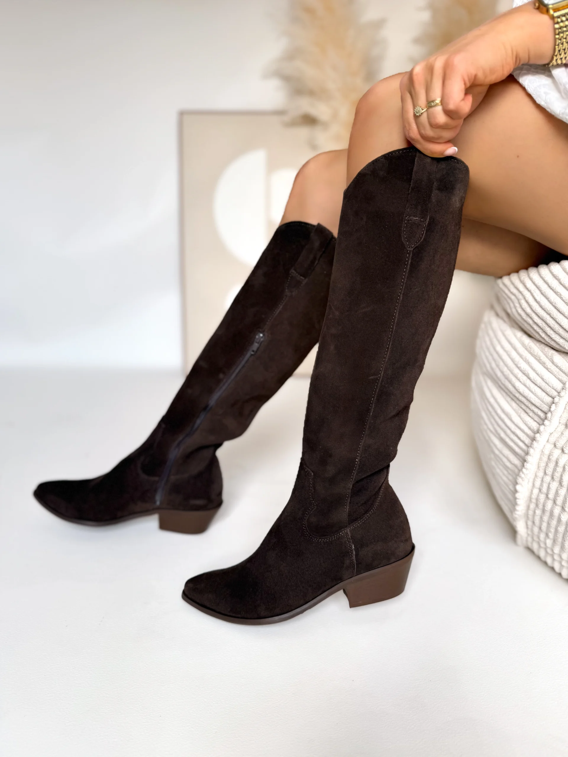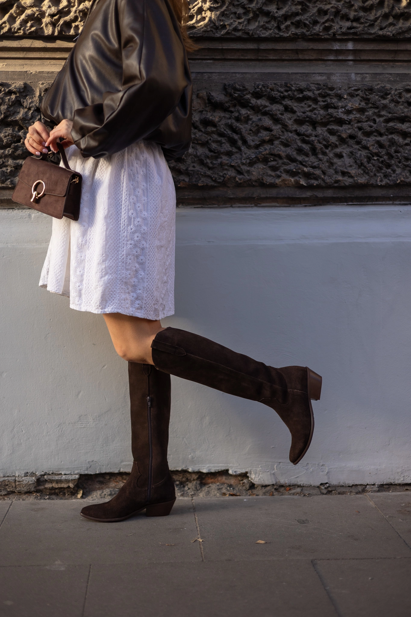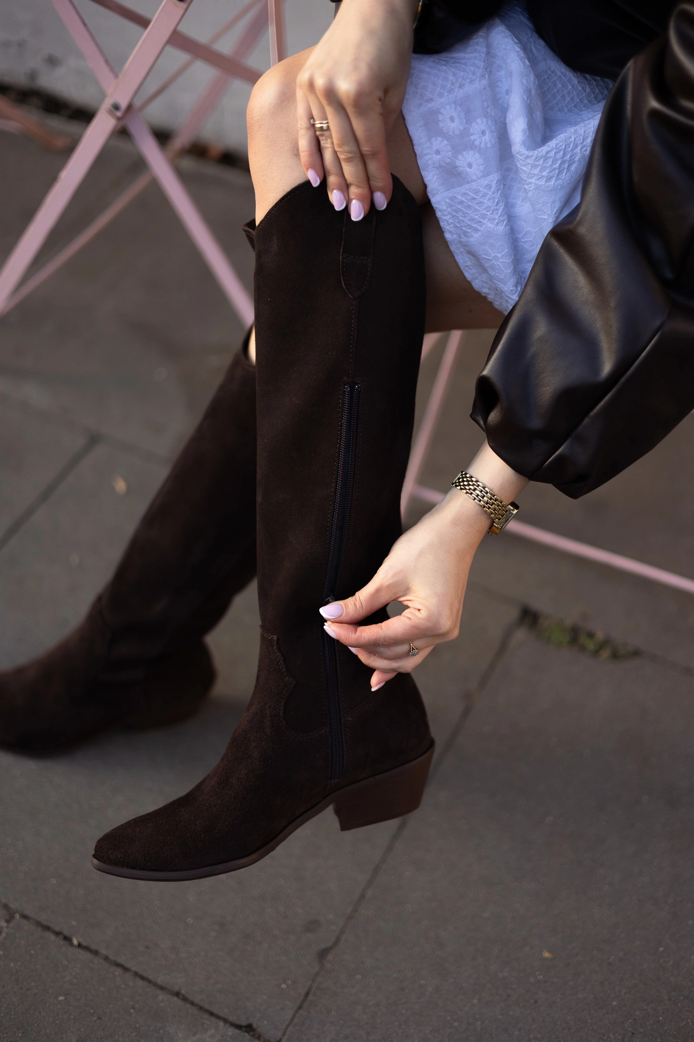 Model LULA 157 to obuwie, które łączy klasykę z nowoczesnością. Został stworzony dla kobiet ceniących jakość, wygodę oraz ponadczasowy styl. Co więcej, te kowbojki skórzane damskie wykonano w 100% z naturalnej skóry zamszowej, dzięki czemu są trwałe i prezentują się niezwykle elegancko. Kolor gorzkiej czekolady jest obecnie jednym z najmodniejszych odcieni sezonu jesienno-zimowego 2025, dlatego będzie idealnym wyborem dla każdej miłośniczki ciepłych tonów w garderobie.