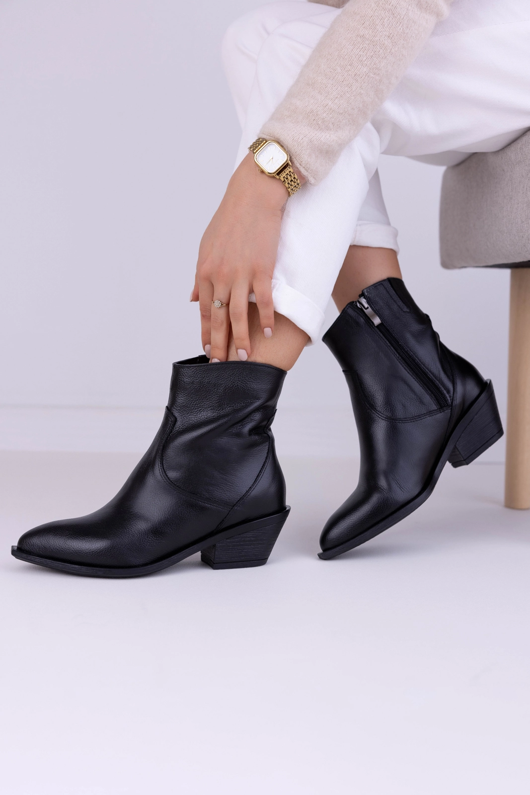Model LULA 168 wykonano w 100% z naturalnej czarnej skóry groszkowanej pochodzącej z Włoch. Skóra wyróżnia się elastycznością oraz odpornością na codzienne użytkowanie. Ponadto jej struktura nadaje butom elegancki wygląd. Dzięki temu kowbojki prezentują się szlachetnie i zachowują formę nawet po wielu założeniach.