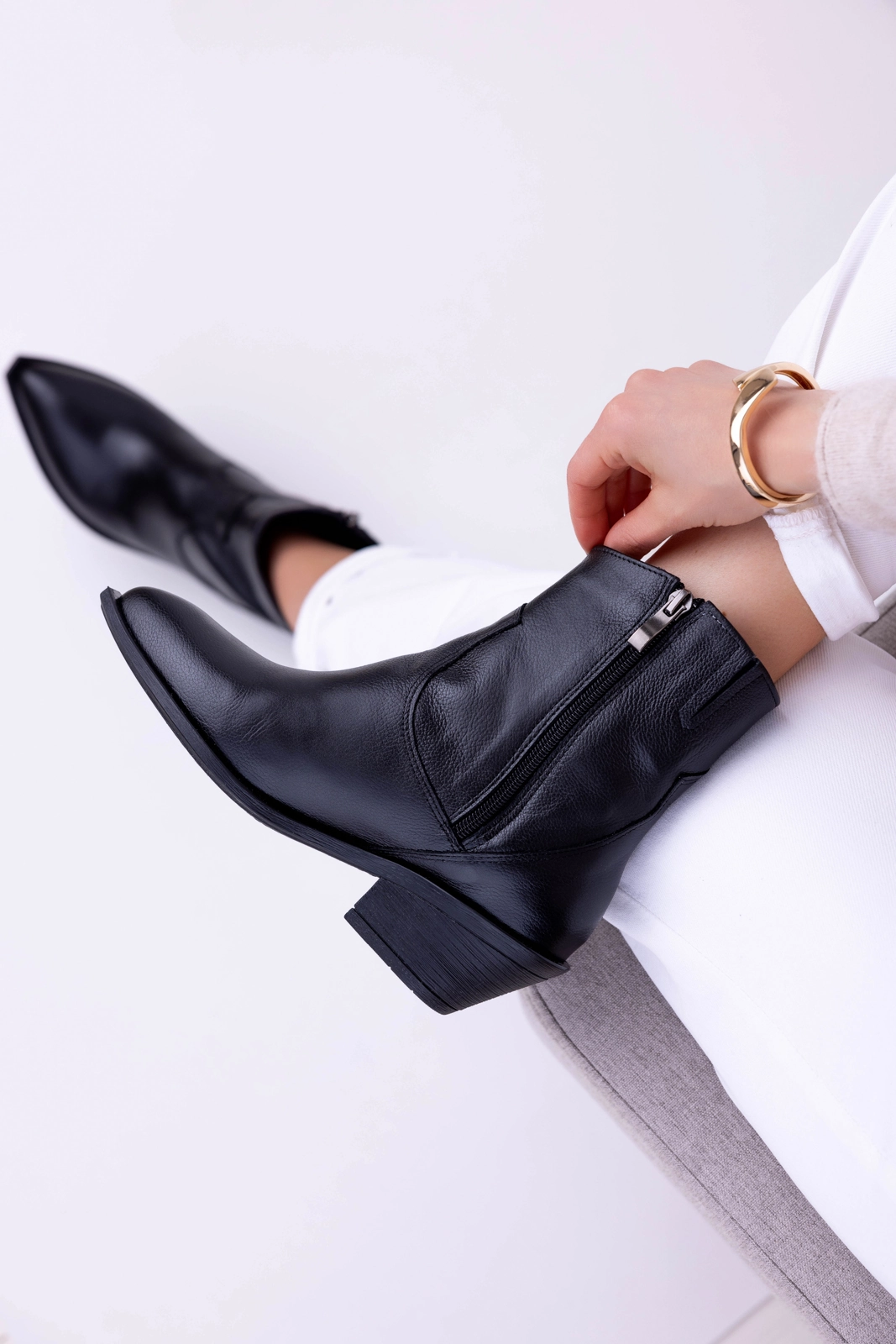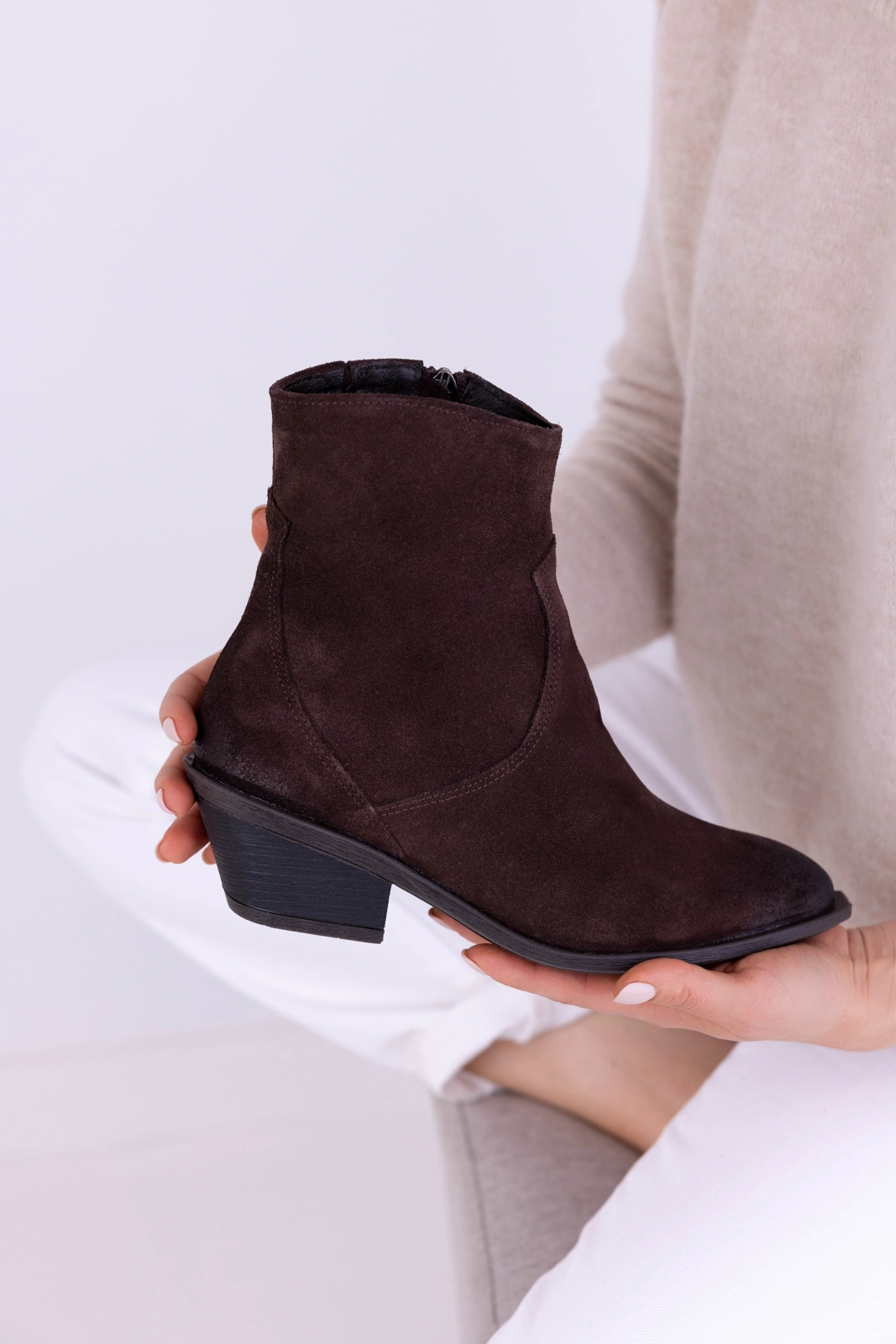 Kowbojki mają prosty, ponadczasowy krój. Jednocześnie uwagę przyciąga modny, ścięty nosek podeszwy, który nadaje całości nowoczesnego charakteru. To właśnie ten detal sprawia, że model wyróżnia się na tle klasycznych botków. Obcas o wysokości około 5,5 cm zapewnia stabilność, a jednocześnie subtelnie wysmukla sylwetkę.