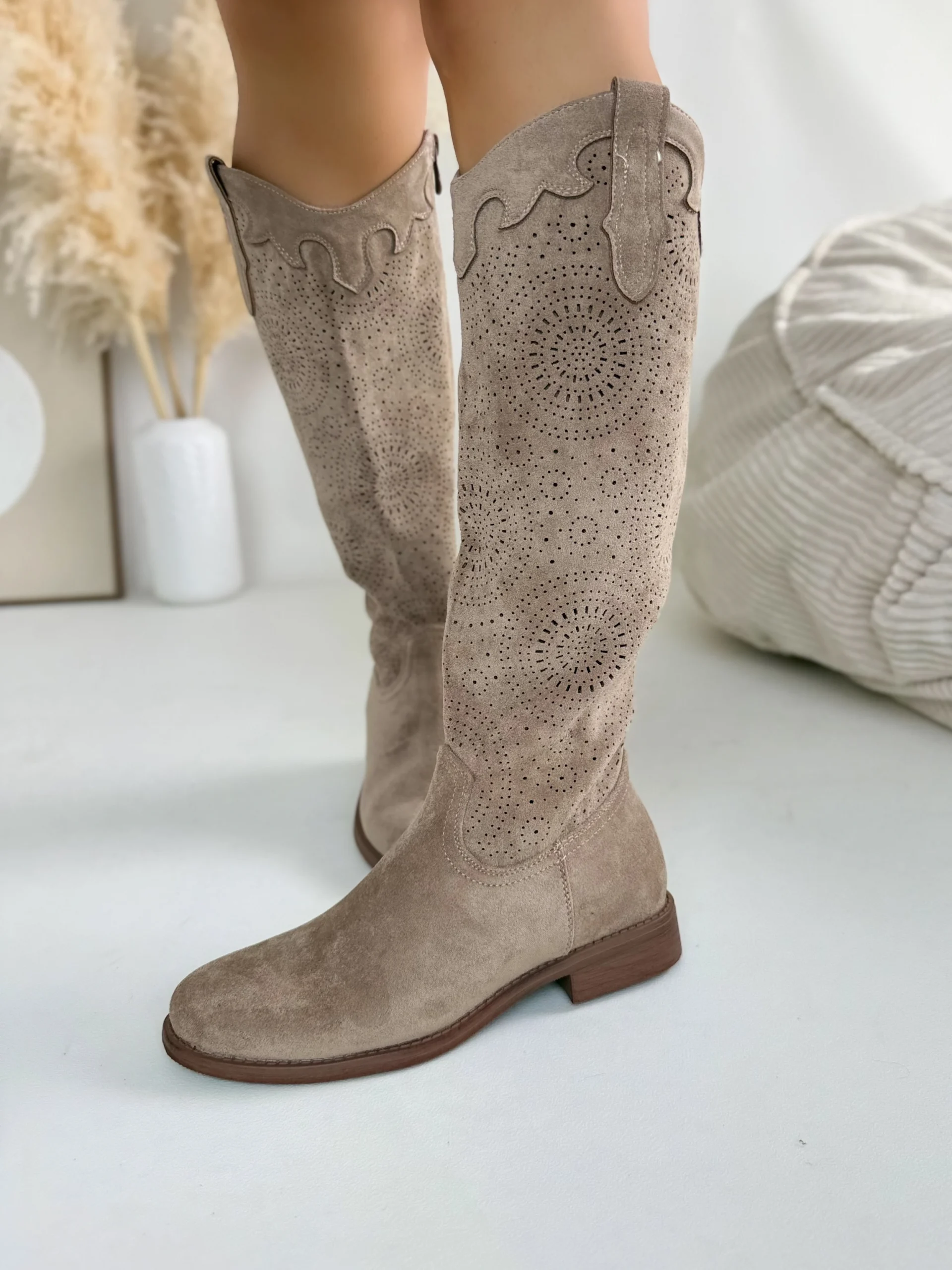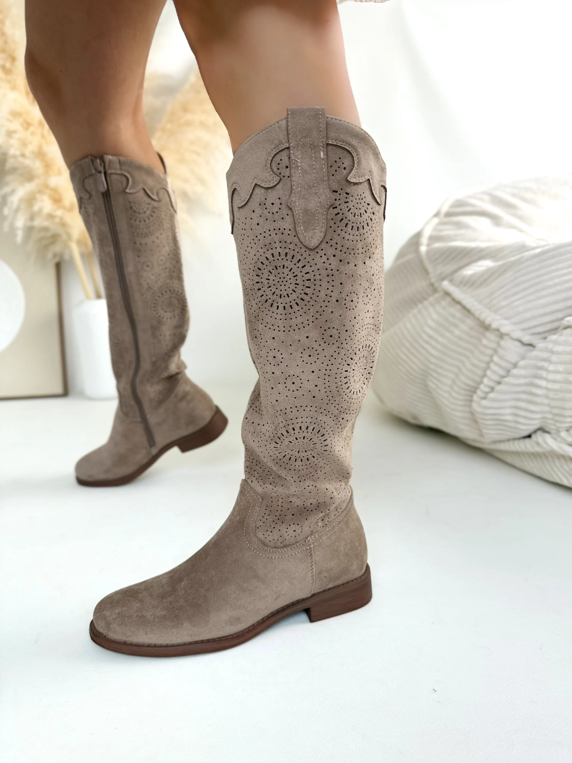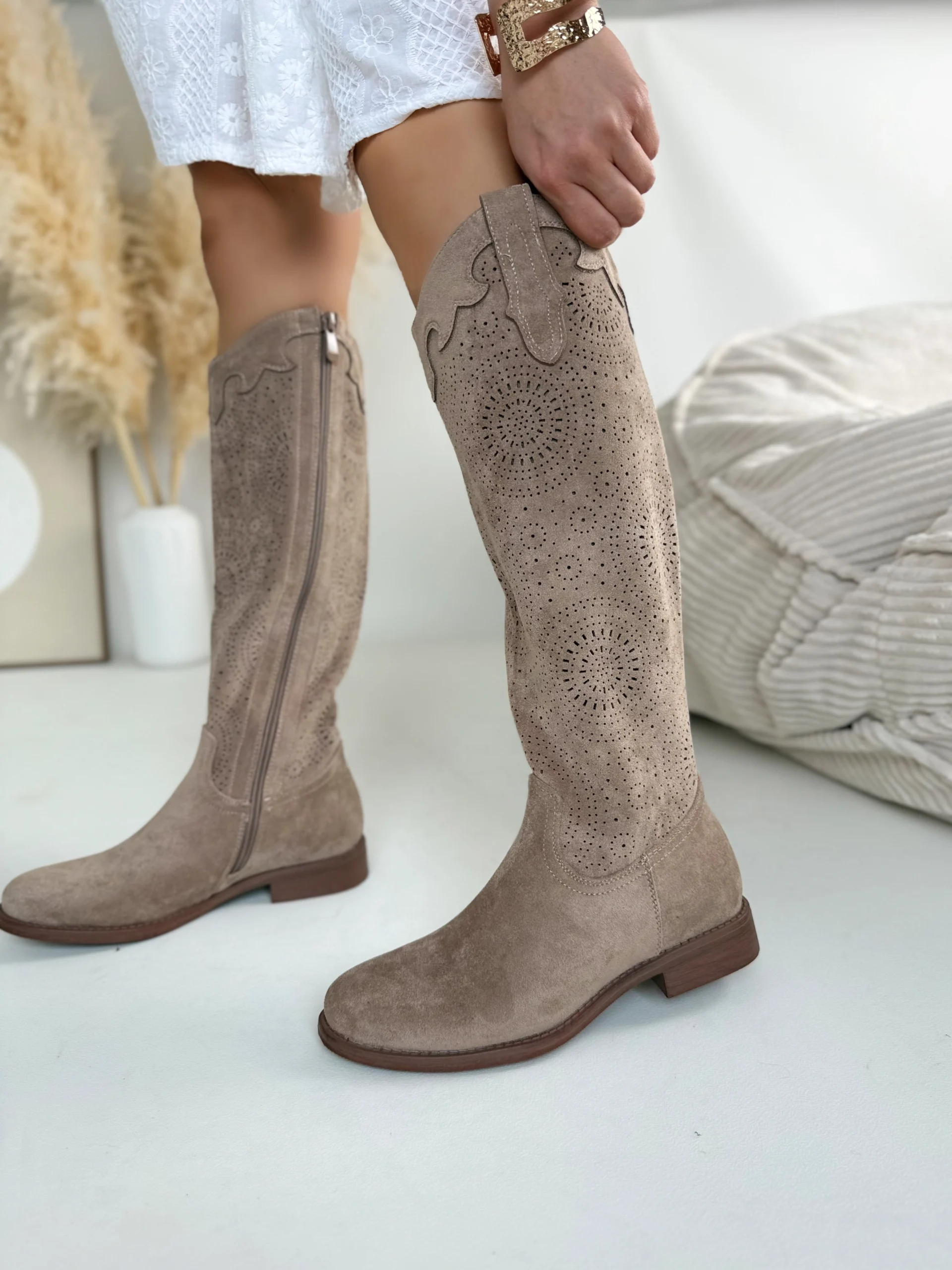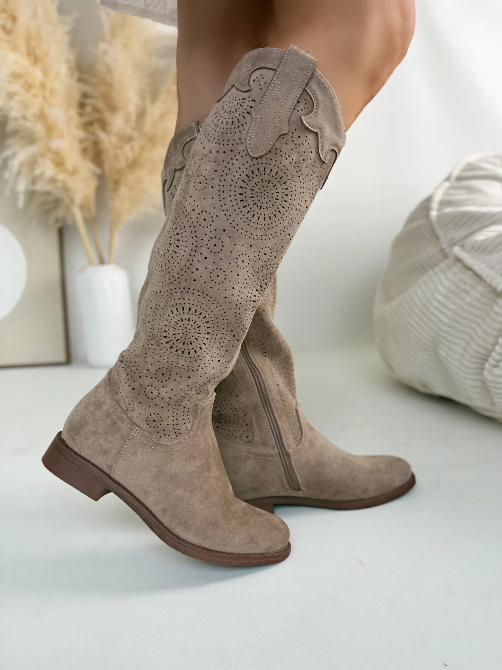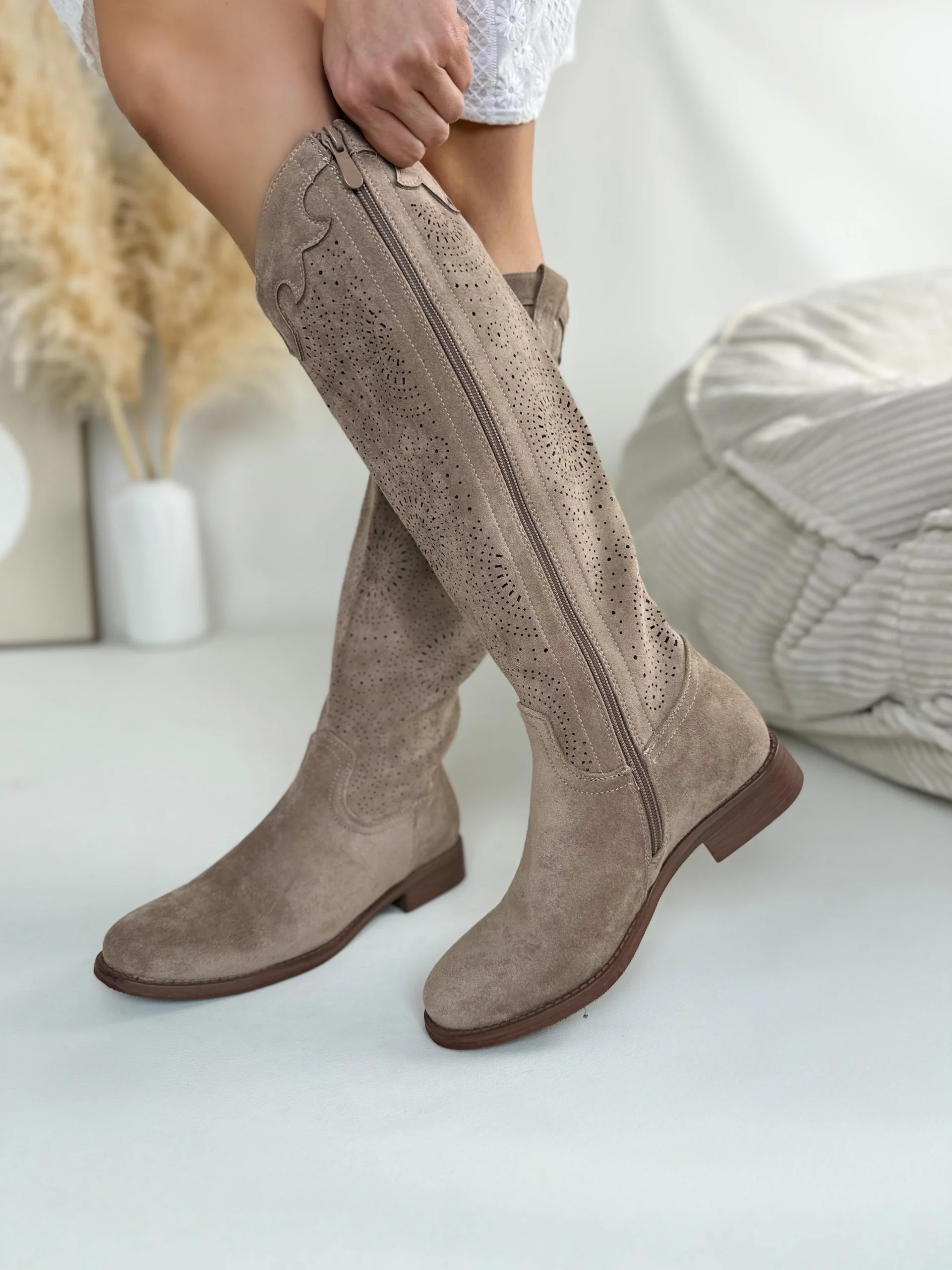 Cholewka została wykonana z miękkiej ekologicznej skóry zamszowej. Dzięki temu kozaki wyglądają bardzo stylowo i jednocześnie są proste w utrzymaniu w czystości. Ażurowy wzór dodaje im lekkości oraz wyjątkowego charakteru, dlatego model od razu wyróżnia się na tle innych beżowych kozaków damskich.