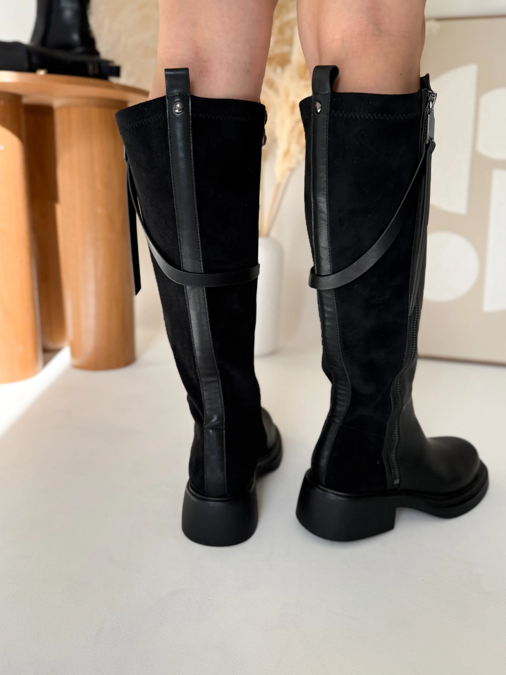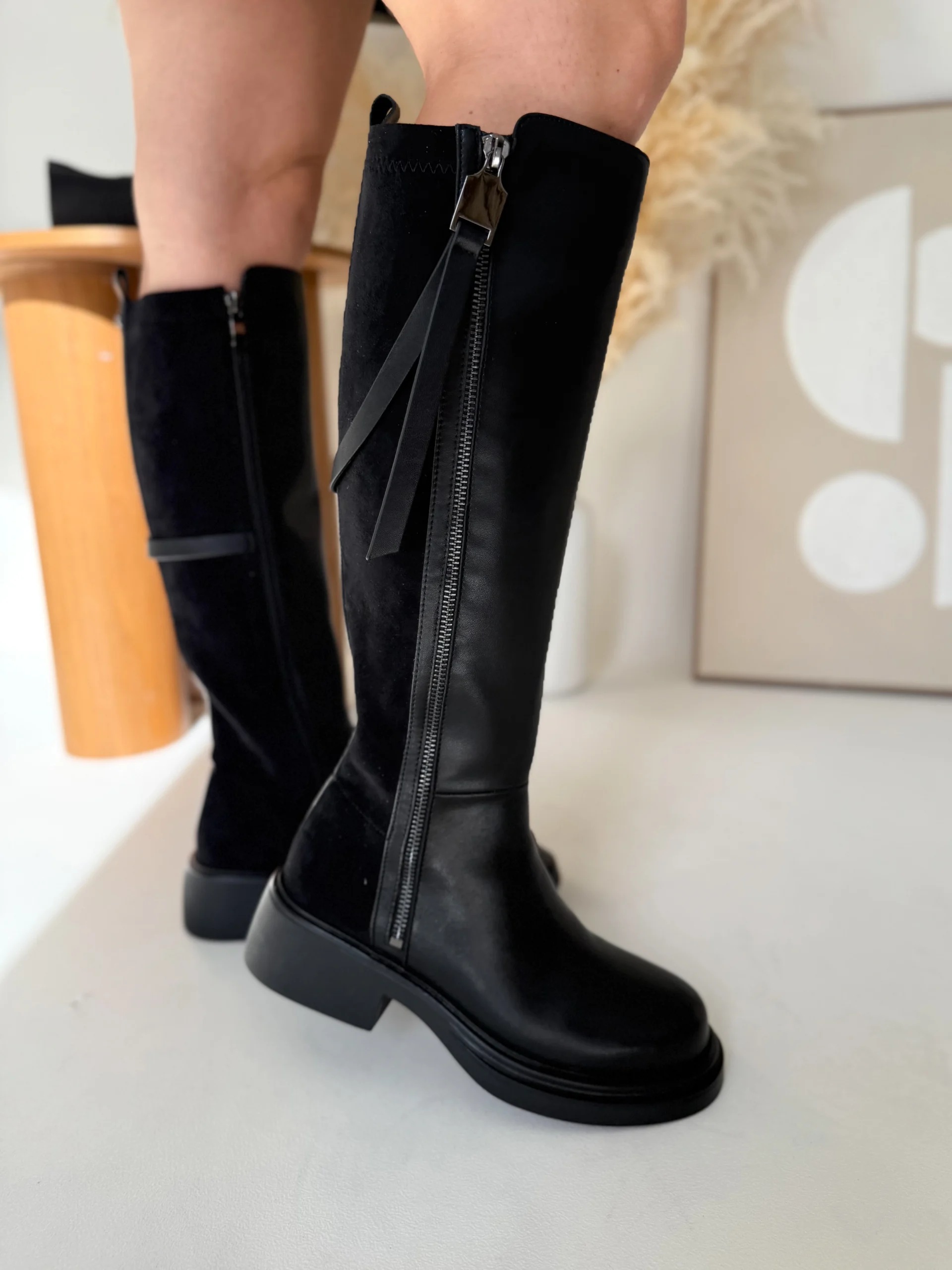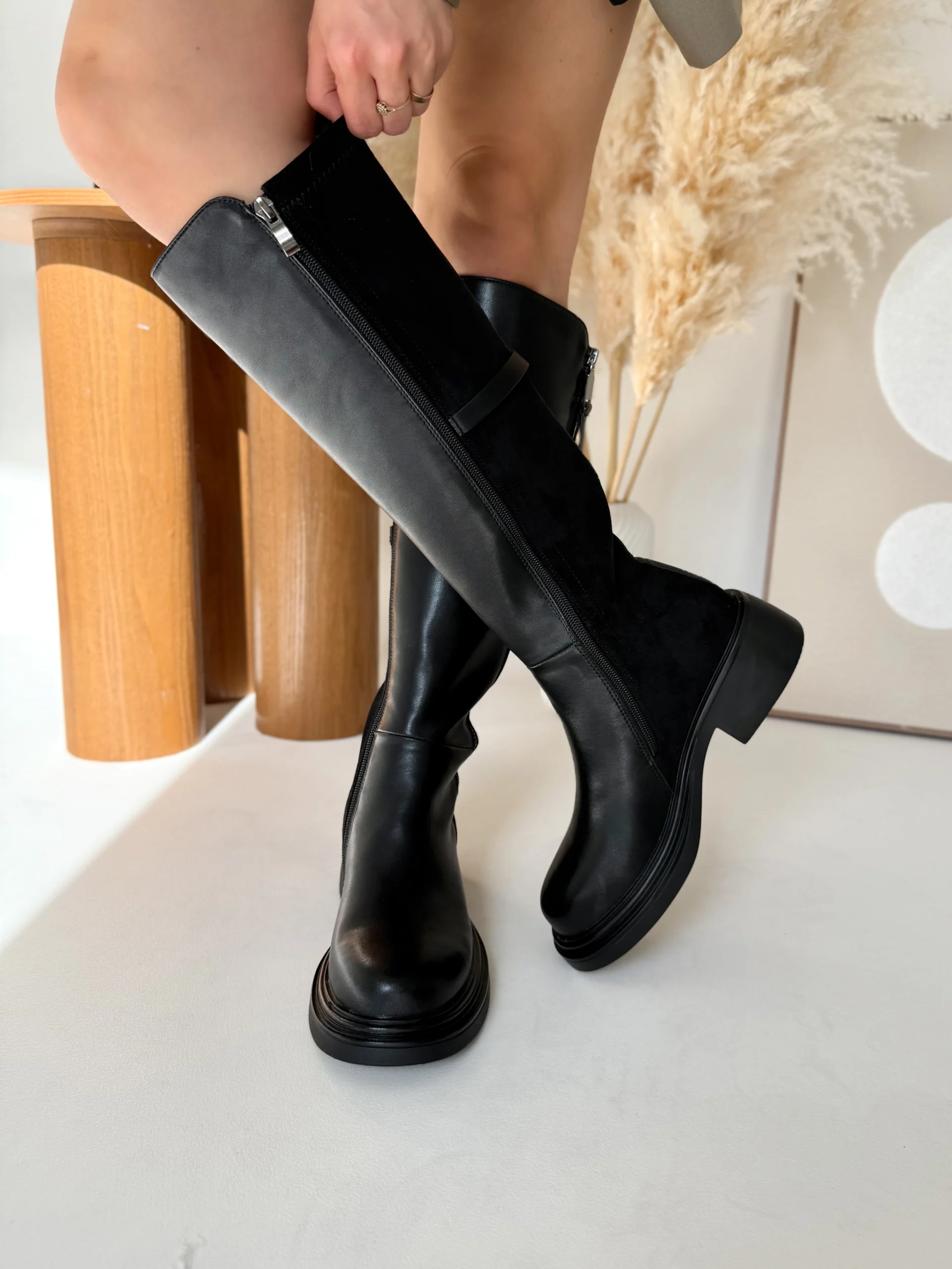 Czarne kozaki LULA 146 z szeroką cholewką, wykonane z naturalnej skóry i materiału tekstylnego, z ozdobnym suwakiem z boku i płaskim obcasem 5 cm.