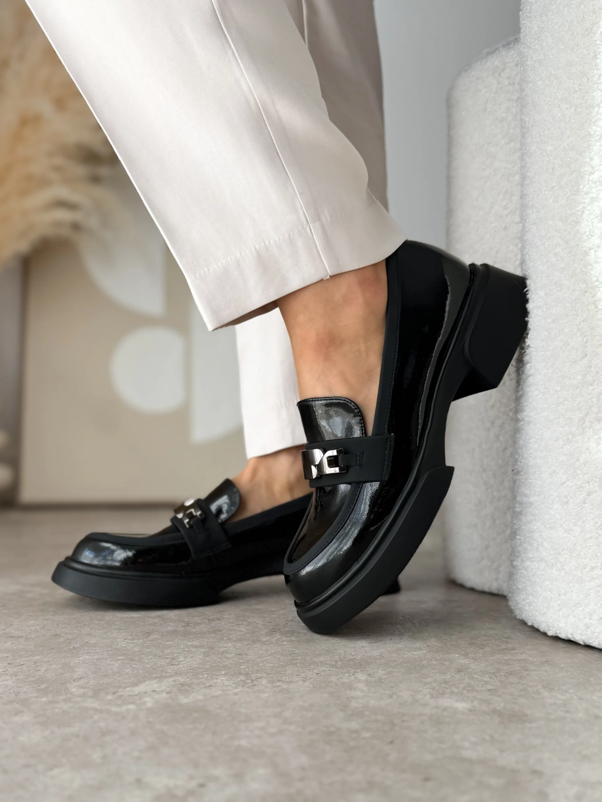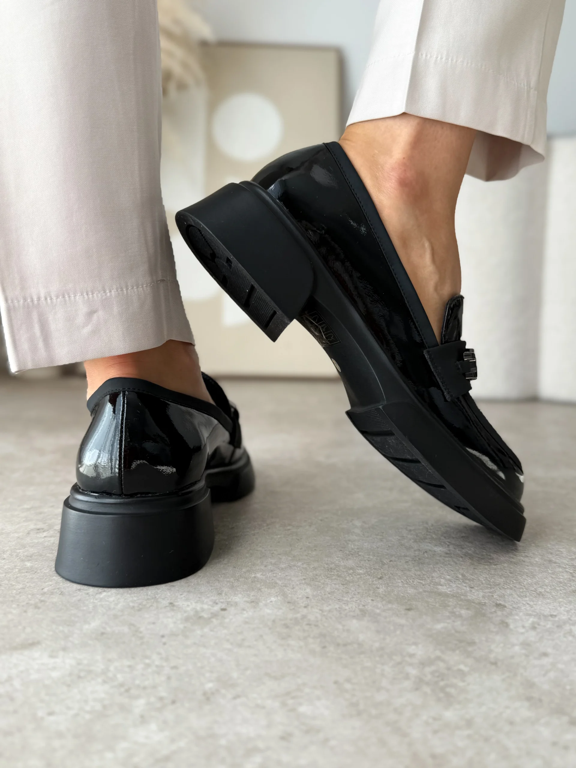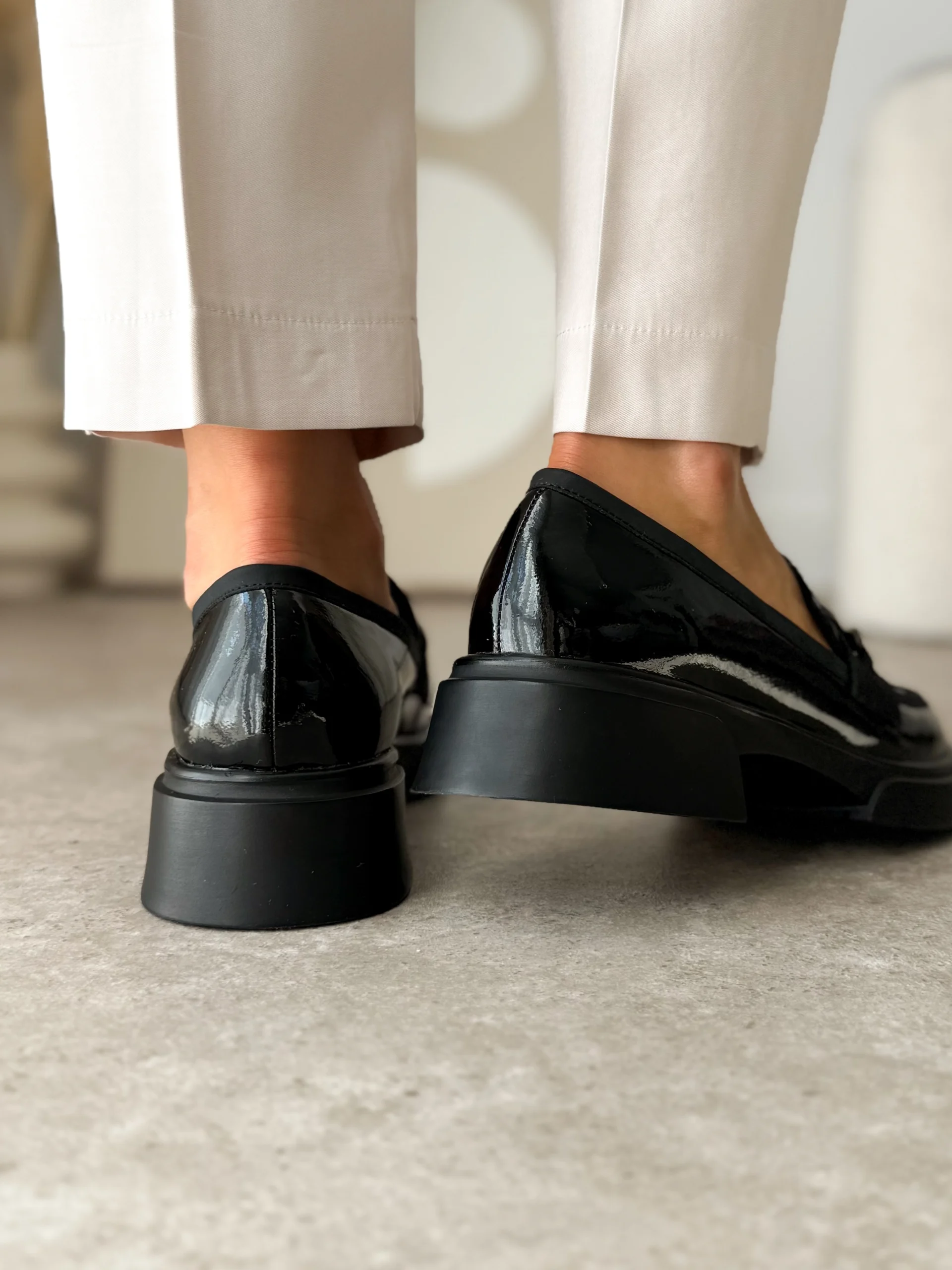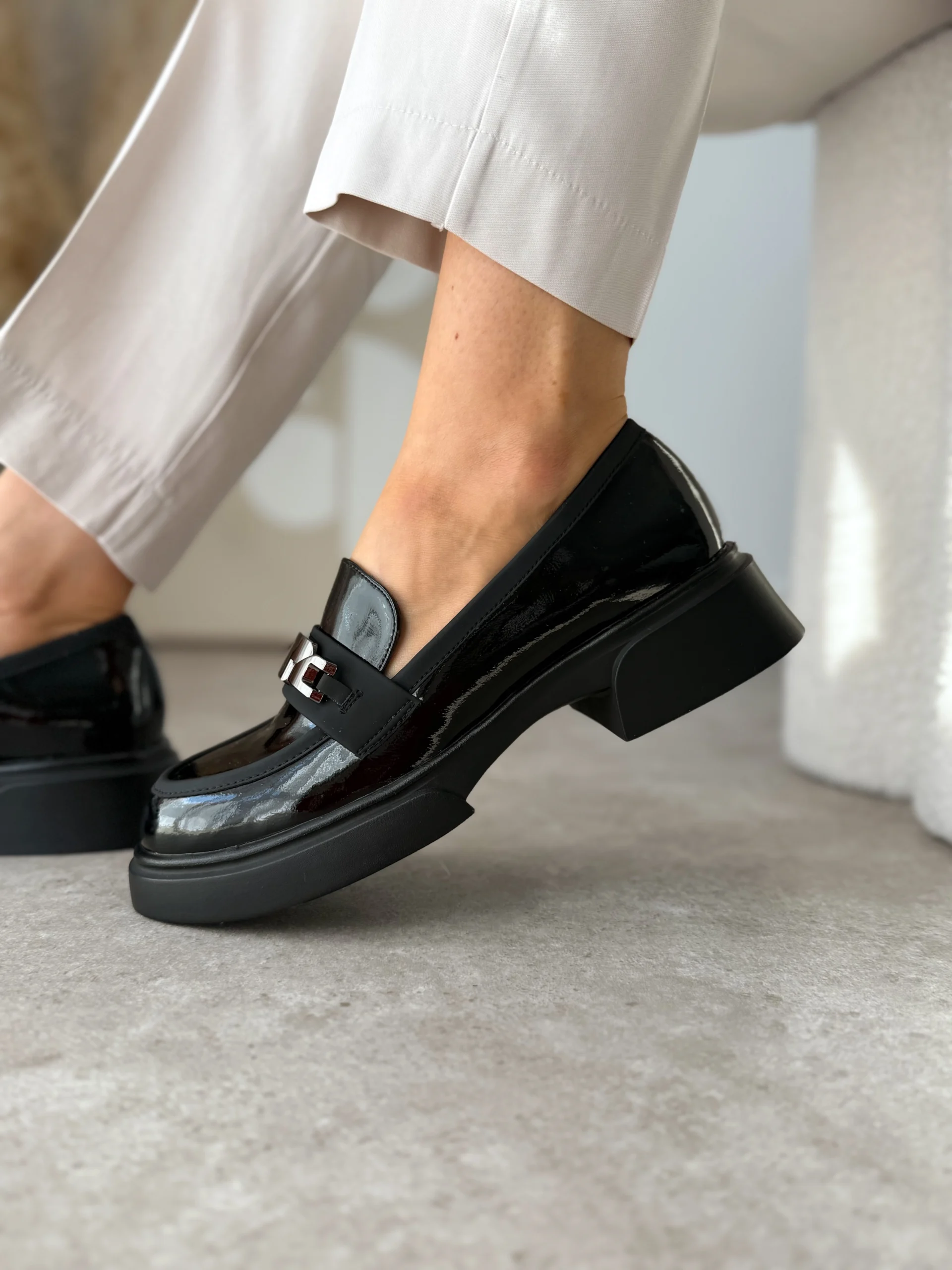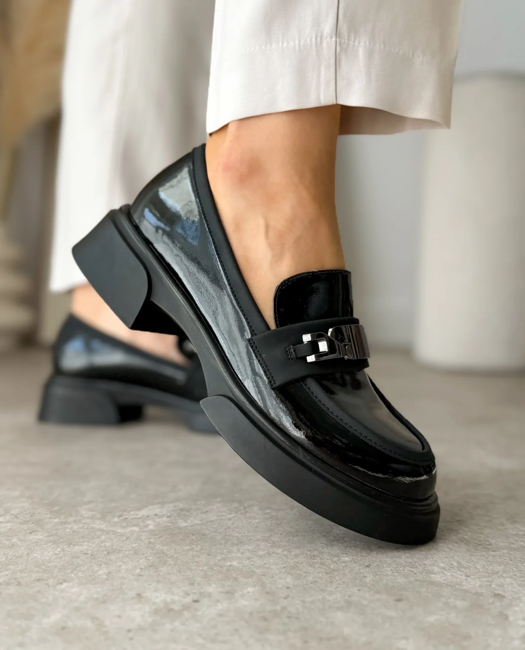 • klasyczne czarne mokasyny skórzane z lakierowanym wykończeniem,