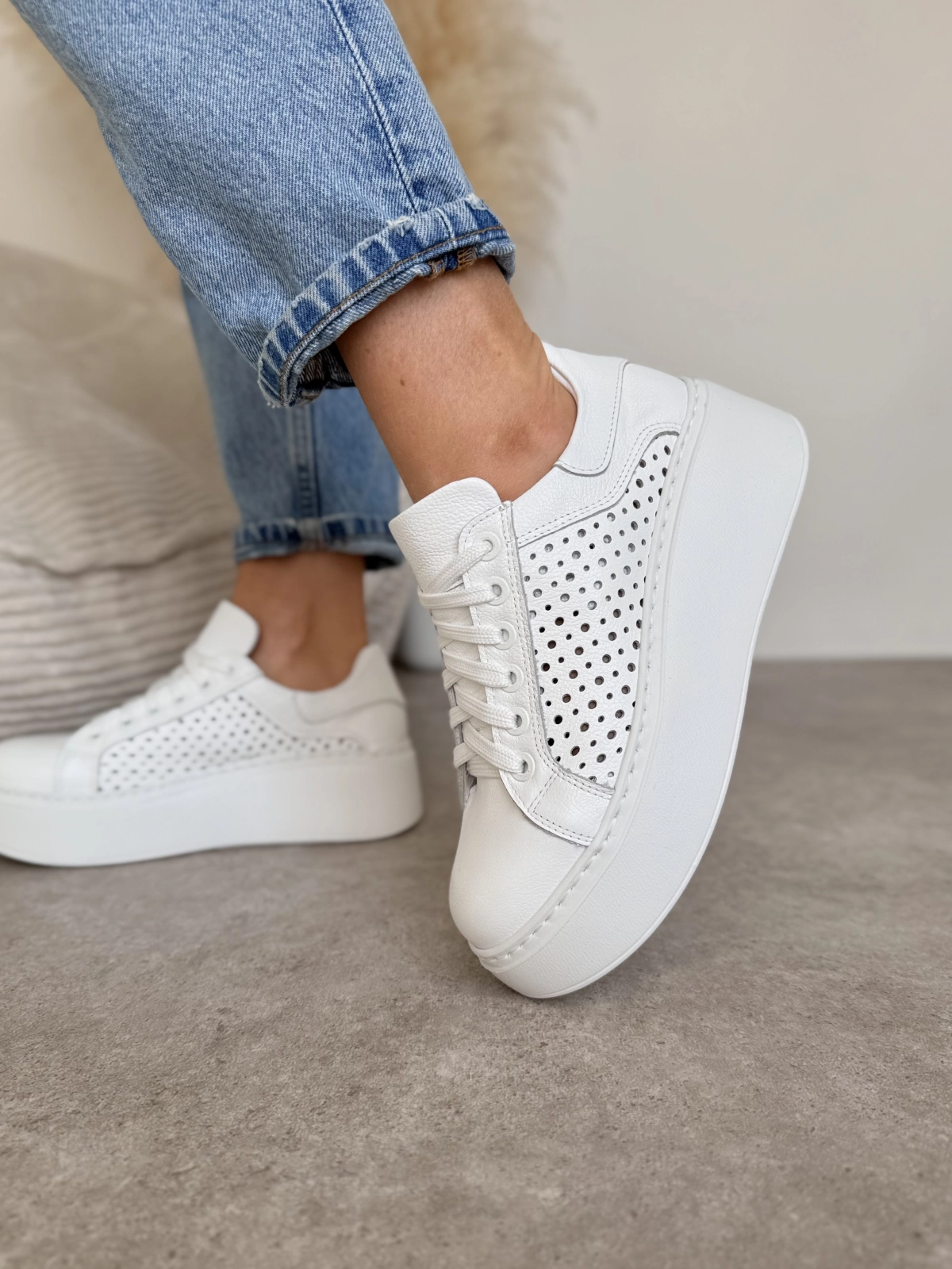 Cholewkę wykonano w 100% z naturalnej skóry groszkowej z Włoch, ponieważ tylko taki materiał zapewnia odpowiednią miękkość i trwałość. Skóra oddycha, a więc stopa pozostaje sucha nawet w cieplejsze dni.