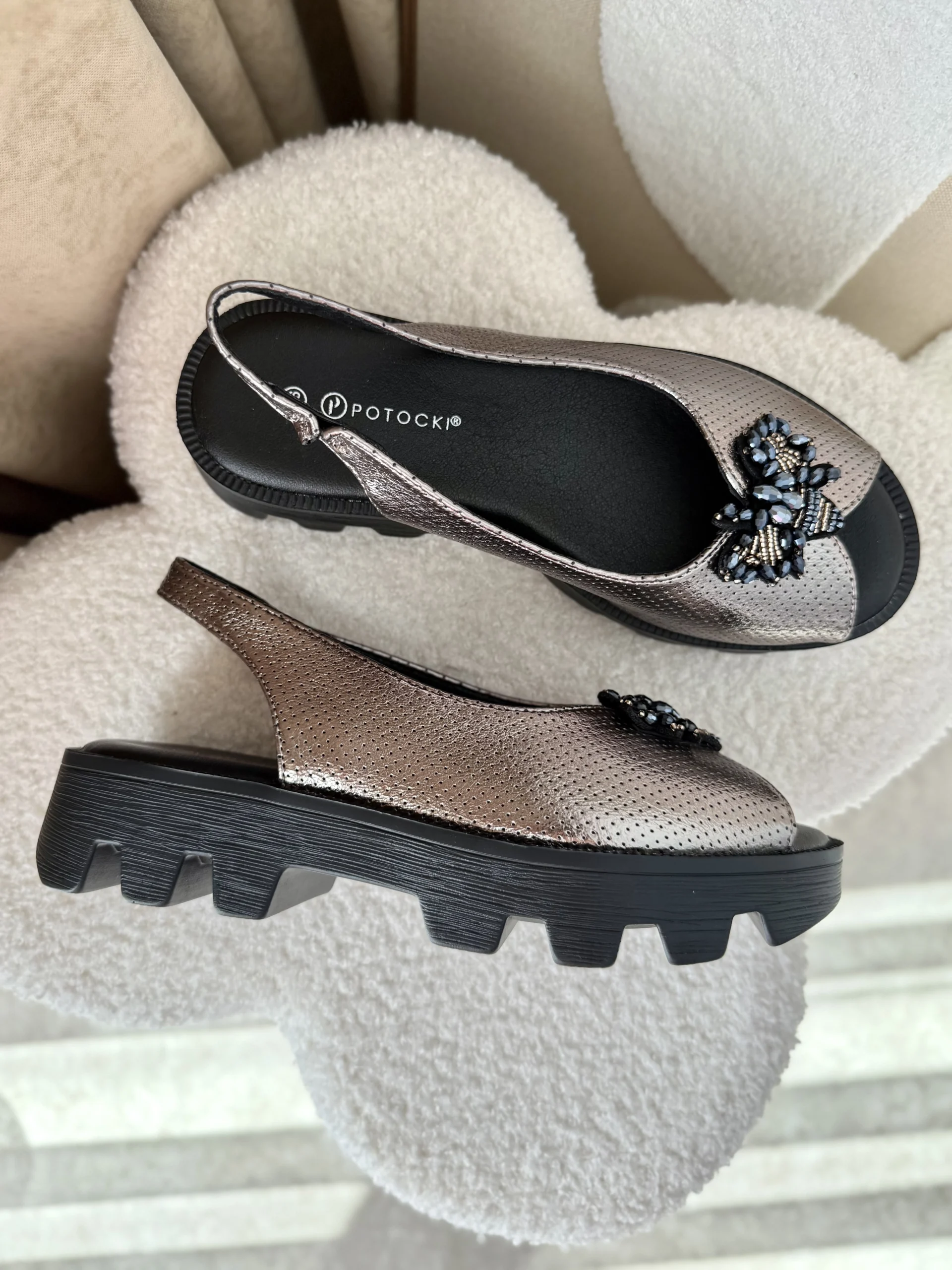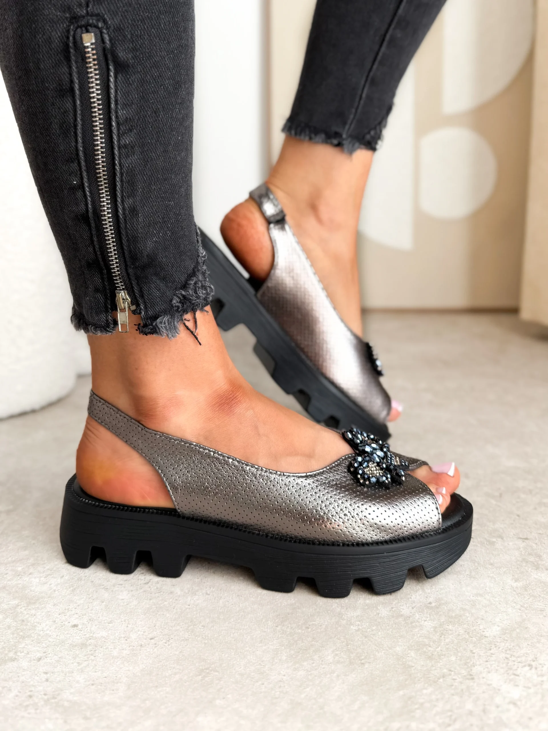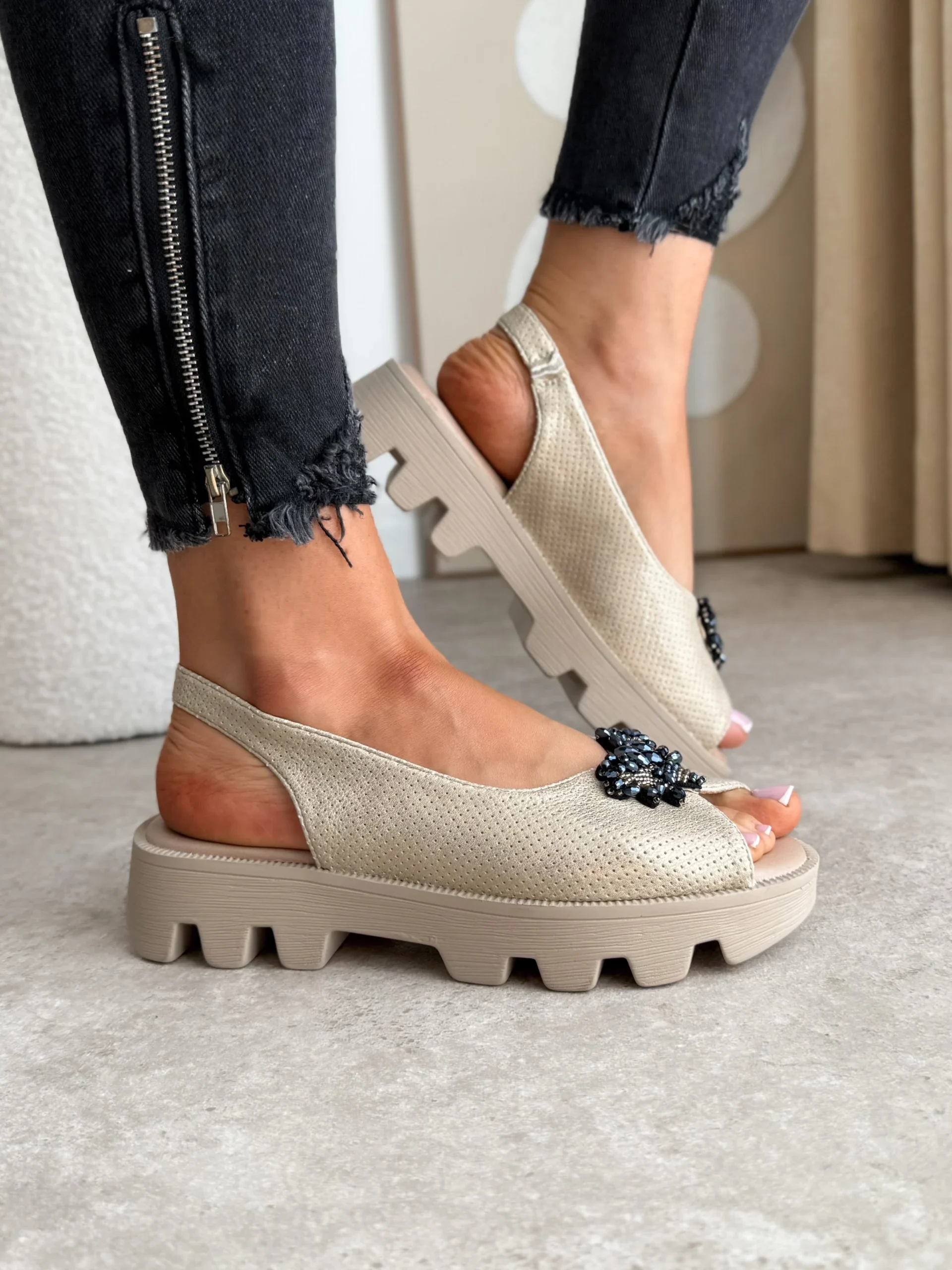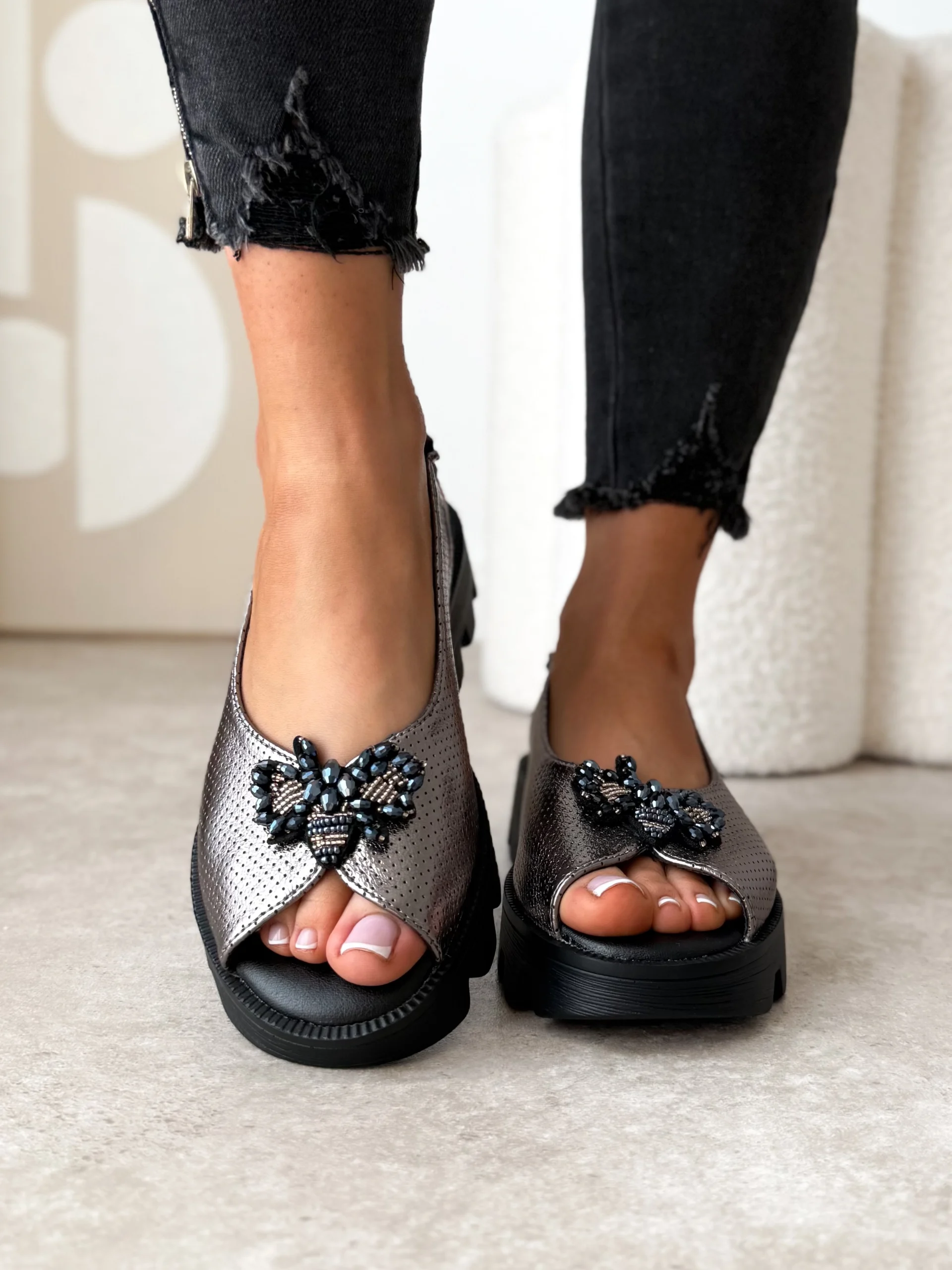 Wyższa podeszwa dodaje im niebanalnego wyglądu oraz wizualnie wydłuża sylwetkę. Na przodzie buta znajduje się błyszcząca ozdoba w kształcie owada, która dodaje im eleganckiego charakteru. Wewnątrz sandałów znajduje się miękka wkładka, dzięki czemu będziesz odczuwać komfort nawet przez długi czas ich użytkowania.