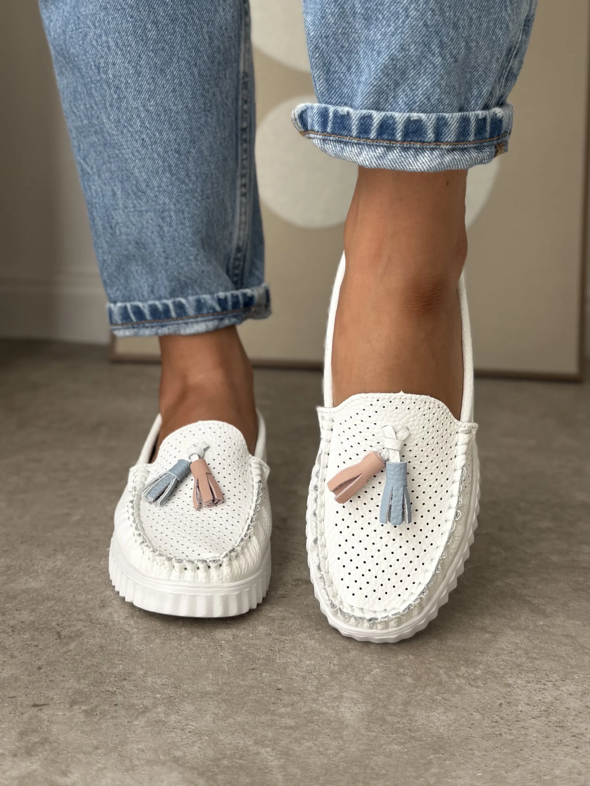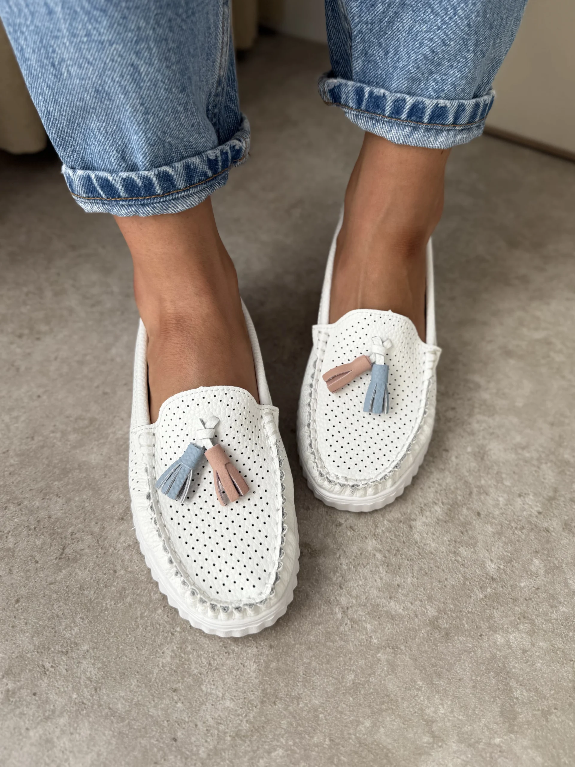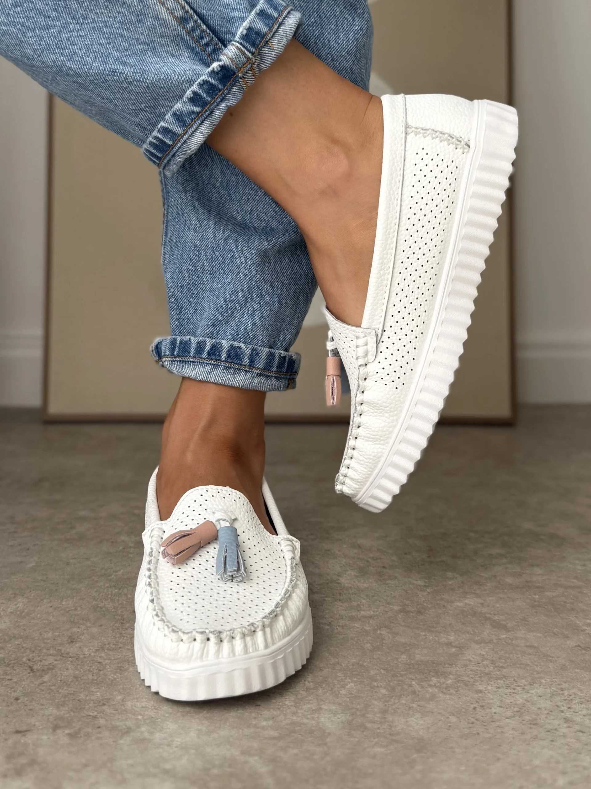 LULA 57 białe skórzane ultralekkie mokasyny z chwostami