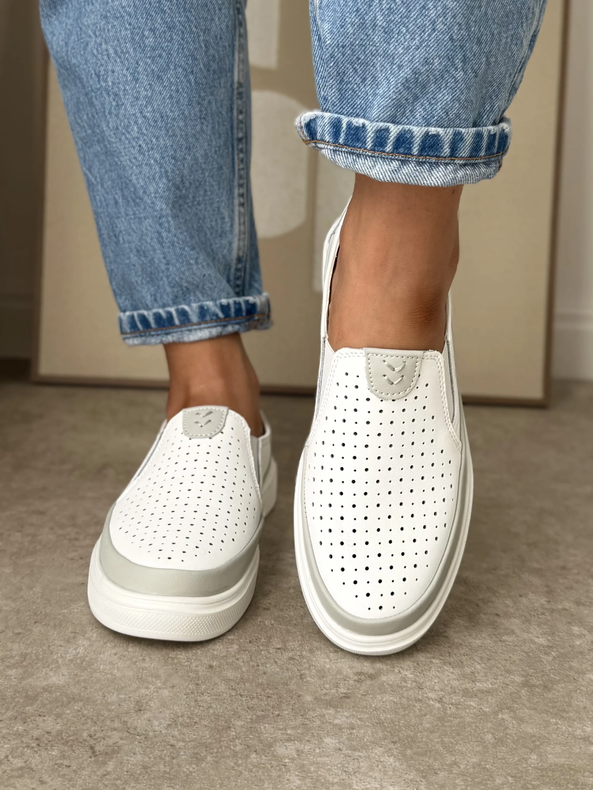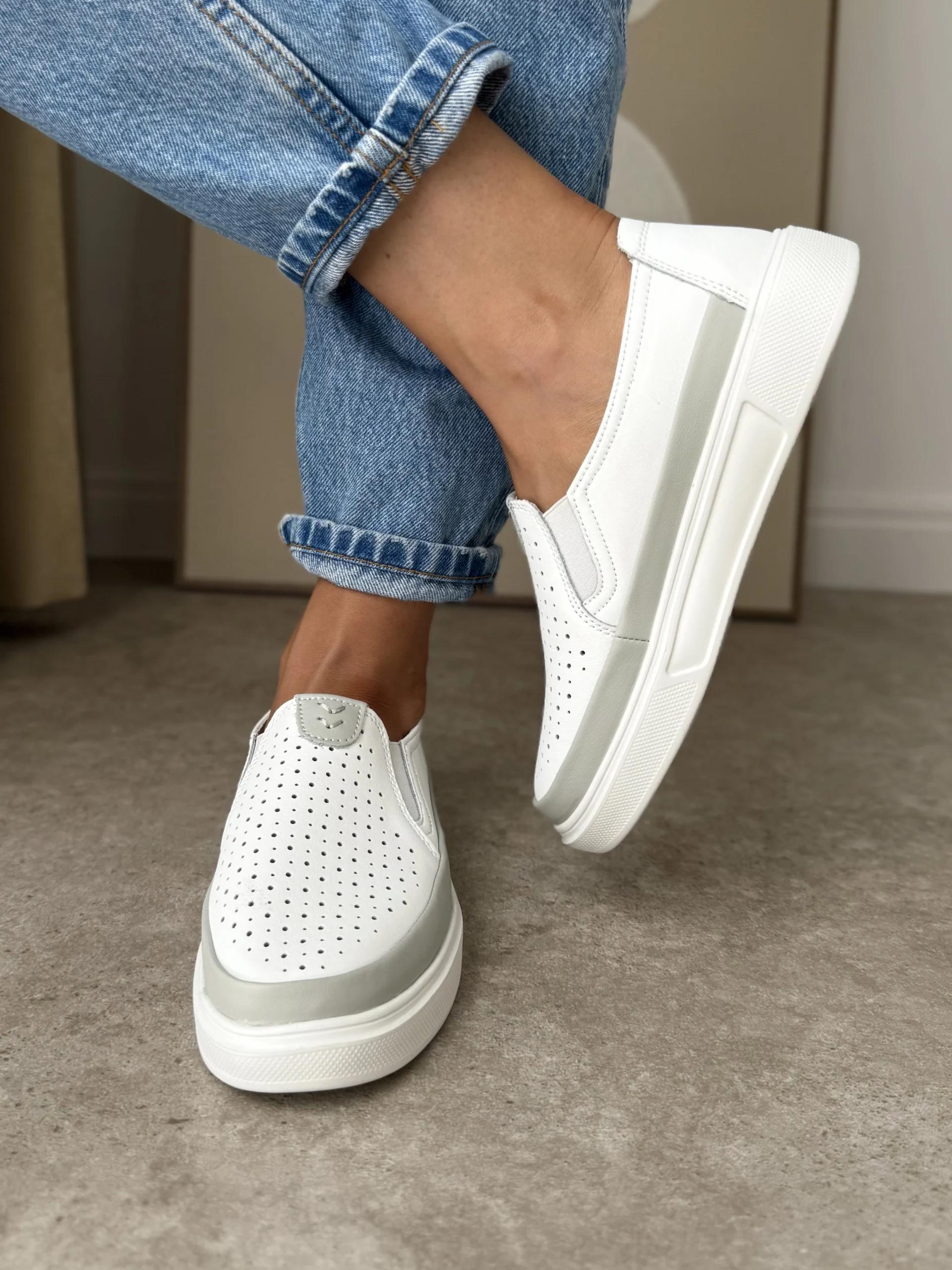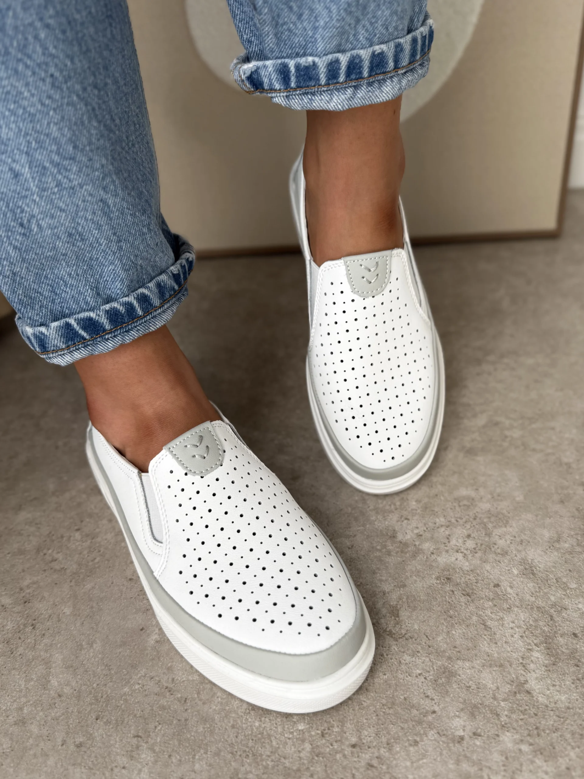 Wsuwane lekkie trampki slip’ony wykonane z miękkiej skóry naturalnej. Ażurowa cholewka na przodzie buta sprawia, że buty są bardziej przewiewne przez co idealnie sprawdzą się wiosną oraz latem w cieplejsze dni.