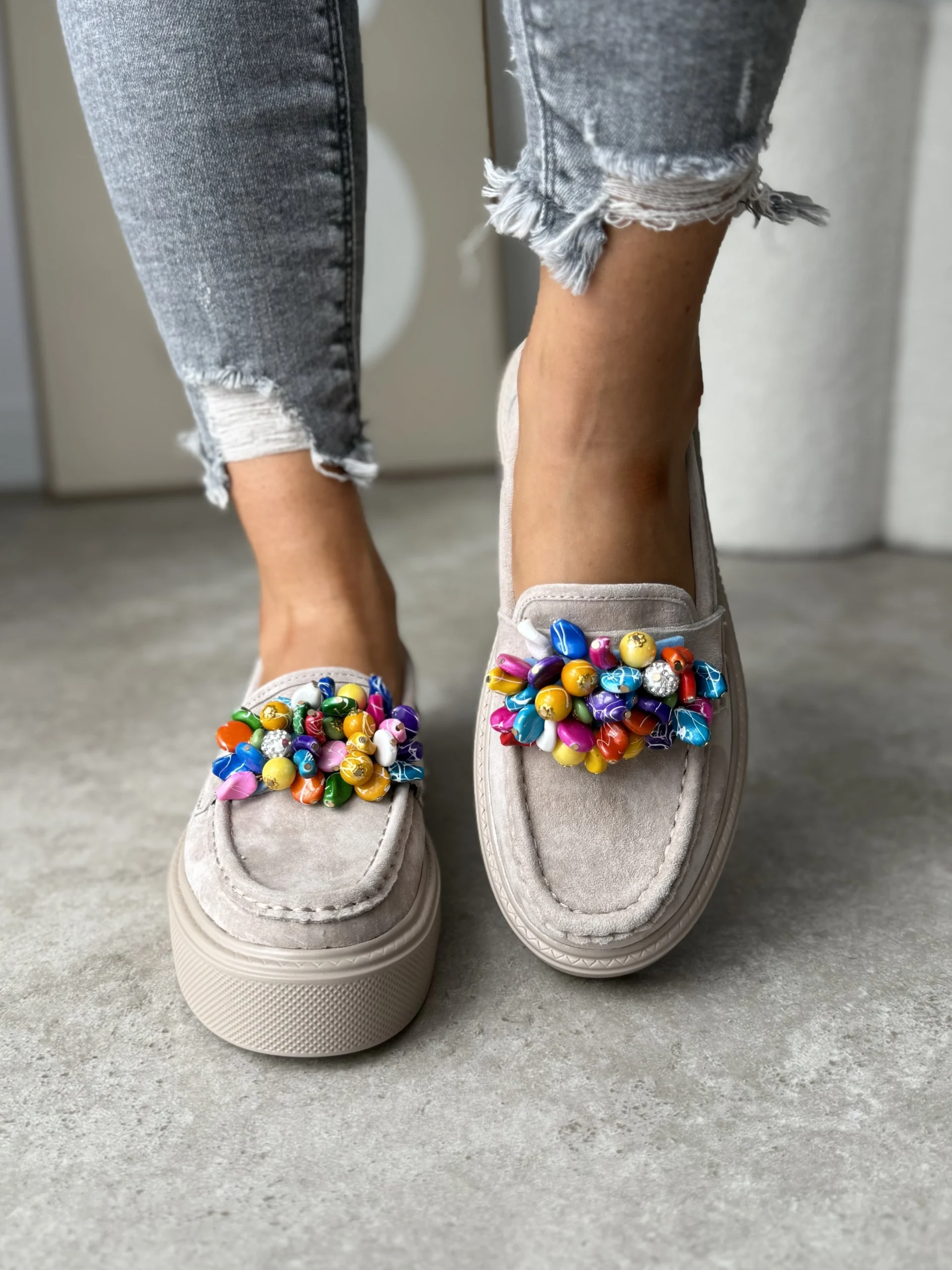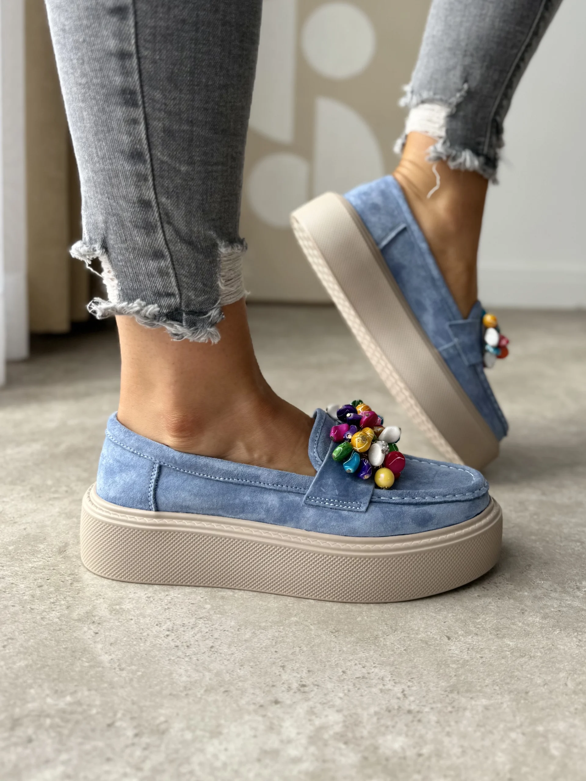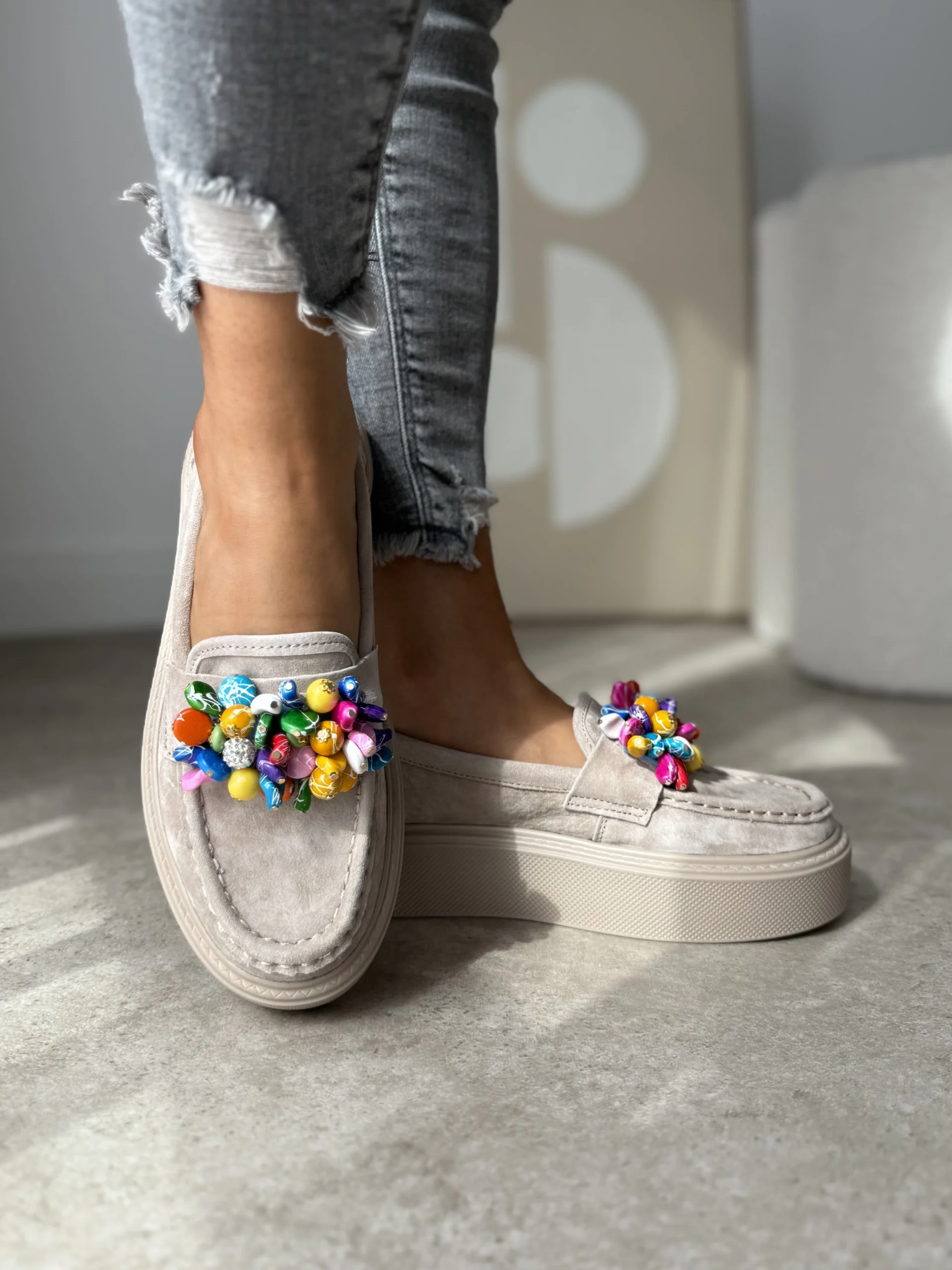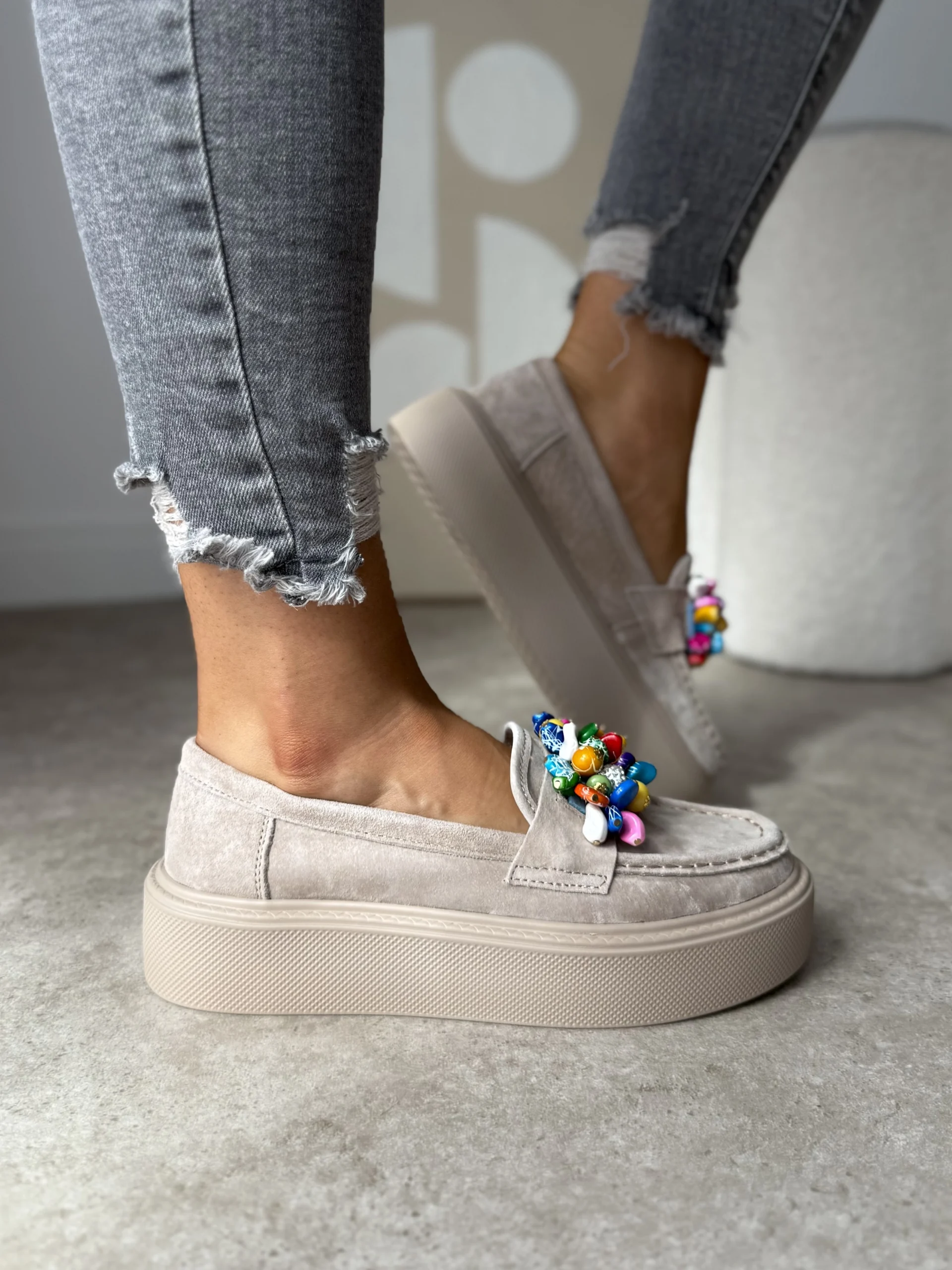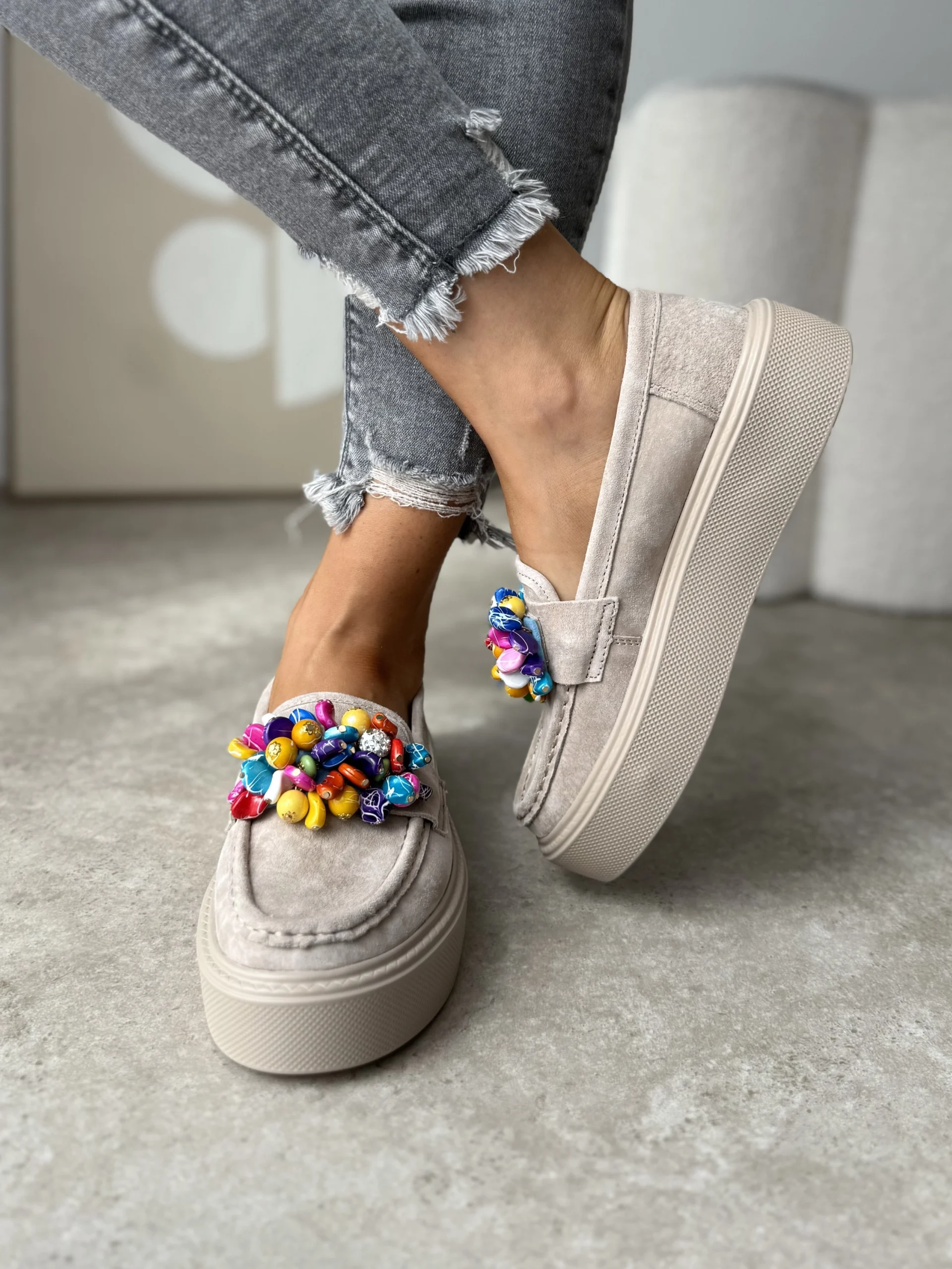 Stylowe obuwie z piękną ozdobą na górze cholewki, duże ozdobne kolorowe kamienie, które dodają charakteru i wyjątkowości. Będzie pasować do codziennych stylizacji, na towarzyskie wyjścia oraz tych casual do biura. Model został wykonany z wysokiej jakości skóry naturalnej zamsz.