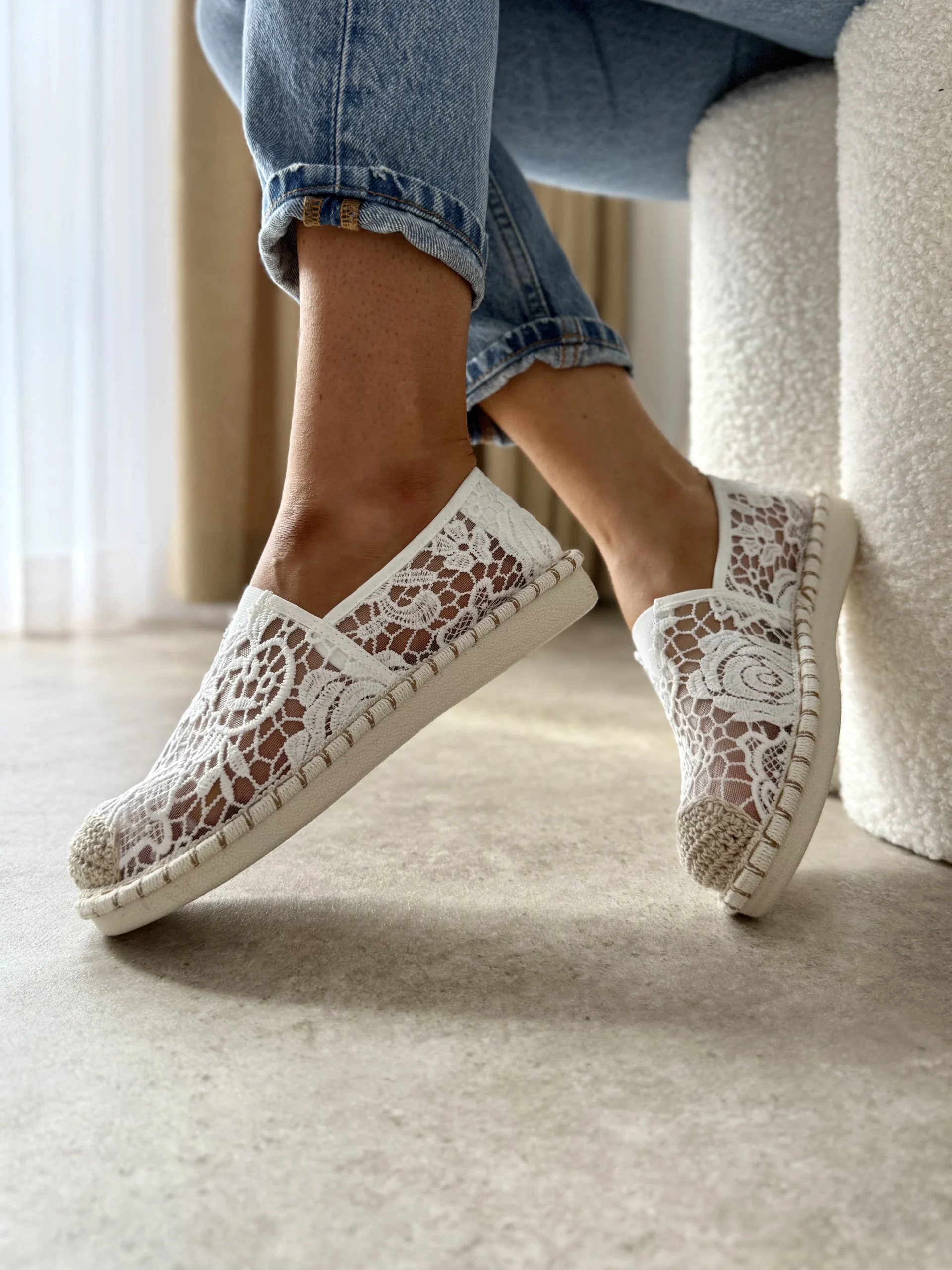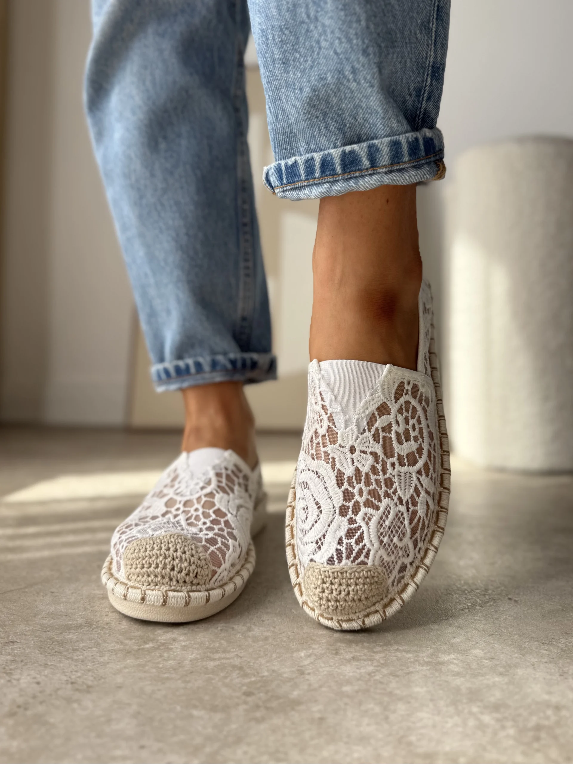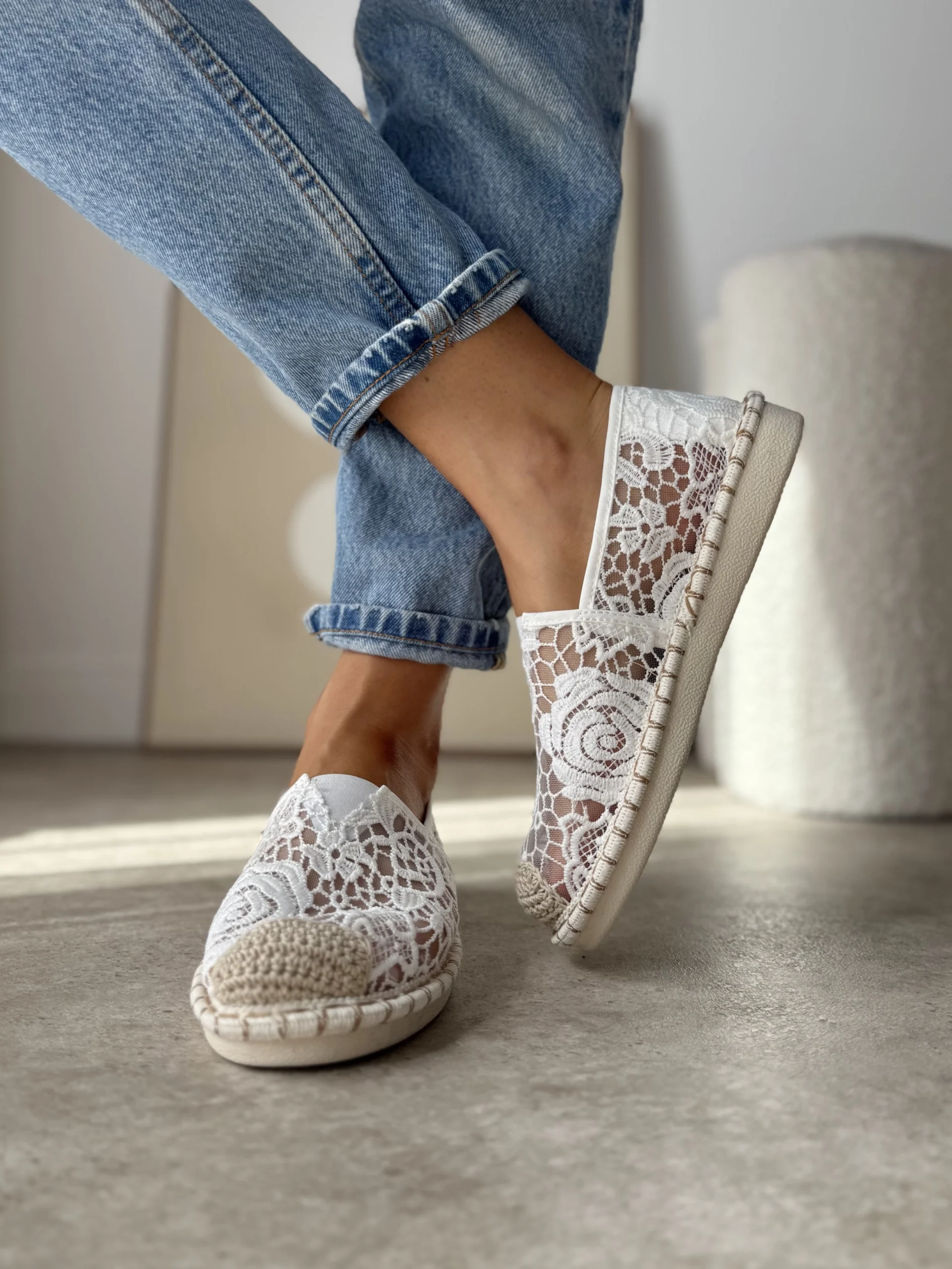 Urocze espadryle wykonane z materiałowej białej koronki. Sprawdzą się jako obuwie wiosenne oraz letnie. Będą idealnym dopełnieniem wakacyjnych stylizacji na plaże, do biura, na randkę, ale będą także idealnym rozwiązaniem jako obuwie zamienne dla Panny Młodej.