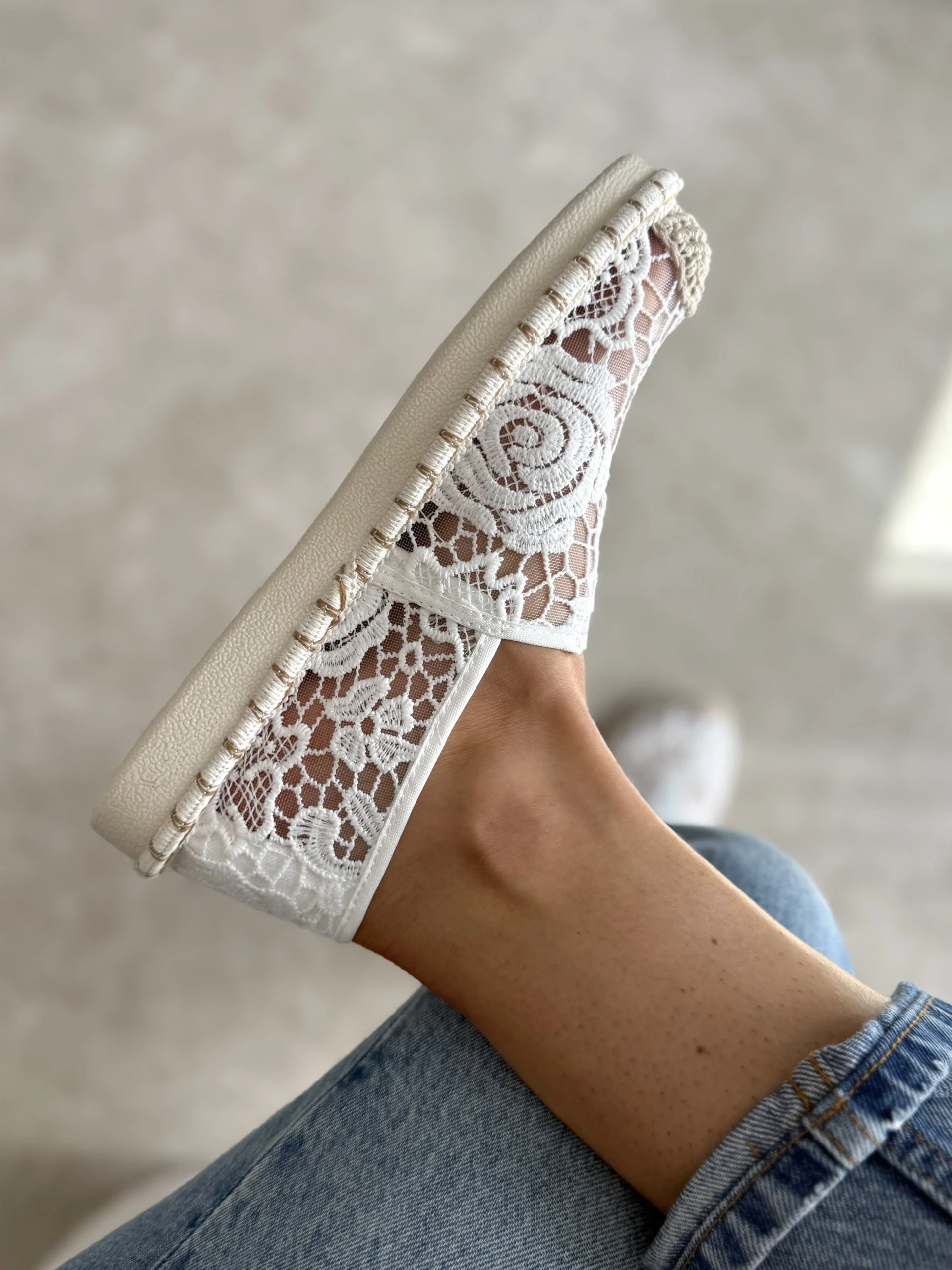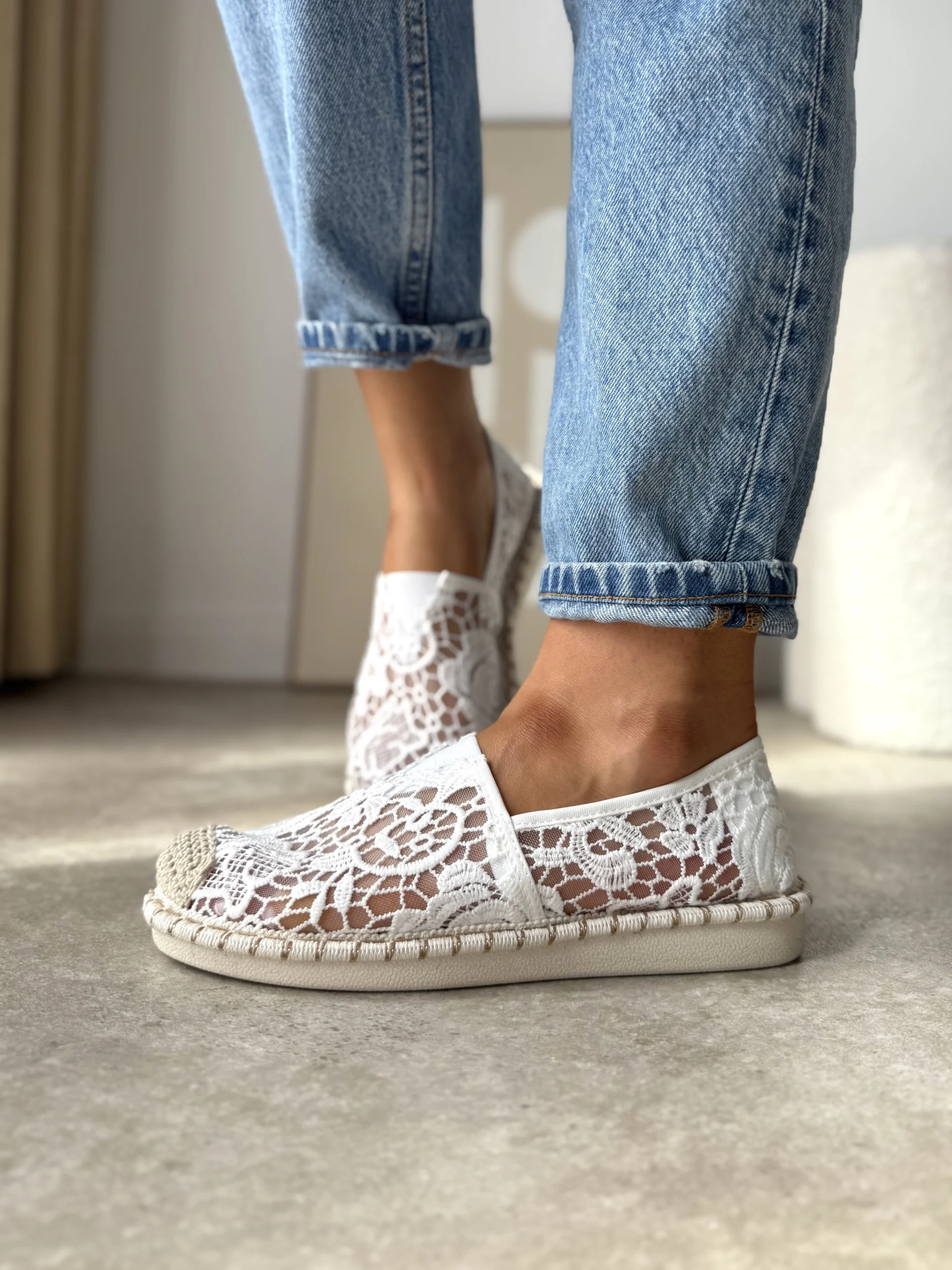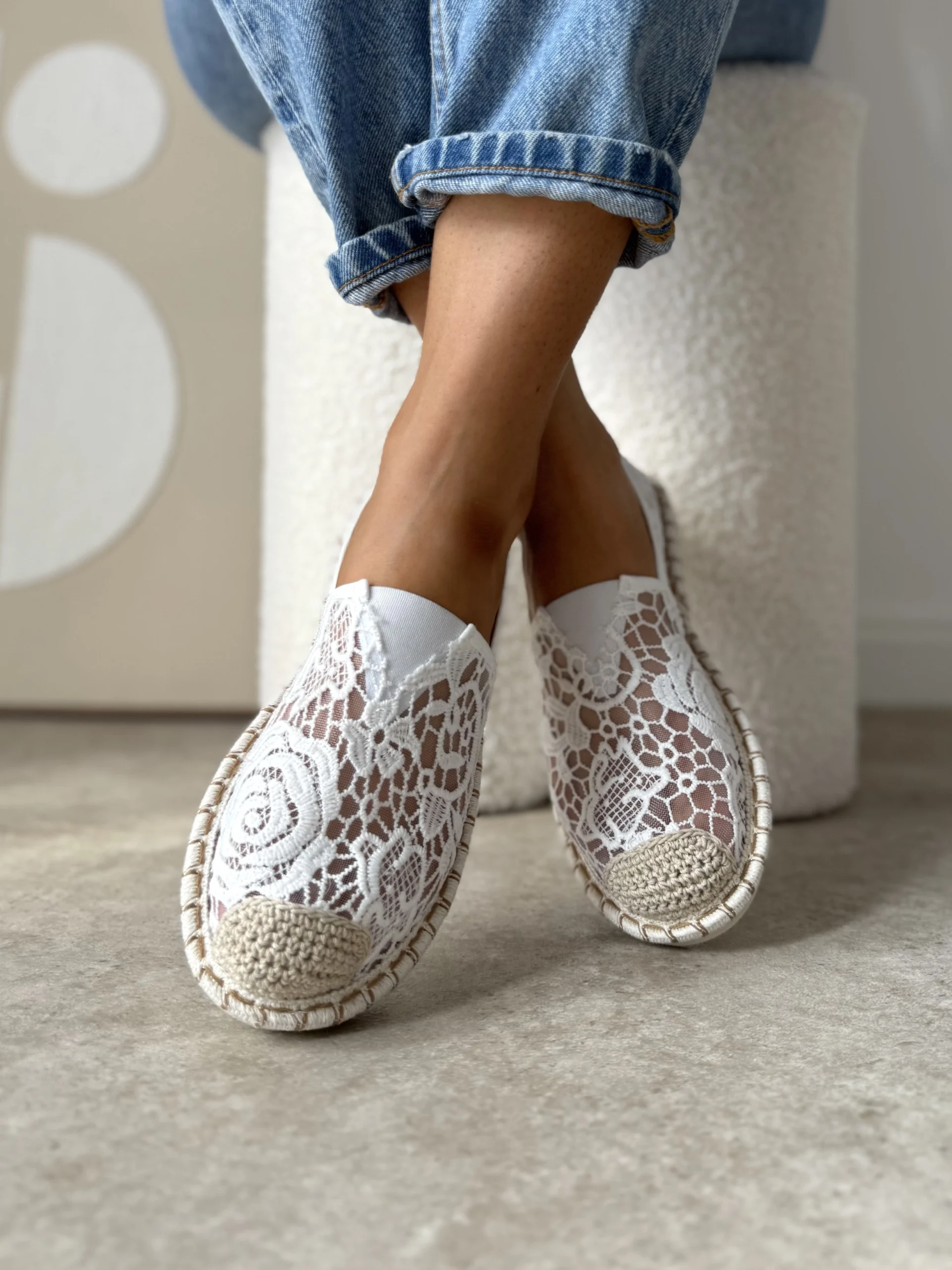 Urocze espadryle wykonane z materiałowej białej koronki. Sprawdzą się jako obuwie wiosenne oraz letnie. Będą idealnym dopełnieniem wakacyjnych stylizacji na plaże, do biura, na randkę, ale będą także idealnym rozwiązaniem jako obuwie zamienne dla Panny Młodej.