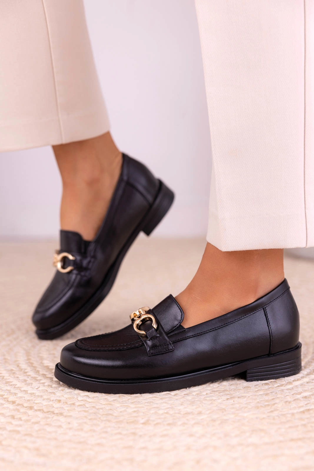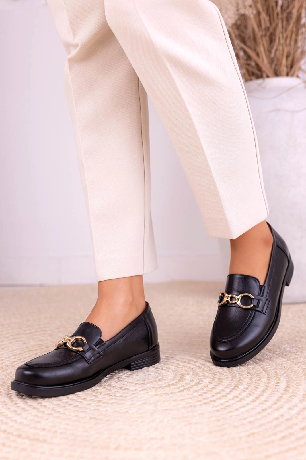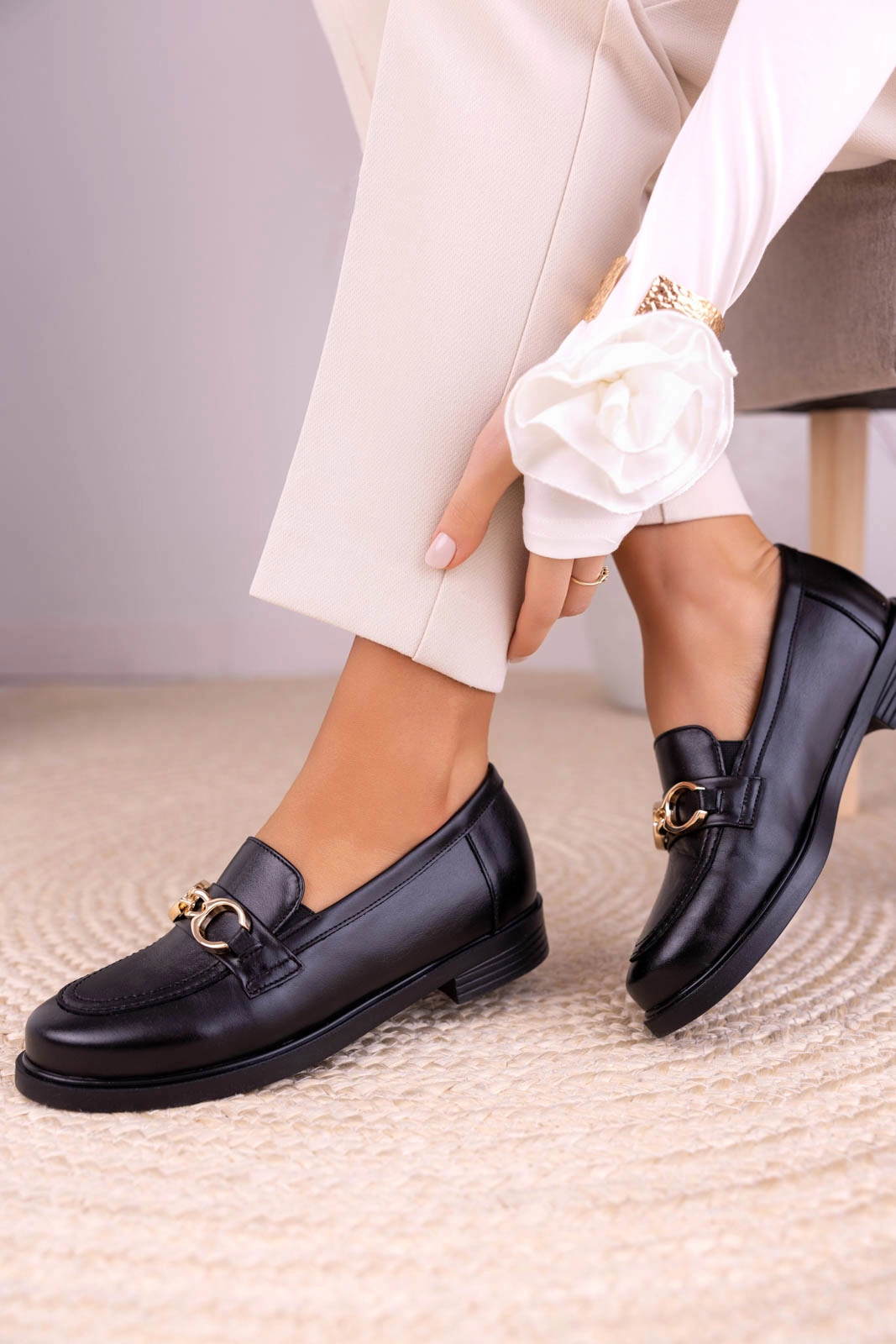 Klasyczny design został uzupełniony o elegancką złotą klamrę, która przyciąga wzrok i podkreśla luksusowy charakter obuwia. Z jednej strony nadaje butom elegancji, a z drugiej sprawia, że są bardziej uniwersalne – pasują zarówno do minimalistycznych stylizacji, jak i do bardziej szykownych zestawów. Dzięki połączeniu czerni i złota mokasyny stają się dodatkiem, który uzupełnia każdą garderobę.