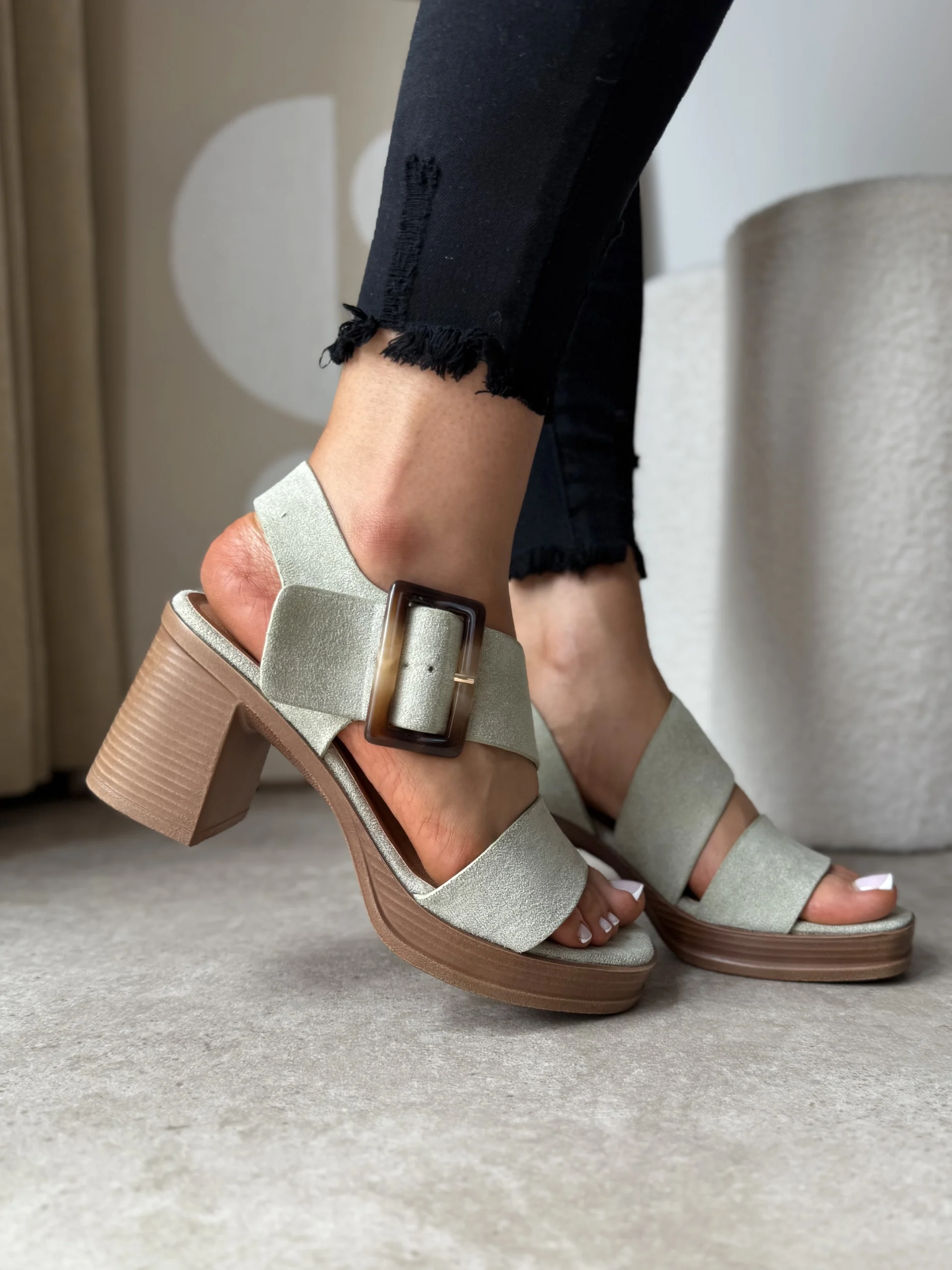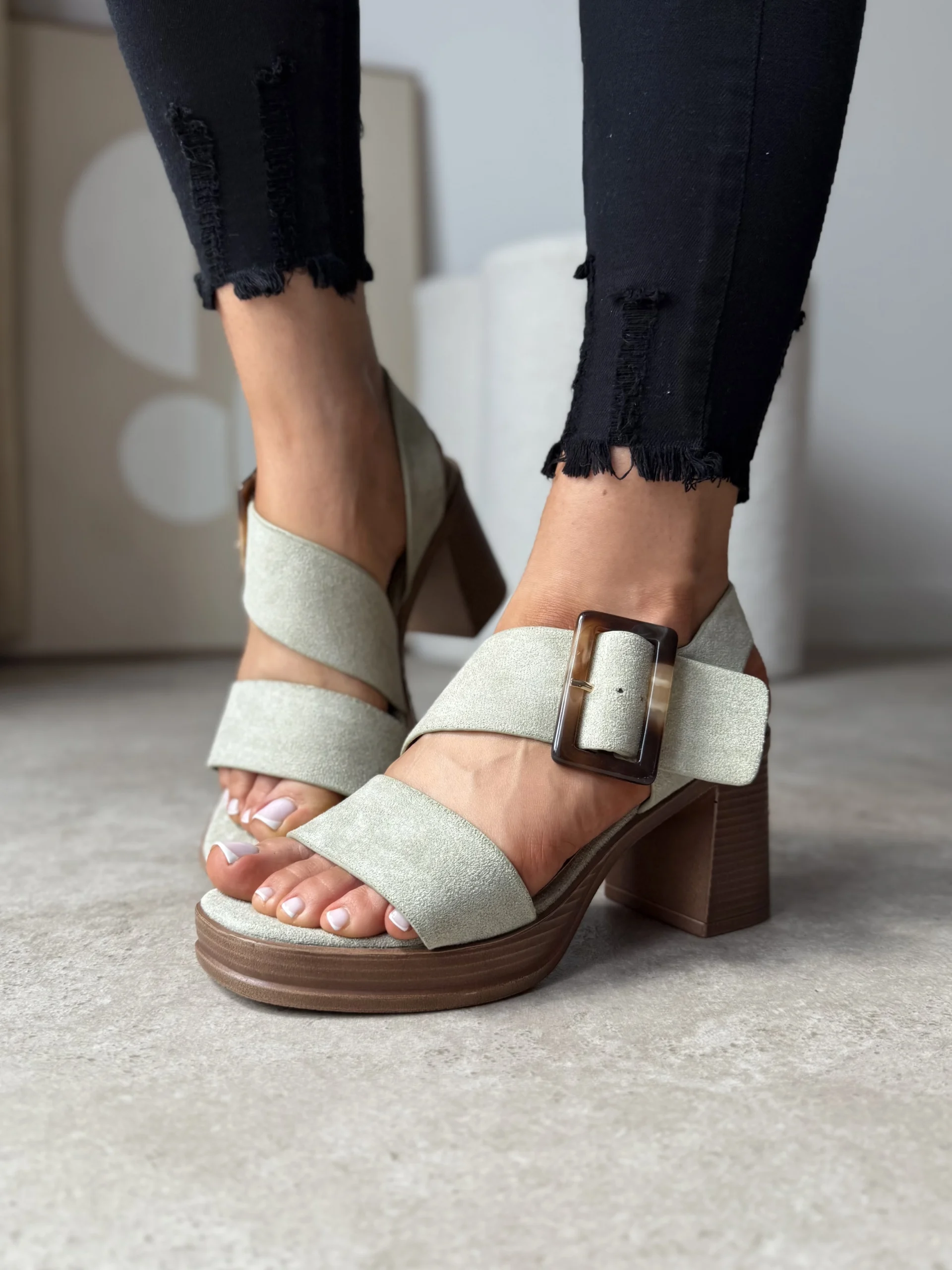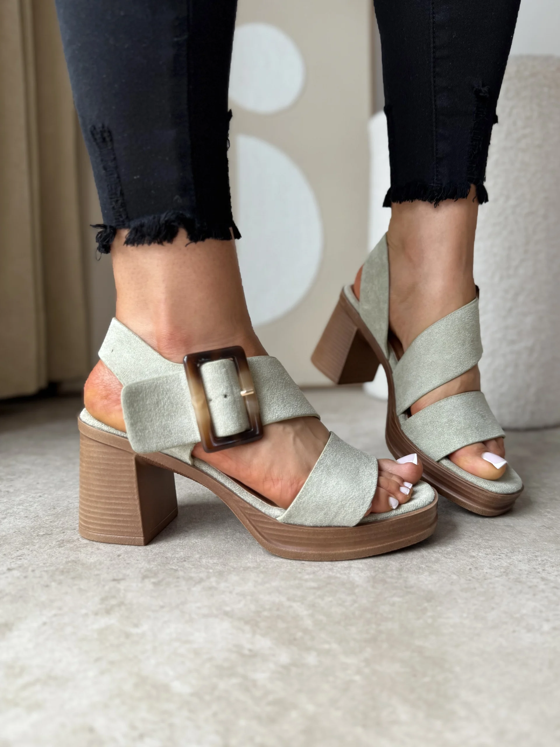 Buty wykonane są z miękkiego eko zamszu w modnym, pistacjowym odcieniu. Co więcej, dzięki zastosowaniu szerokich pasków i ozdobnej klamry, sandały świetnie trzymają się stopy i zapewniają stabilność. Obcas o wysokości 8 cm w formie słupka ułatwia chodzenie, a 2-centymetrowa platforma dodatkowo redukuje odczuwalną wysokość. Wkładka z eko skóry zapewnia miękkość i dobrą amortyzację – dlatego ten model sprawdzi się również podczas długich spacerów.