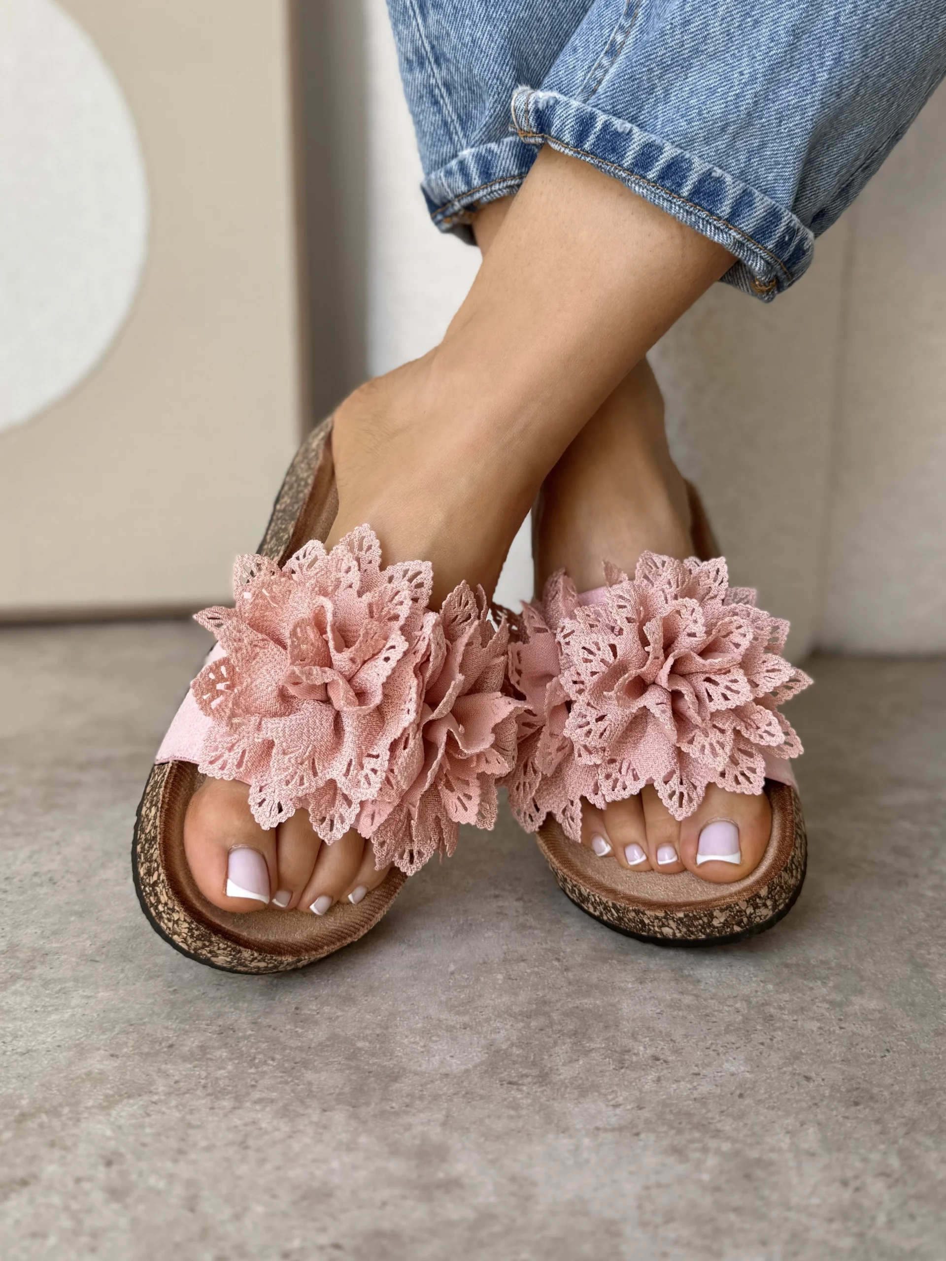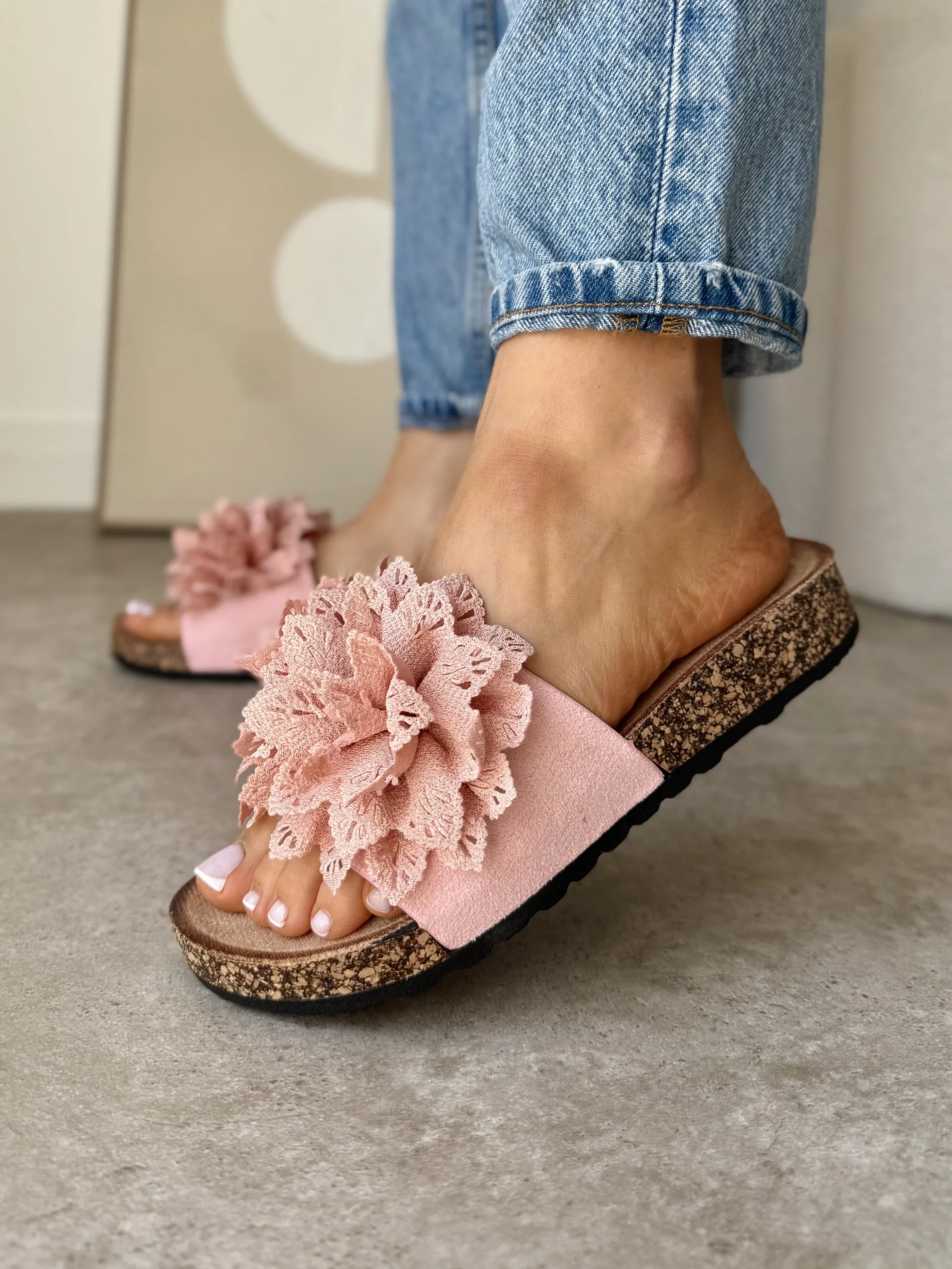 Projektanci postawili na subtelne, ale efektowne detale. Główną ozdobą klapek jest duży kwiat z koronki, umieszczony na szerokim pasku z eko zamszu. Dzięki temu buty przyciągają uwagę i dodają uroku każdej letniej stylizacji. Różowe klapki z kwiatem idealnie pasują do sukienek, spódnic, a nawet jeansów.