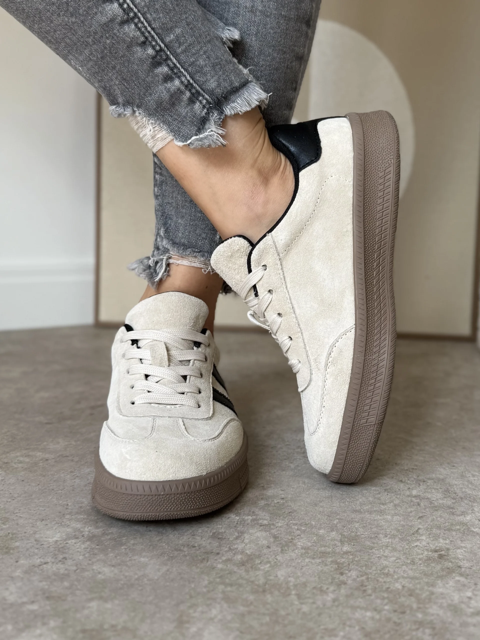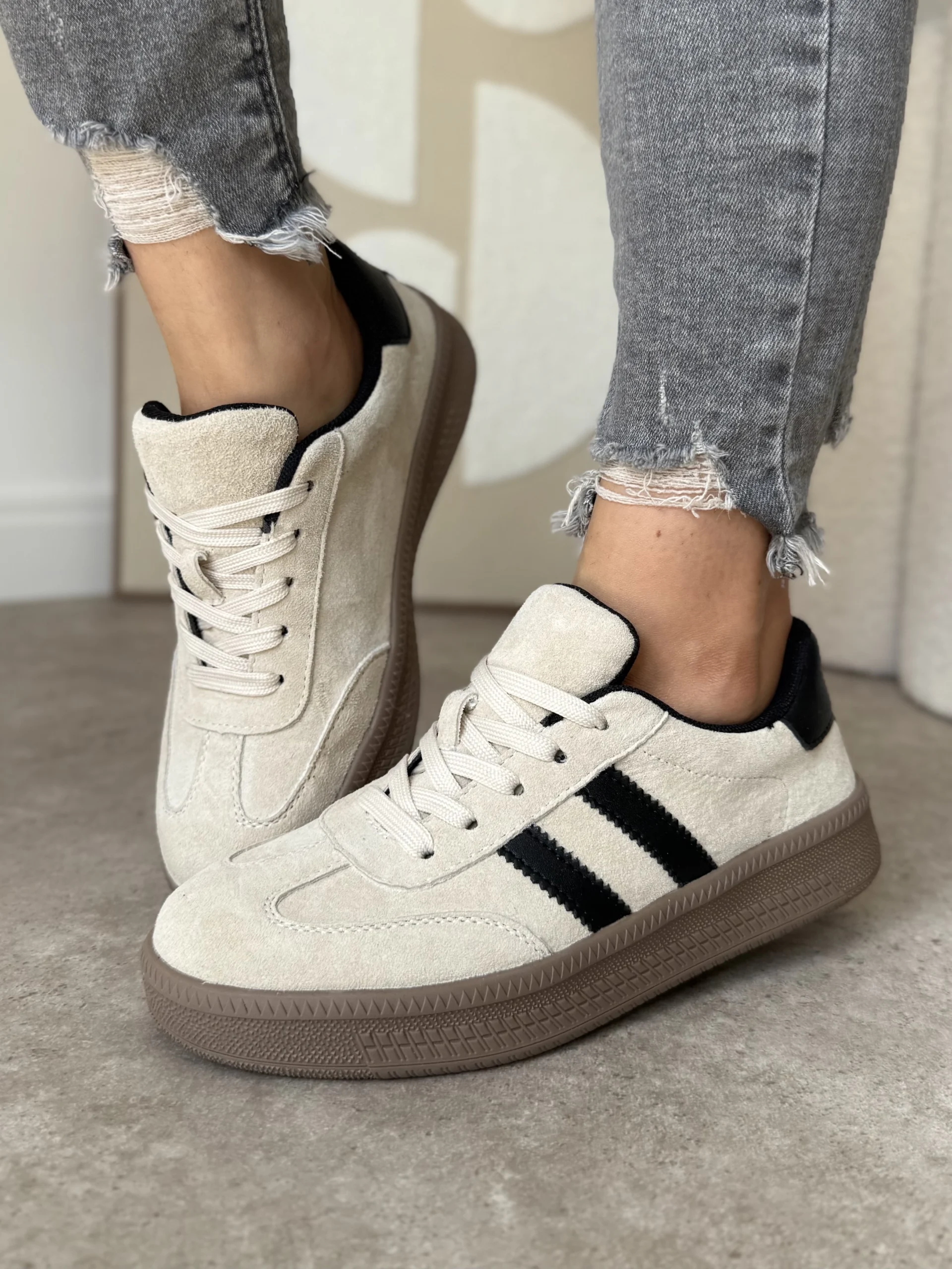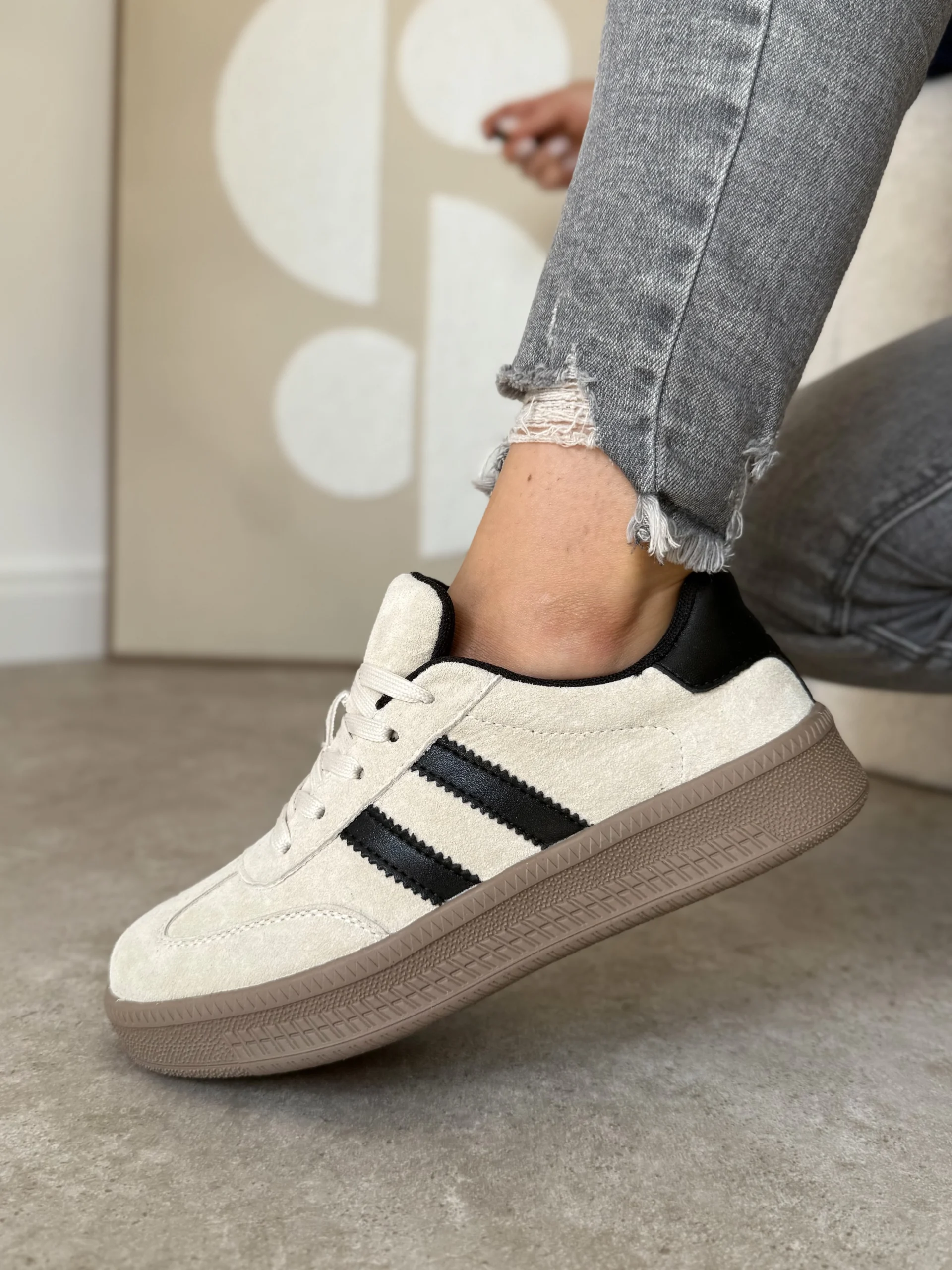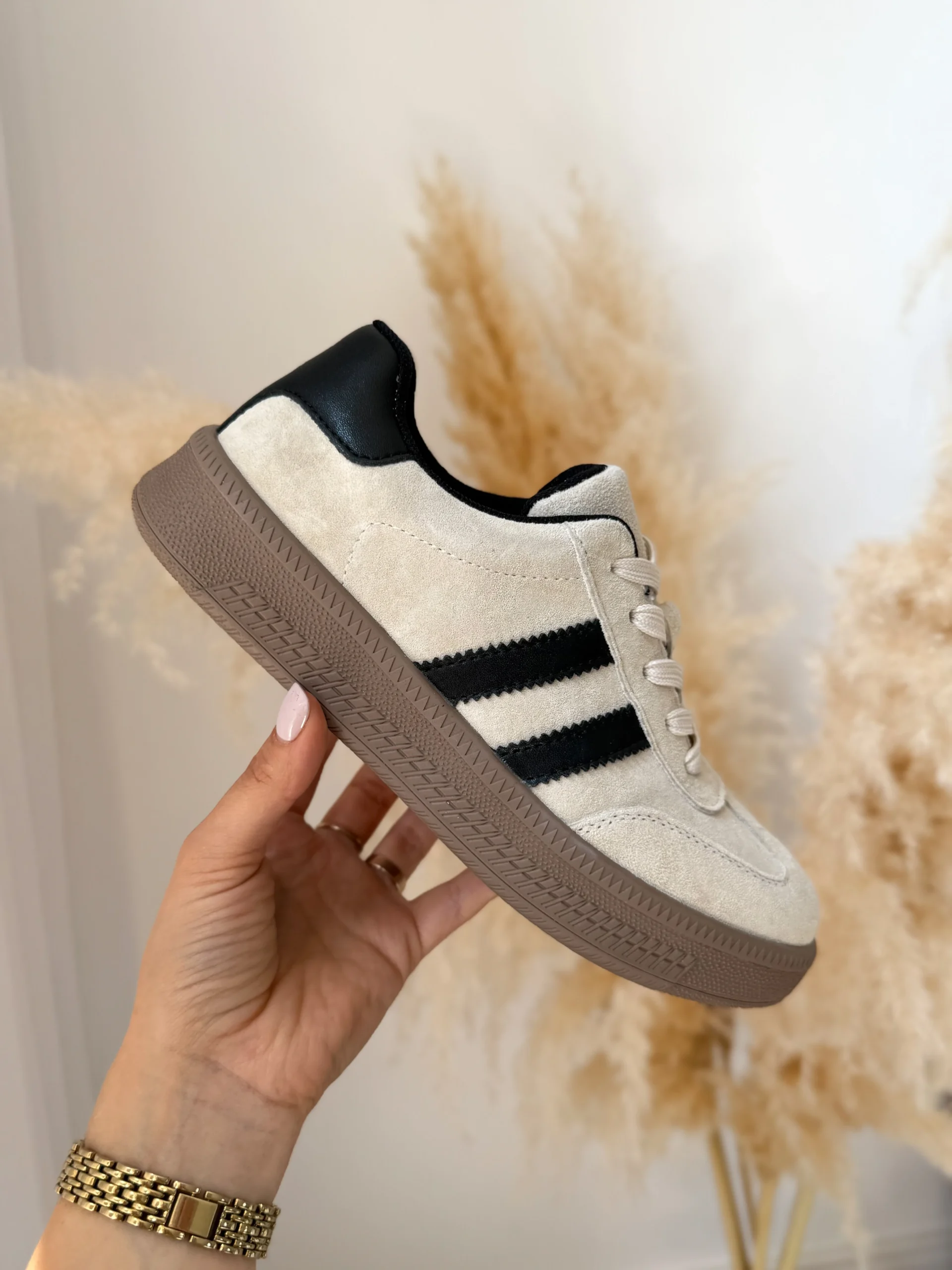 Beżowe skórzane adidasy LULA 100 z czarnymi paskami i brązową podeszwą – widok z boku i na stopie.