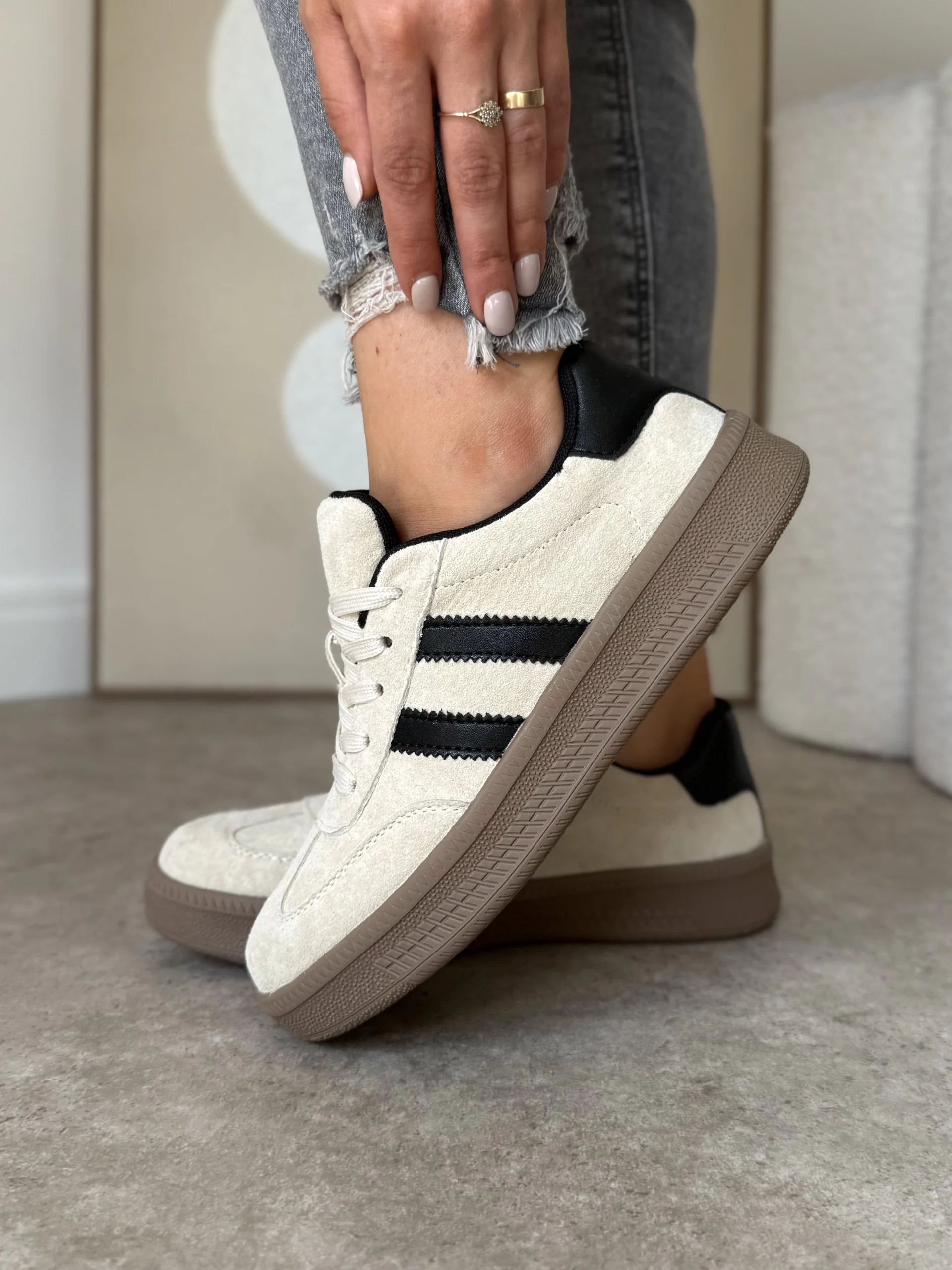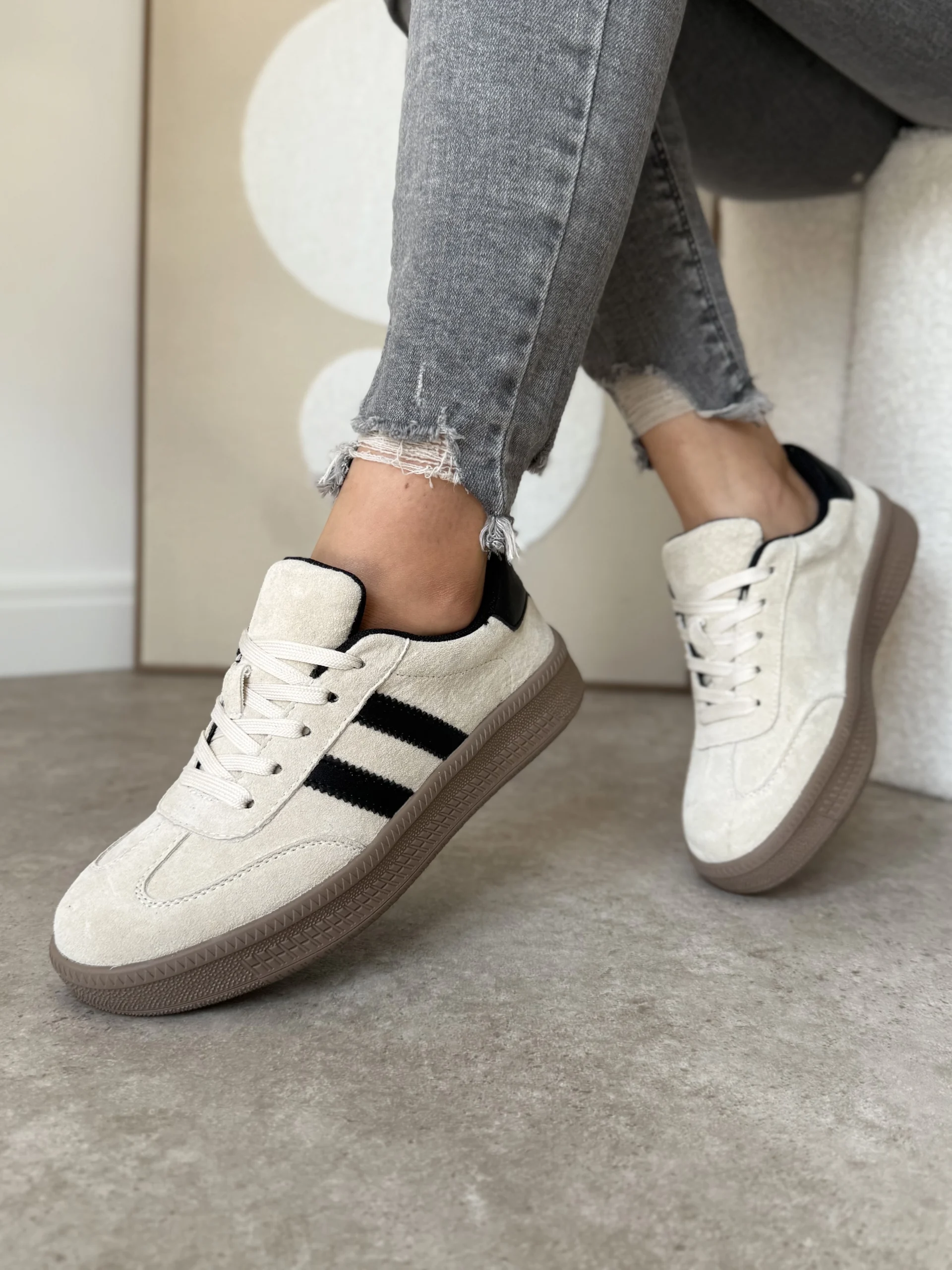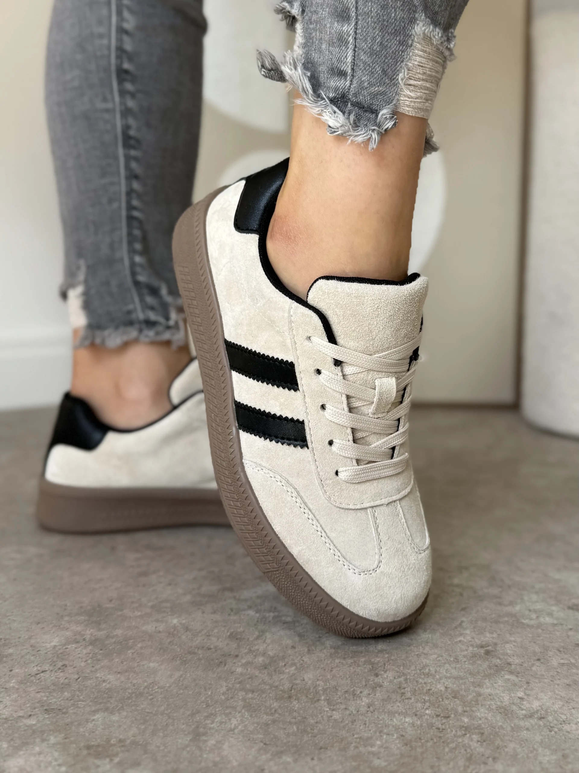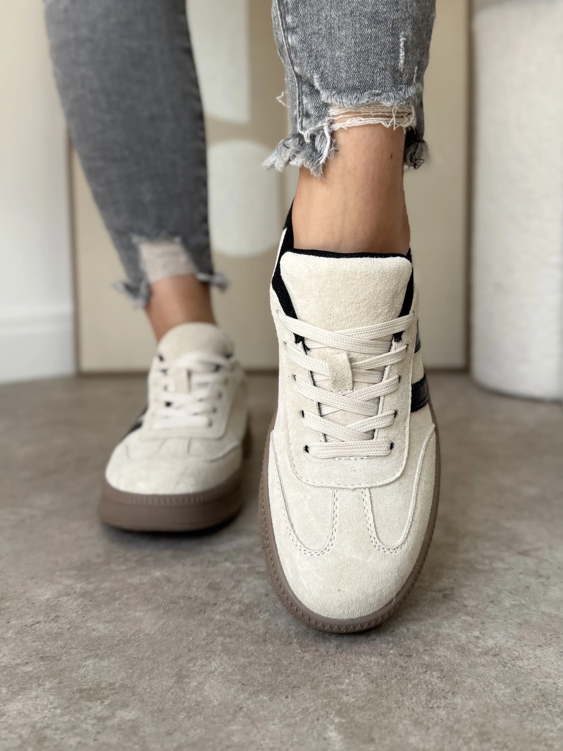 Beżowe skórzane adidasy LULA 100 z czarnymi paskami i brązową podeszwą – widok z boku i na stopie.