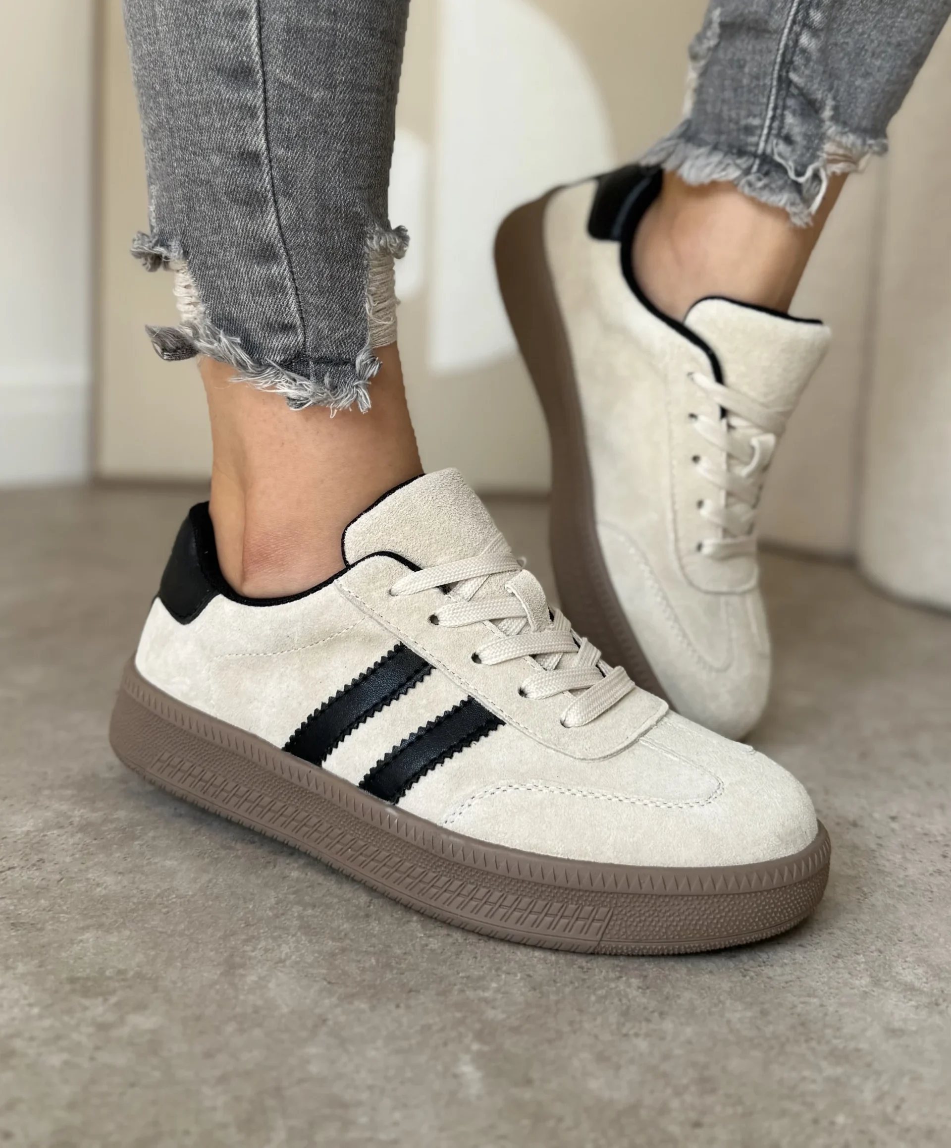 Jasny, chłodny odcień beżu w połączeniu z czarnymi paskami i tylną wstawką tworzy efektowny kontrast. Dzięki temu buty pasują zarówno do casualowych jeansów, jak i zwiewnych sukienek. To uniwersalny model na wiele okazji – od codziennych spacerów po spotkania ze znajomymi.