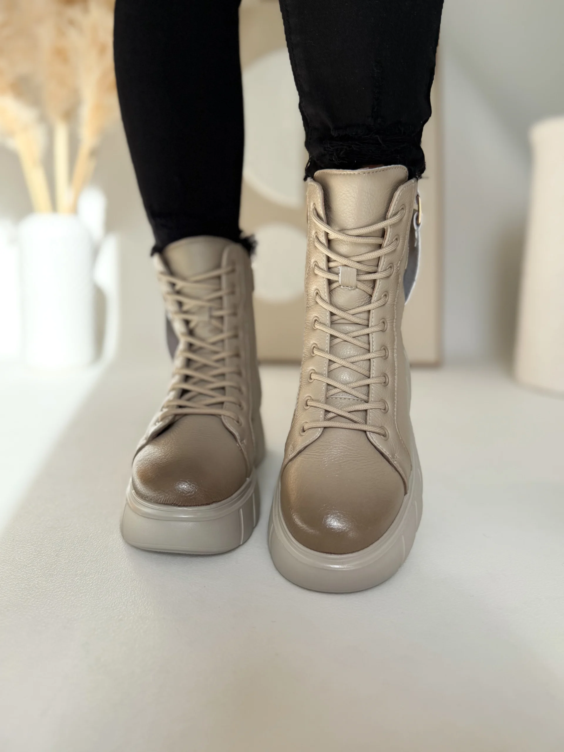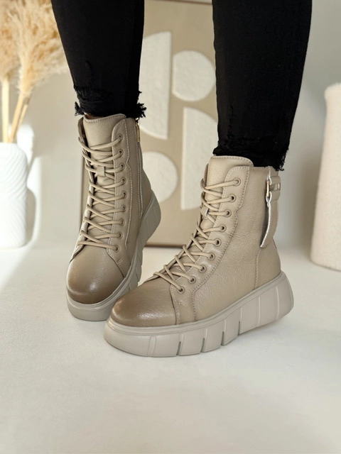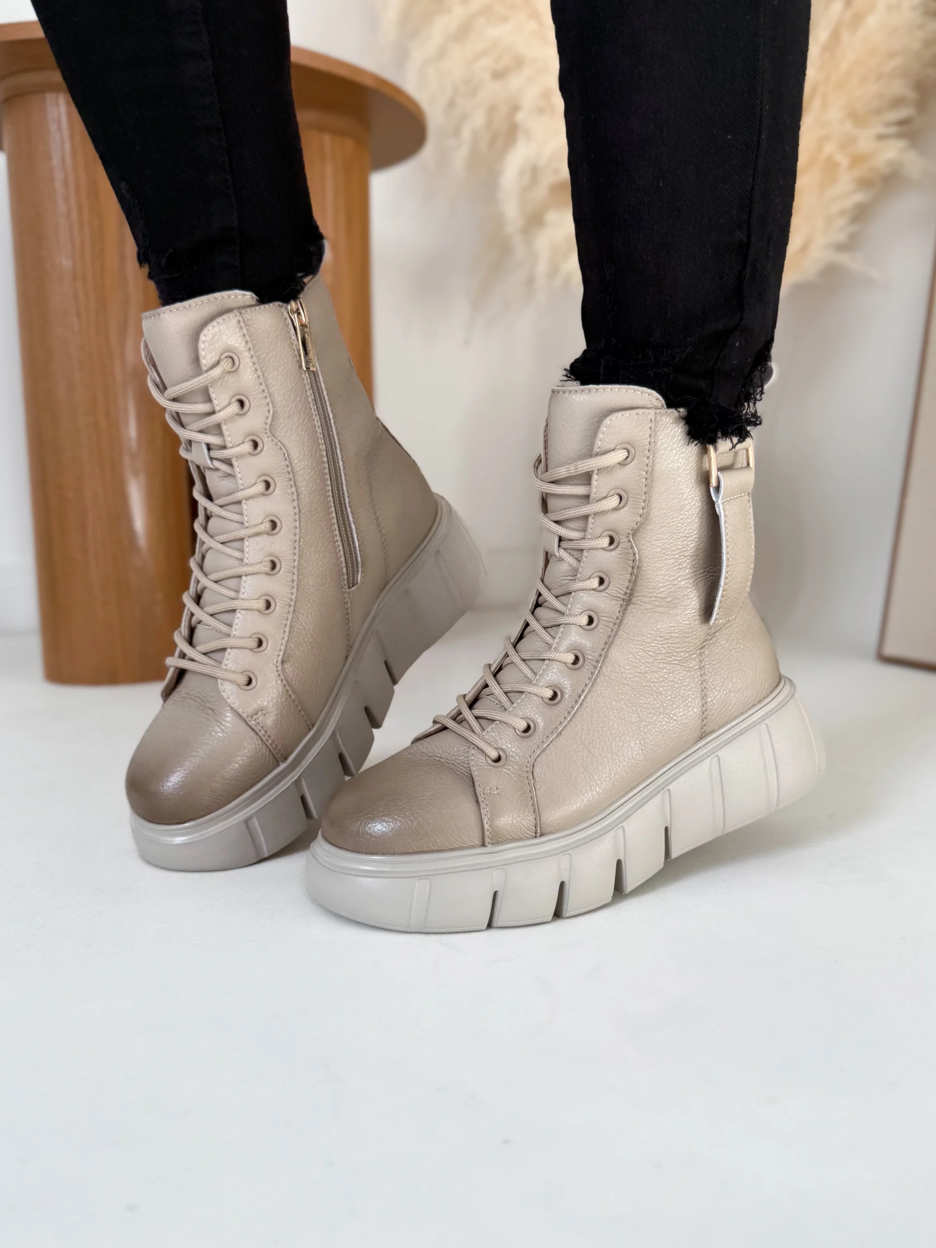 Projektanci zadbali o detale. Wysoka cholewka stabilizuje kostkę, a boczny zamek pozwala błyskawicznie założyć buty. Sznurowanie umożliwia idealne dopasowanie do stopy. Lekką platformę o wysokości 4–5,5 cm zaprojektowano tak, by dodała kilku centymetrów wzrostu i zapewniła wygodę przy każdym kroku.