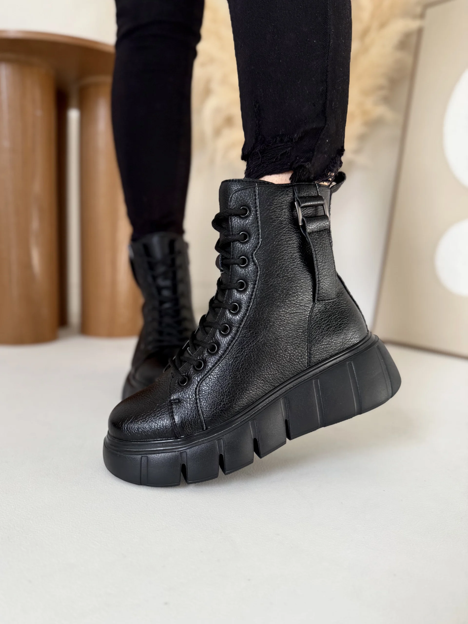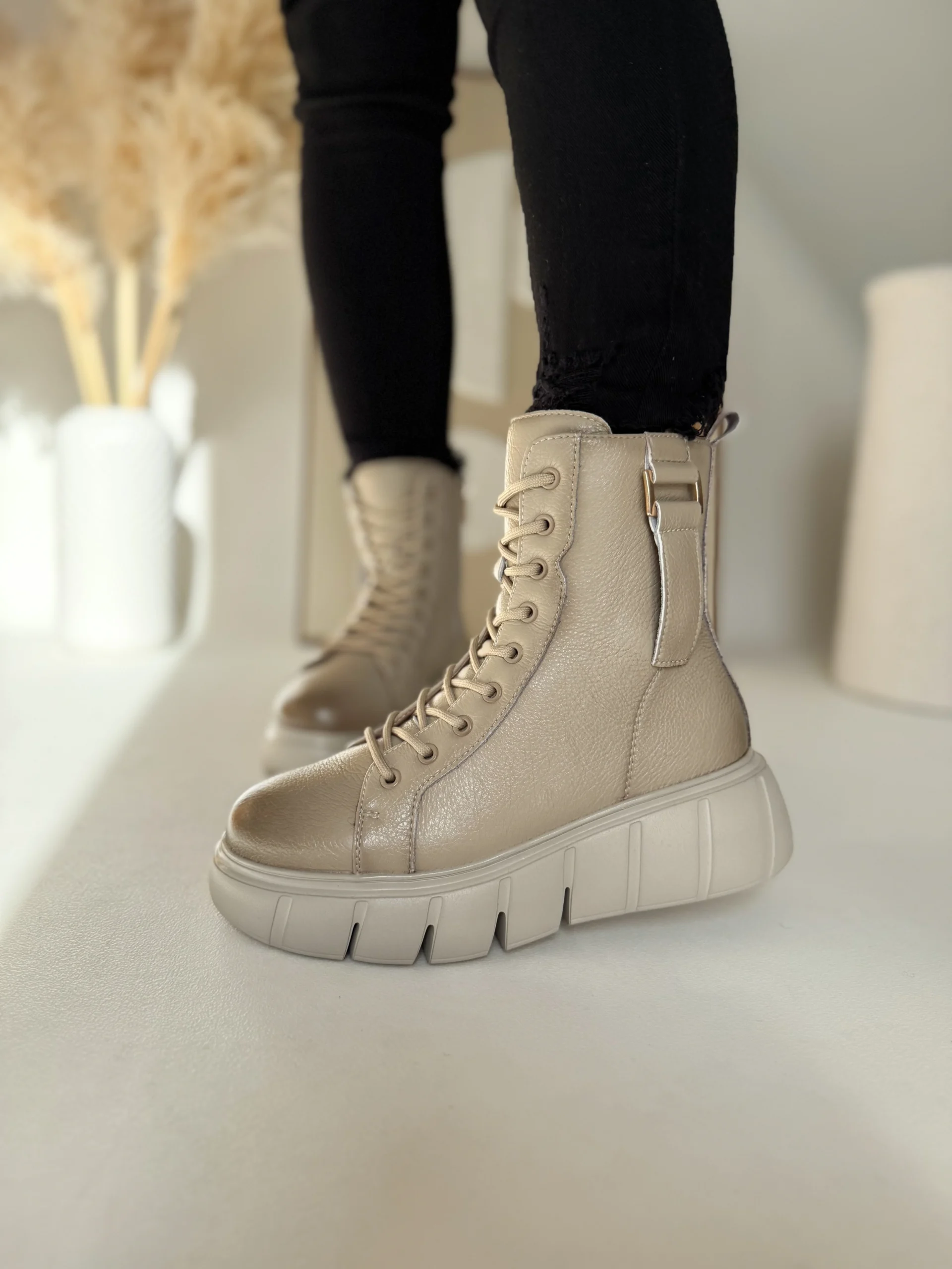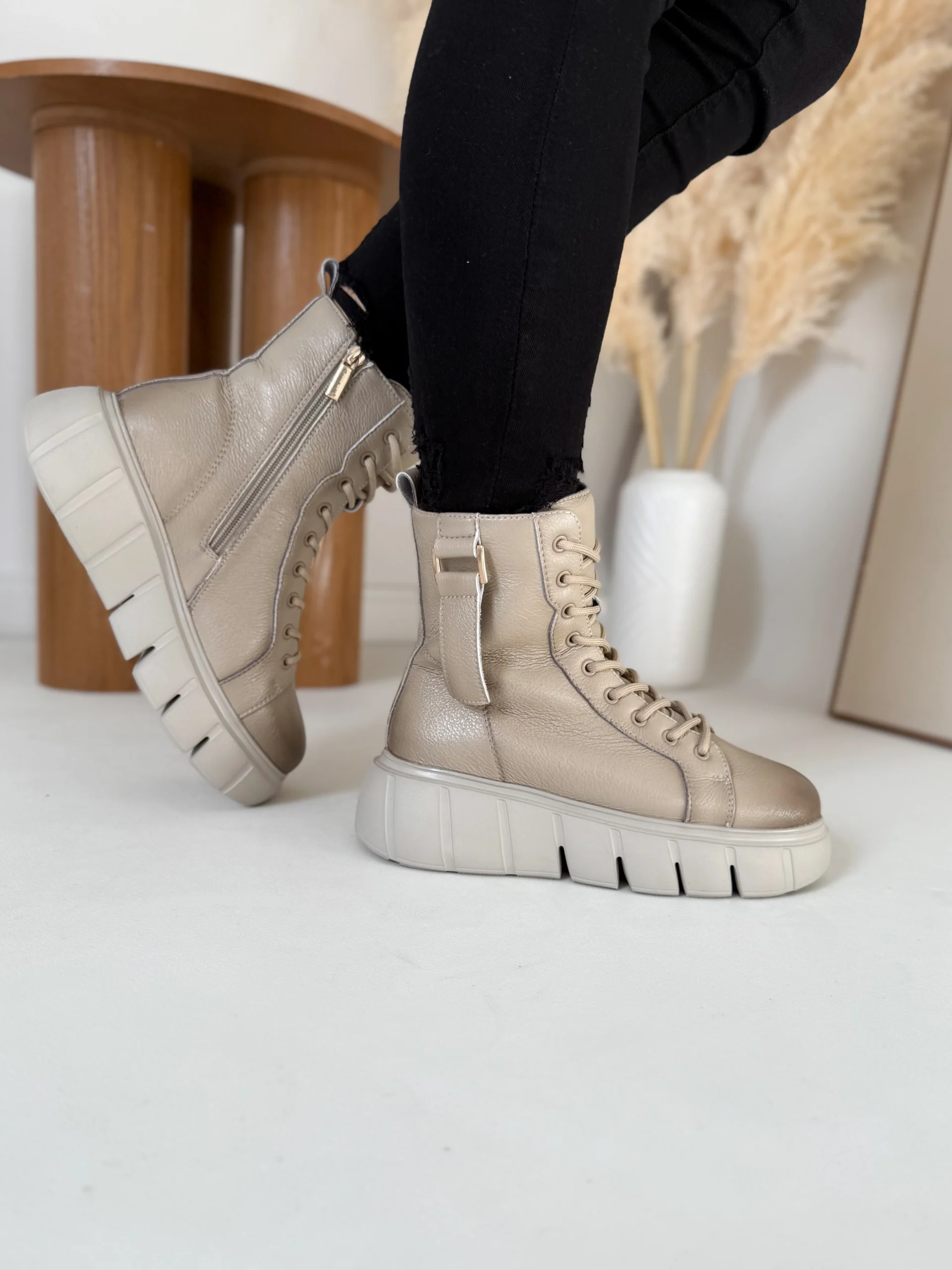 Projektanci zadbali o detale. Wysoka cholewka stabilizuje kostkę, a boczny zamek pozwala błyskawicznie założyć buty. Sznurowanie umożliwia idealne dopasowanie do stopy. Lekką platformę o wysokości 4–5,5 cm zaprojektowano tak, by dodała kilku centymetrów wzrostu i zapewniła wygodę przy każdym kroku.