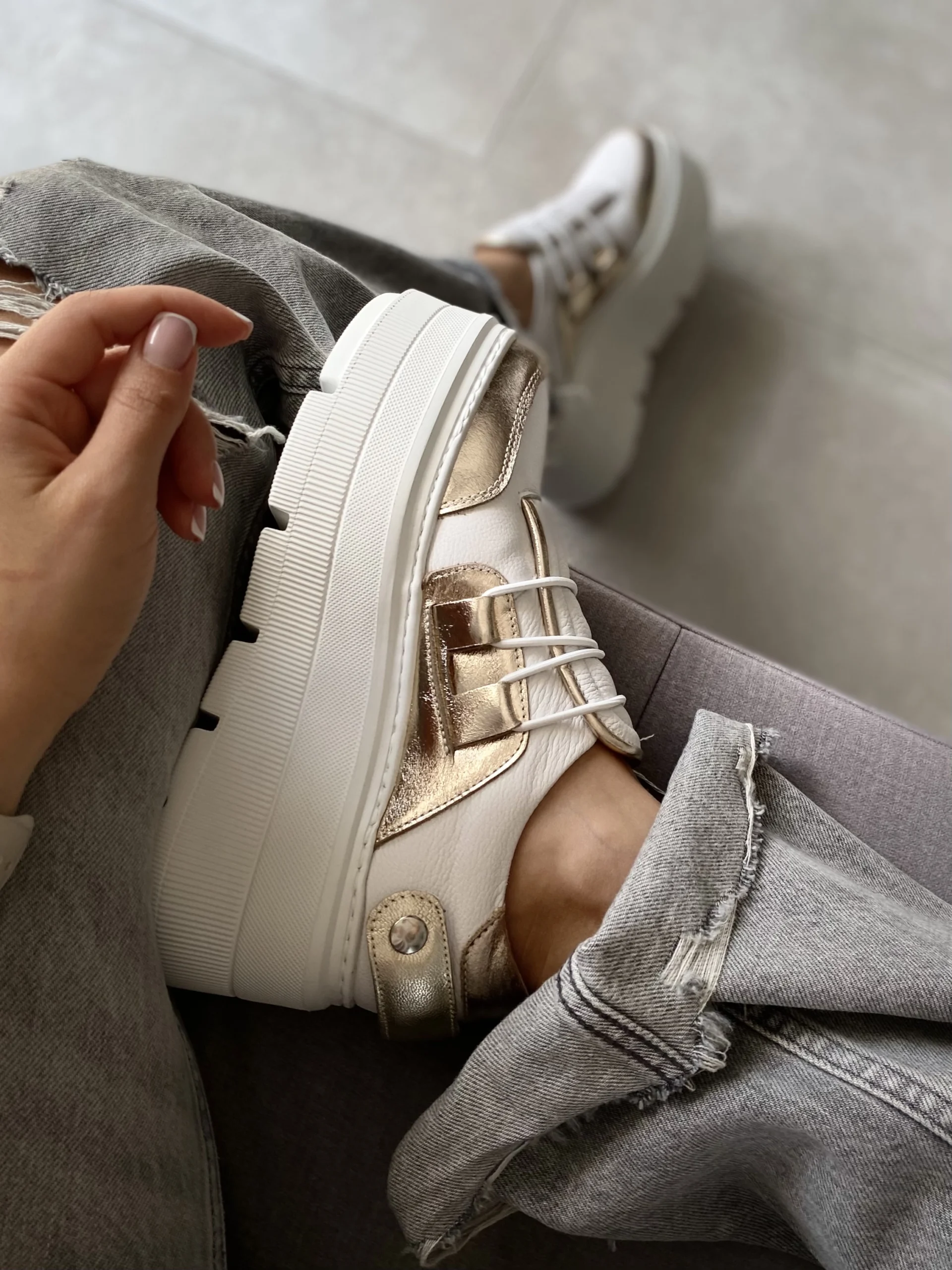 Biało-złote skórzane adidasy platforma LULA 03 łatwo dopasujesz do swojej garderoby. Świetnie wyglądają z jeansami, spodniami materiałowymi oraz dresami. Jednak równie dobrze komponują się z sukienkami i spódnicami. Dlatego sprawdzą się zarówno na co dzień, jak i podczas wyjść do miasta.