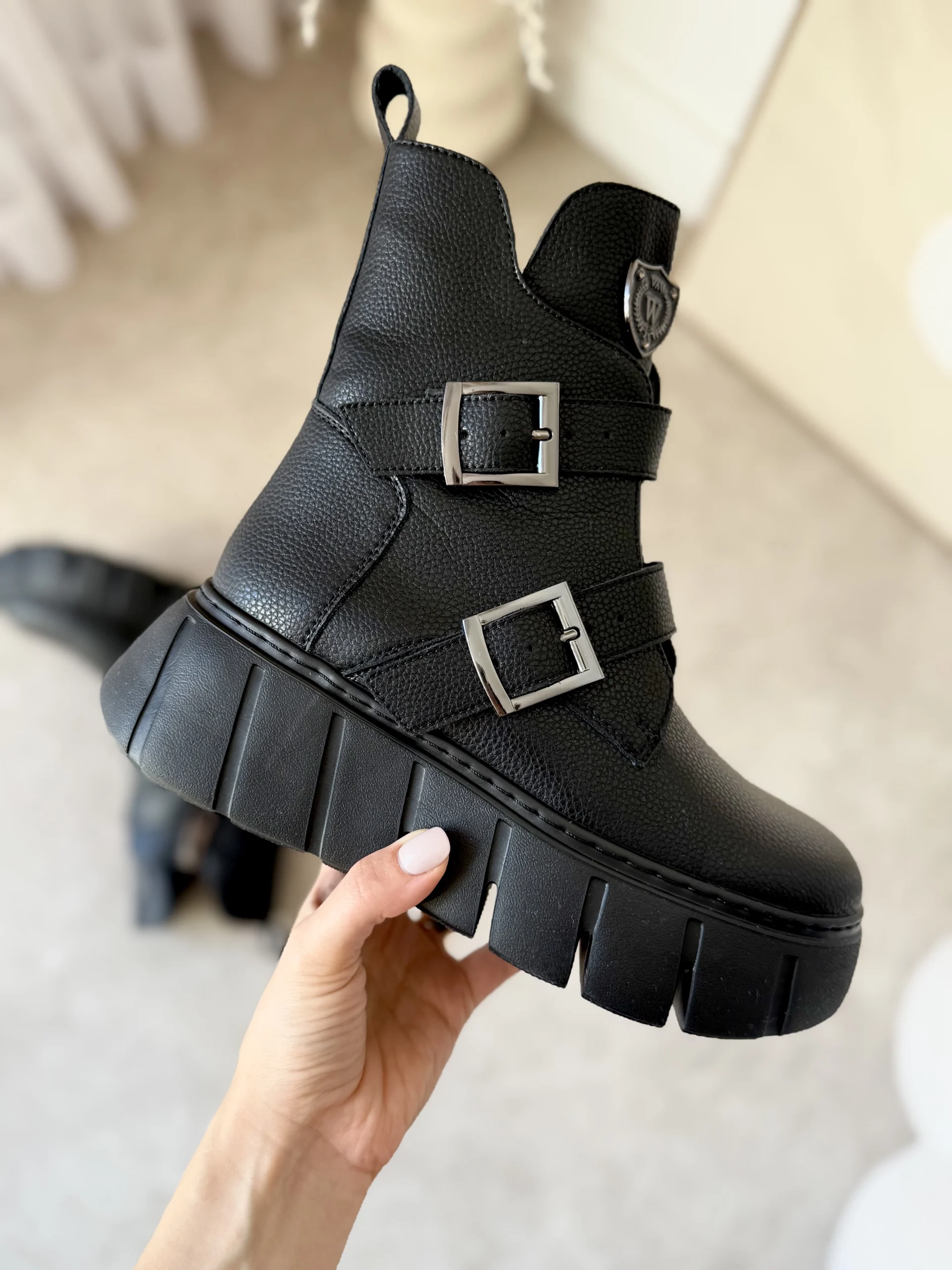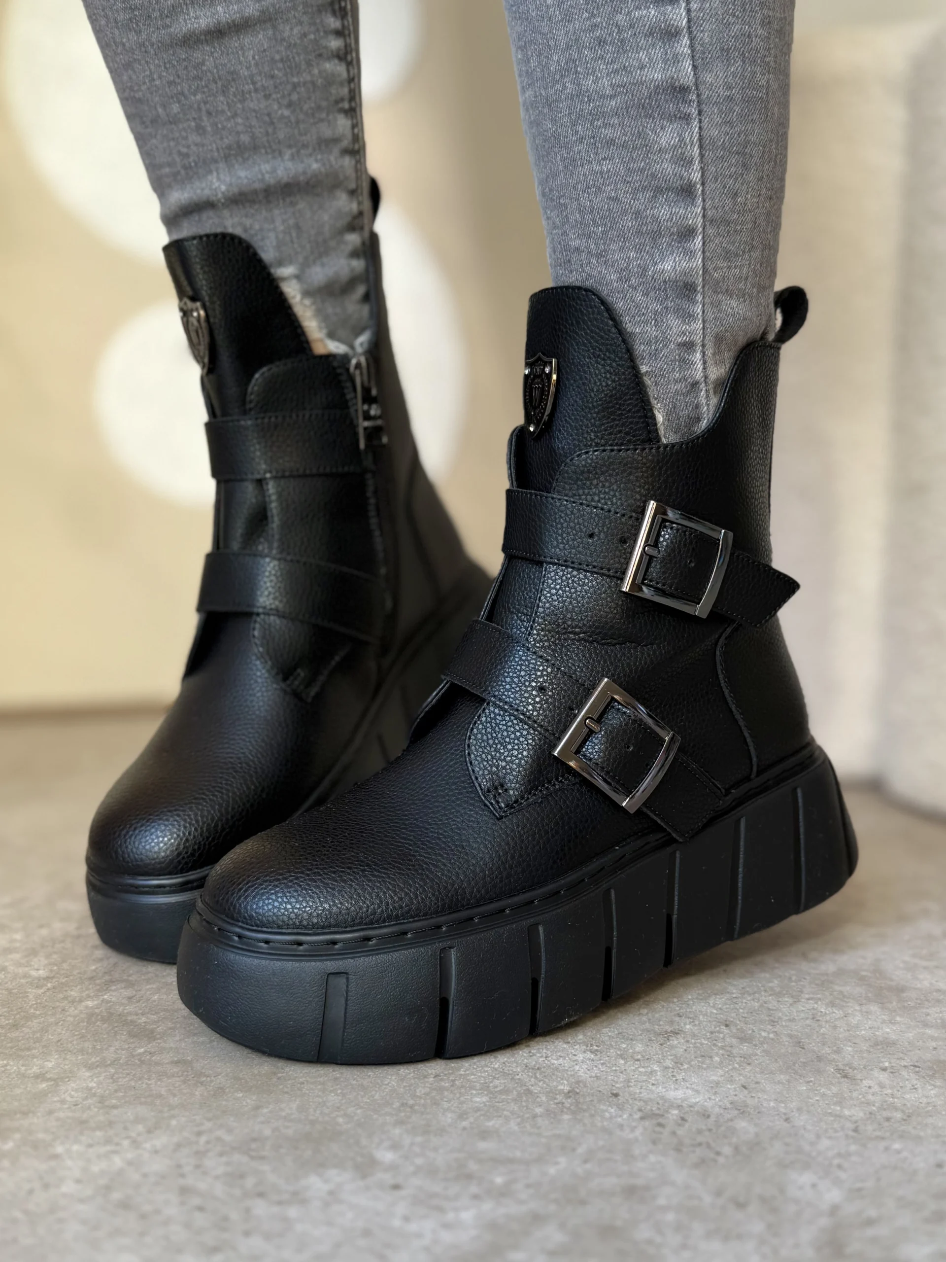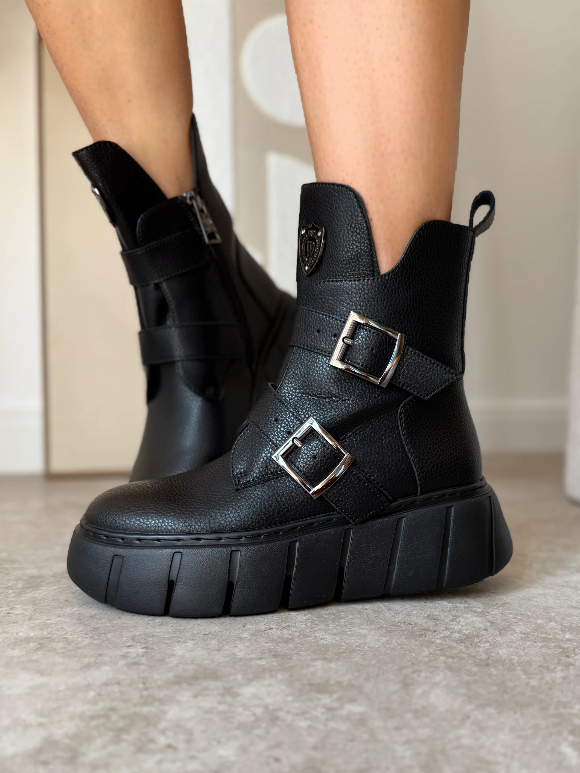 Projektanci zadbali o funkcjonalność i wygląd. Z boku znajduje się praktyczny zamek, który ułatwia szybkie zakładanie i zdejmowanie butów. Dodatkowo, paski z metalowymi klamrami podkreślają nowoczesny, lekko rockowy styl. Na cholewce umieszczono elegancką metalową tarczę z logo, która nadaje botkom charakteru i sprawia, że wyróżniają się na tle klasycznych modeli.