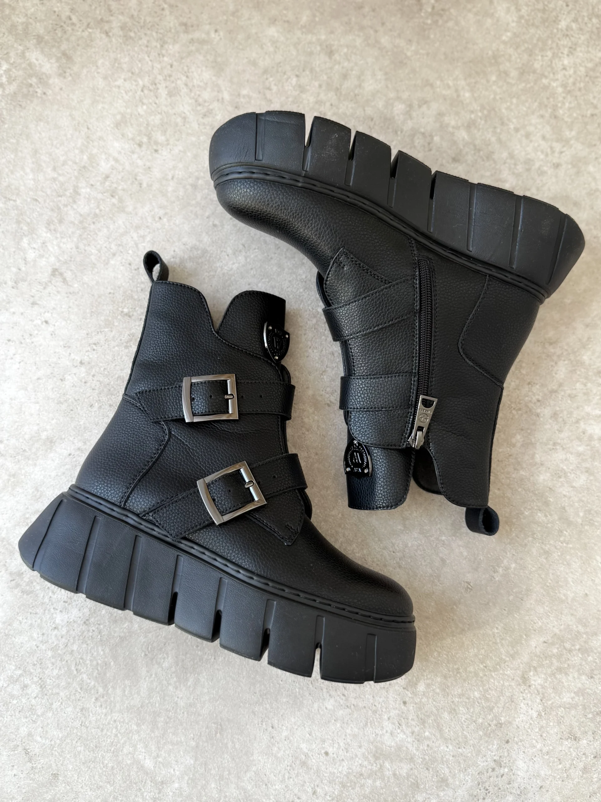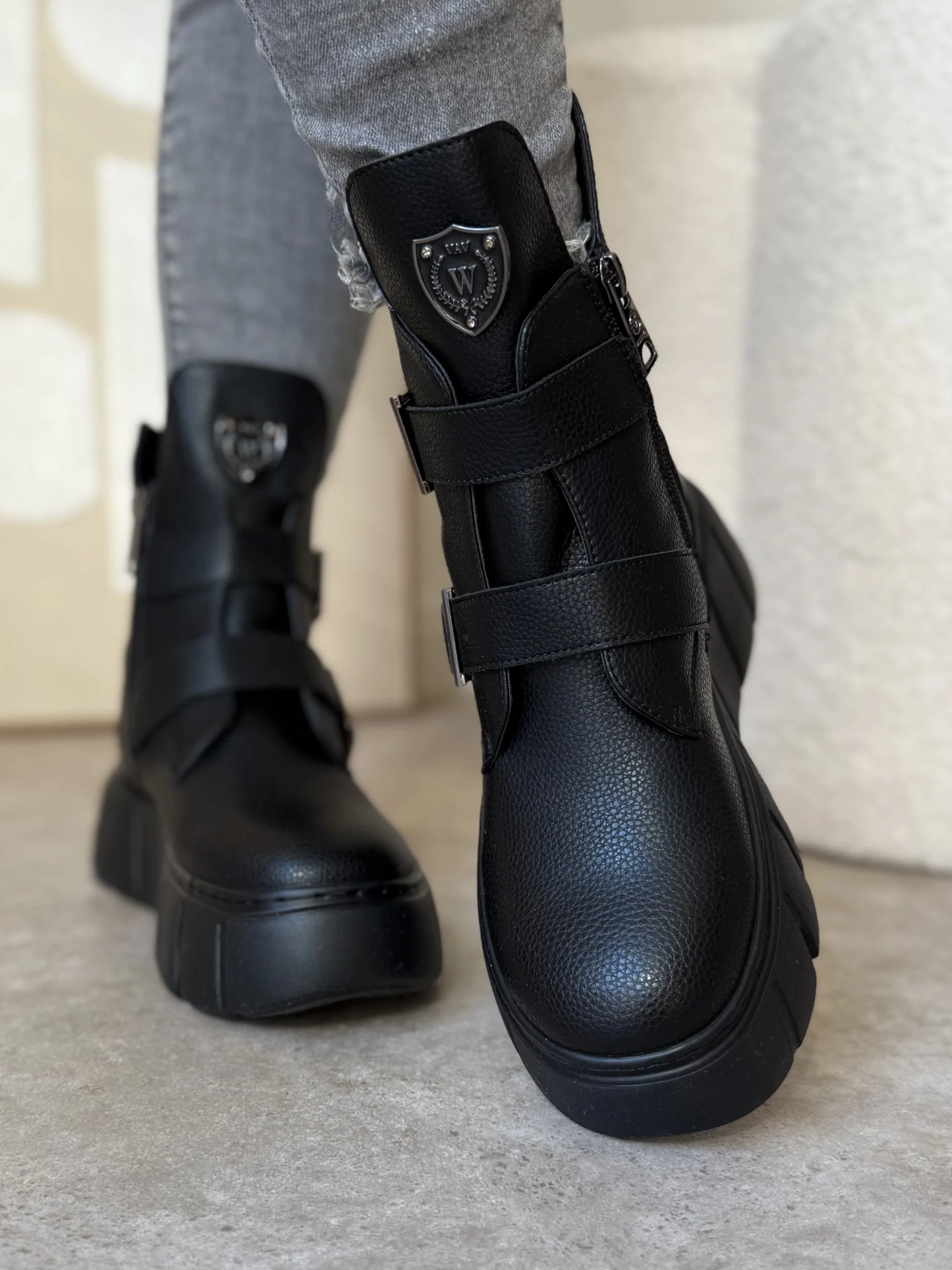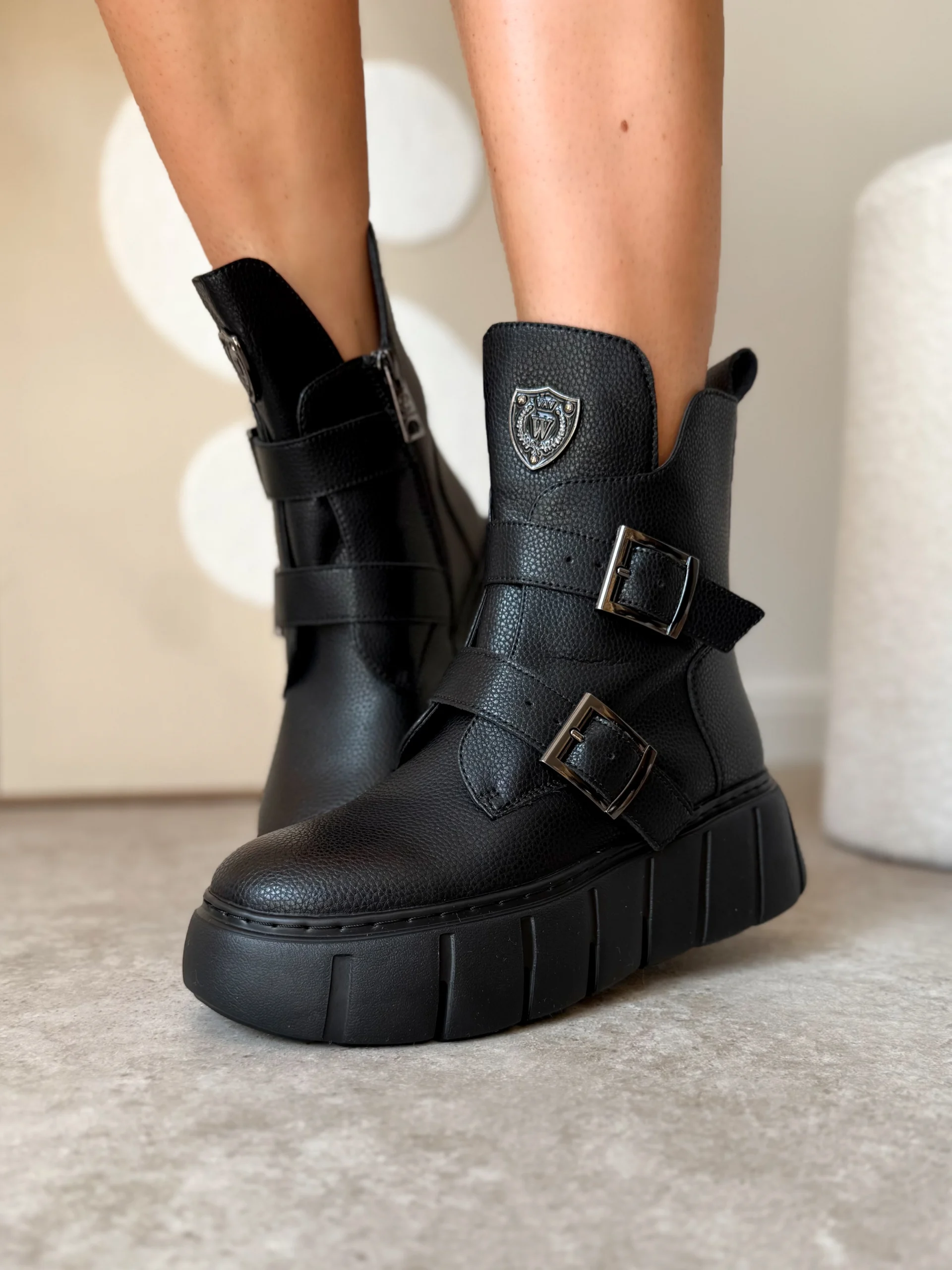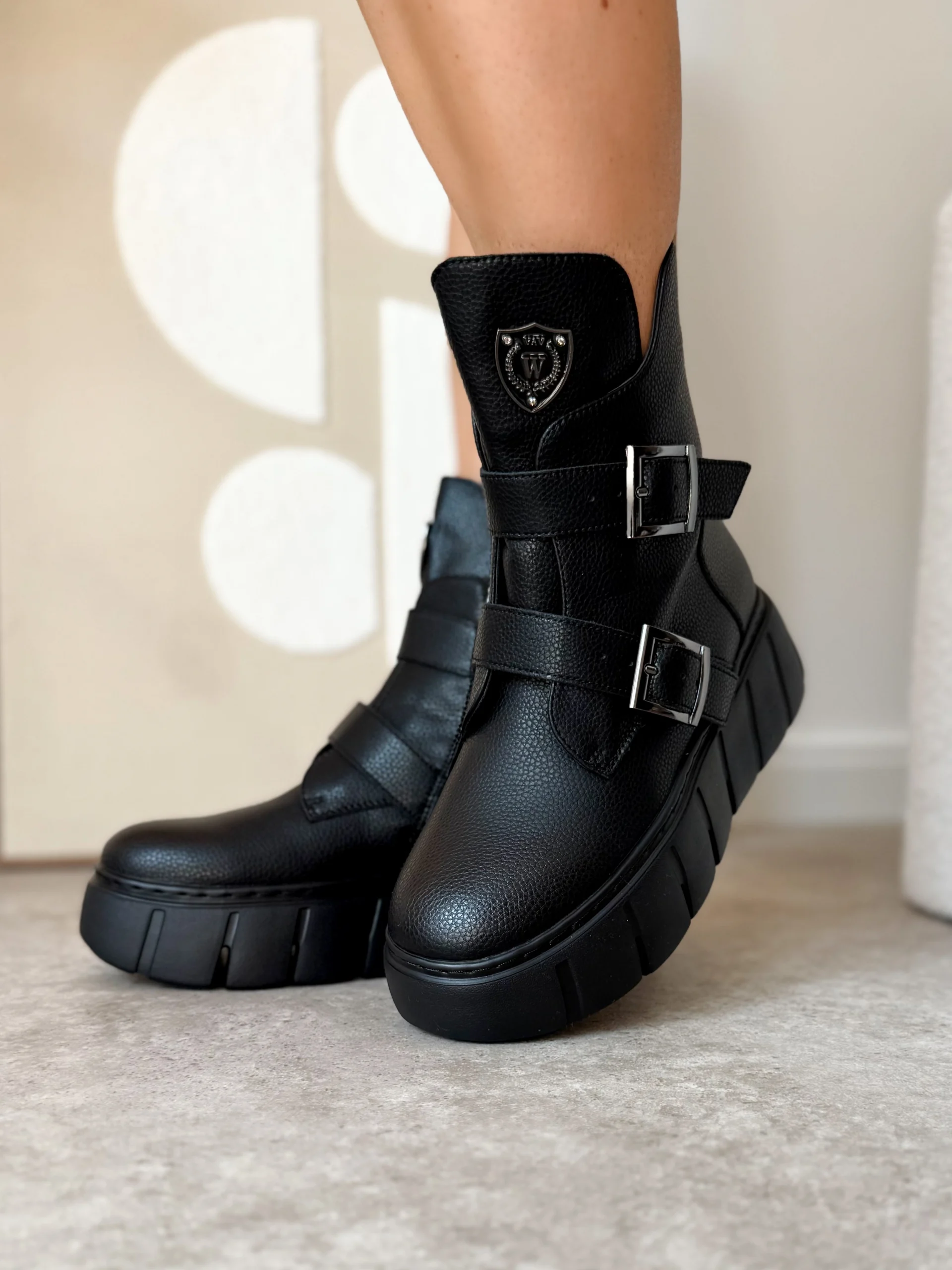 Projektanci zadbali o funkcjonalność i wygląd. Z boku znajduje się praktyczny zamek, który ułatwia szybkie zakładanie i zdejmowanie butów. Dodatkowo, paski z metalowymi klamrami podkreślają nowoczesny, lekko rockowy styl. Na cholewce umieszczono elegancką metalową tarczę z logo, która nadaje botkom charakteru i sprawia, że wyróżniają się na tle klasycznych modeli.