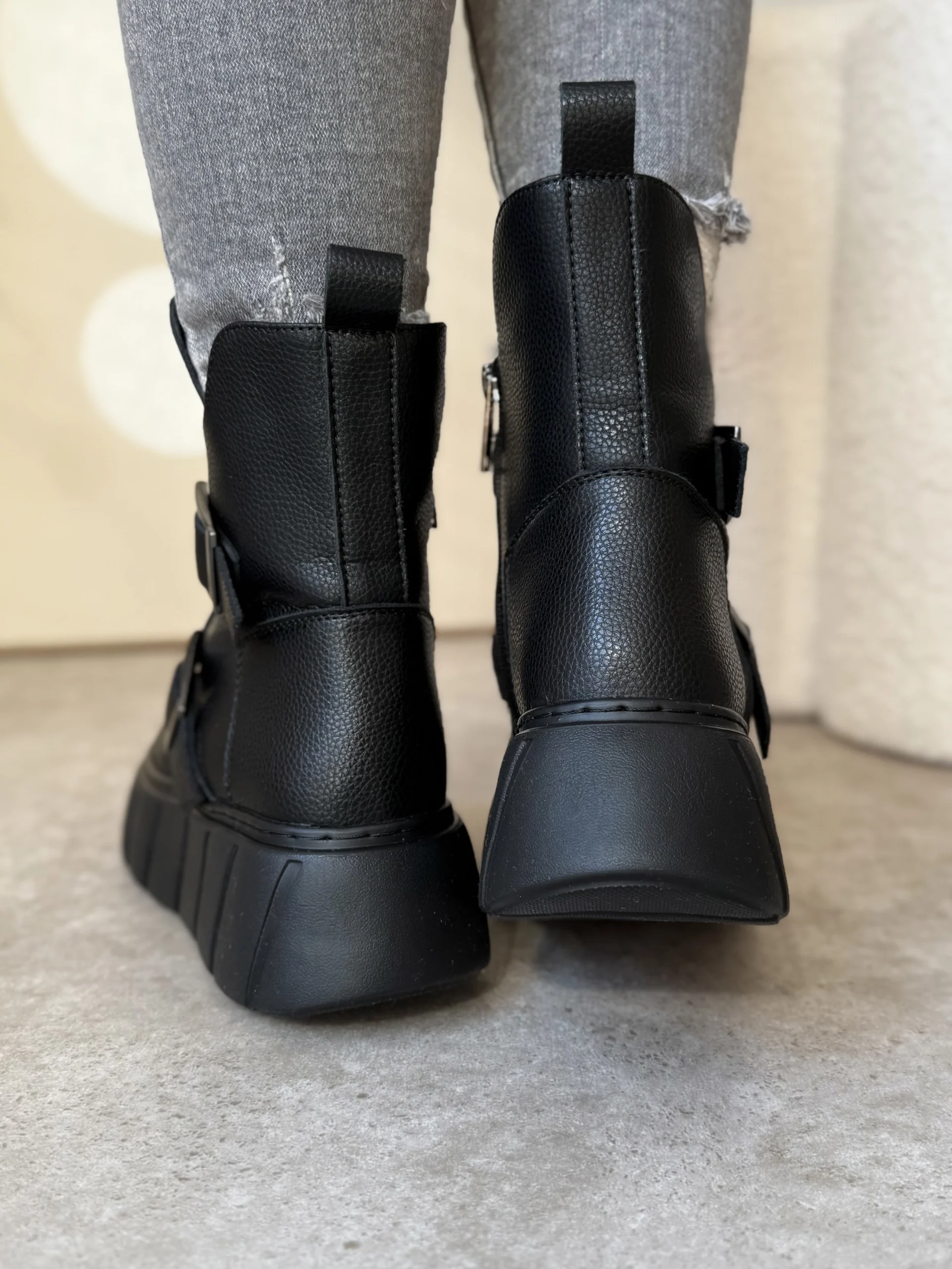 Czarne skórzane botki damskie LULA 106 z ozdobnymi klamrami i sportową podeszwą.