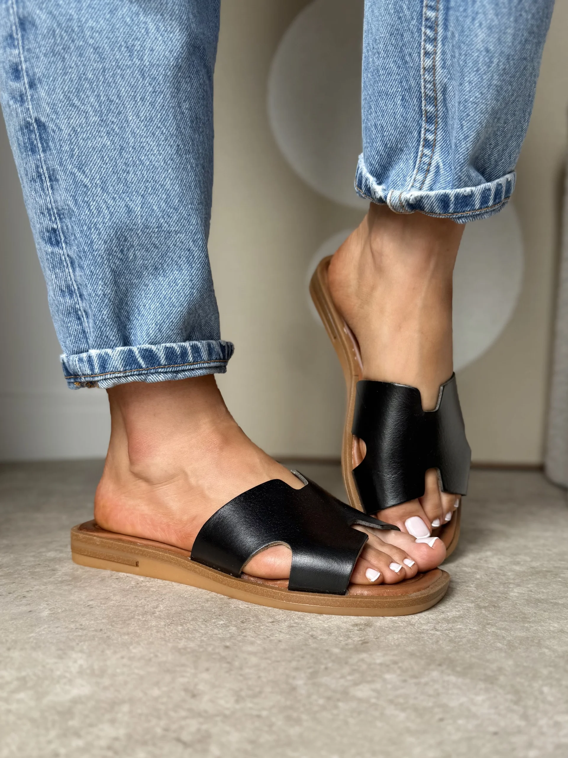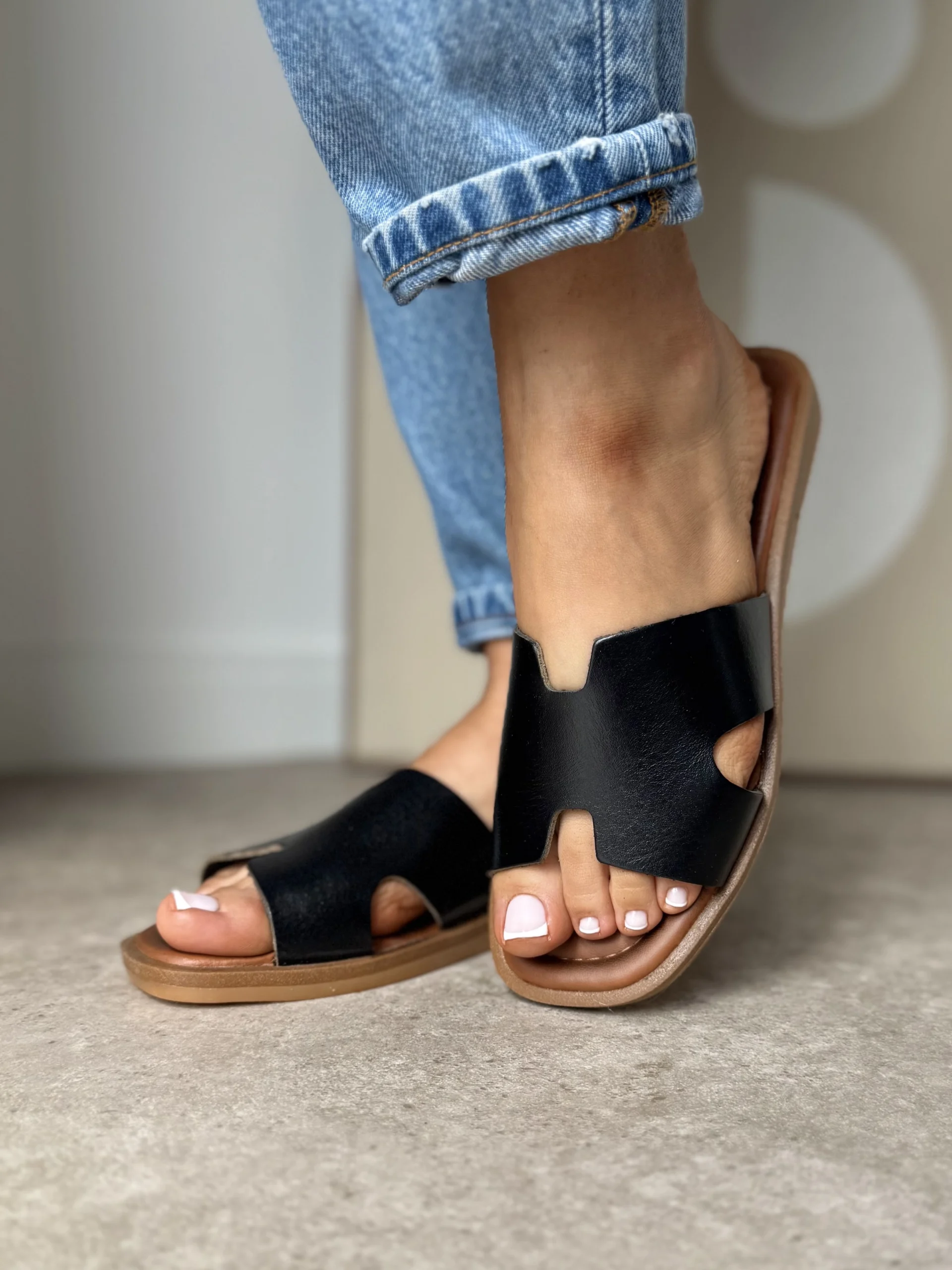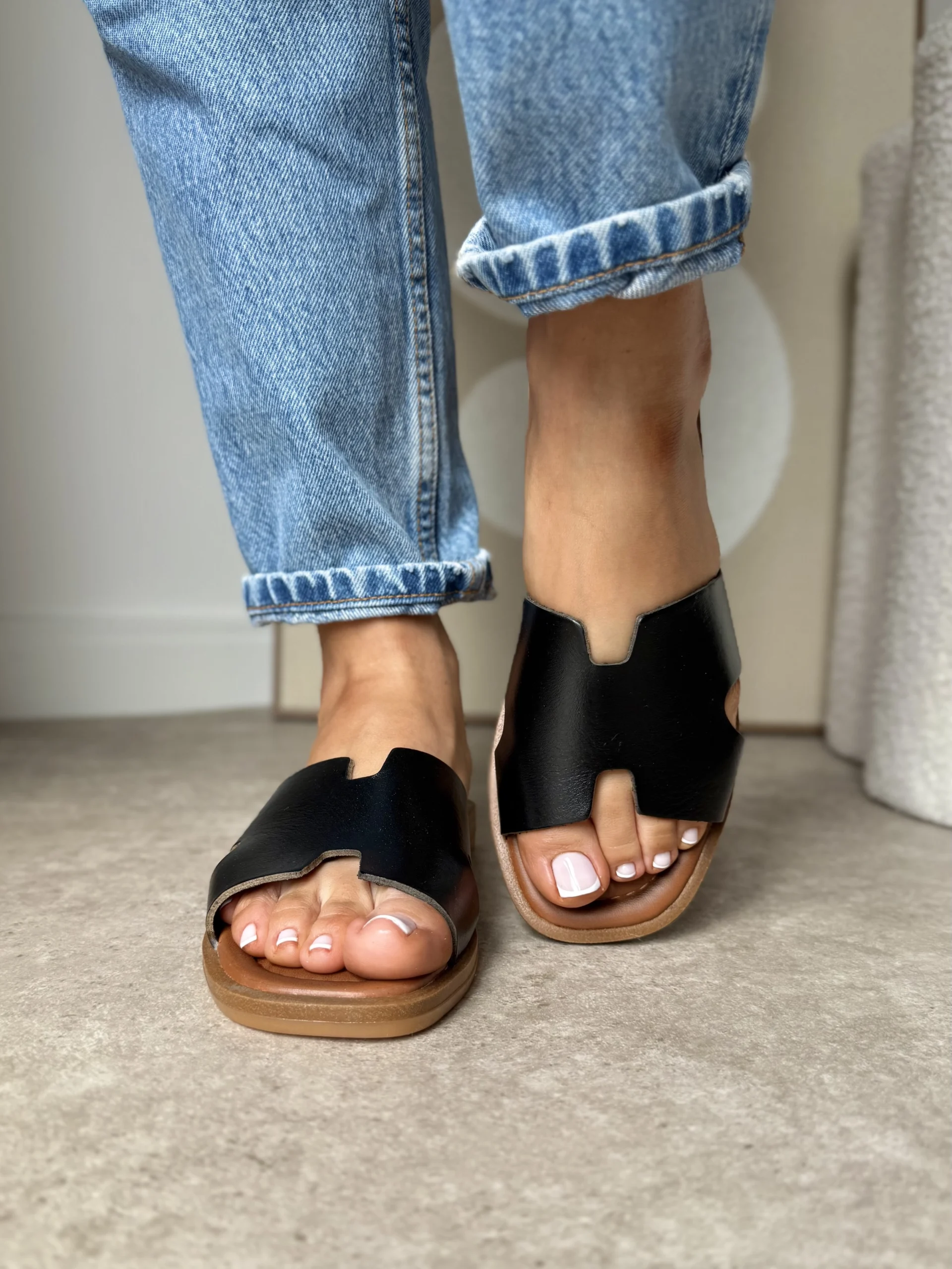 Czarne skórzane klapki LULA 11 na stopach kobiety w niebieskich jeansach – widok z przodu.