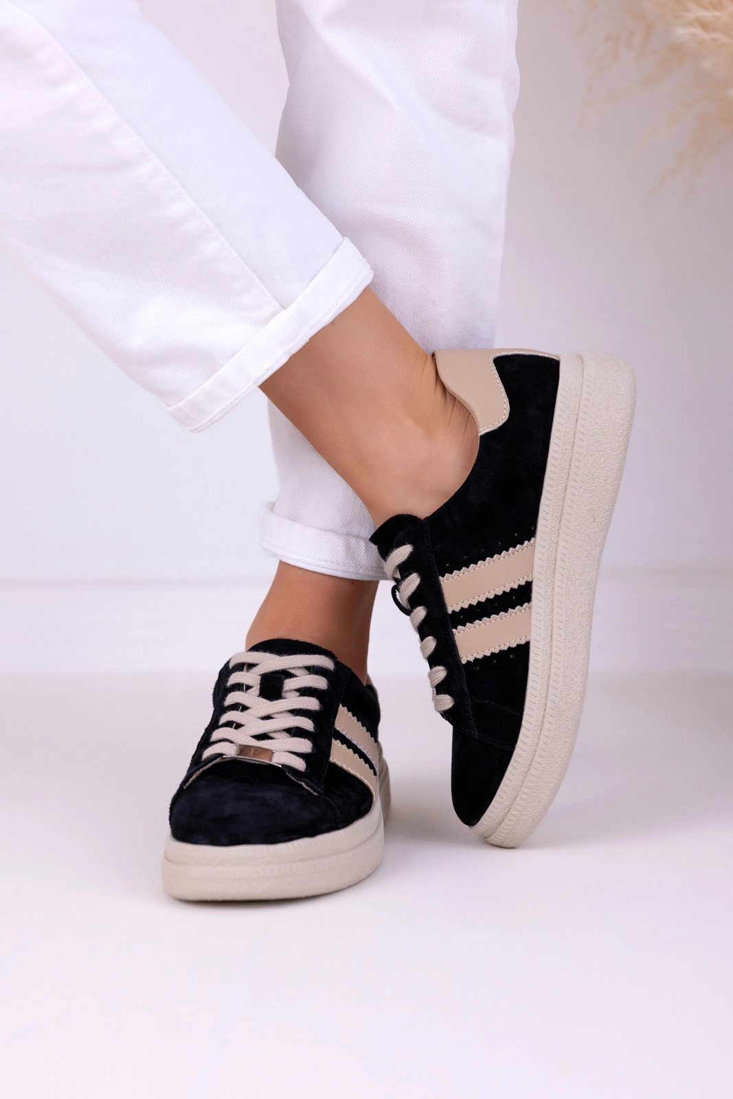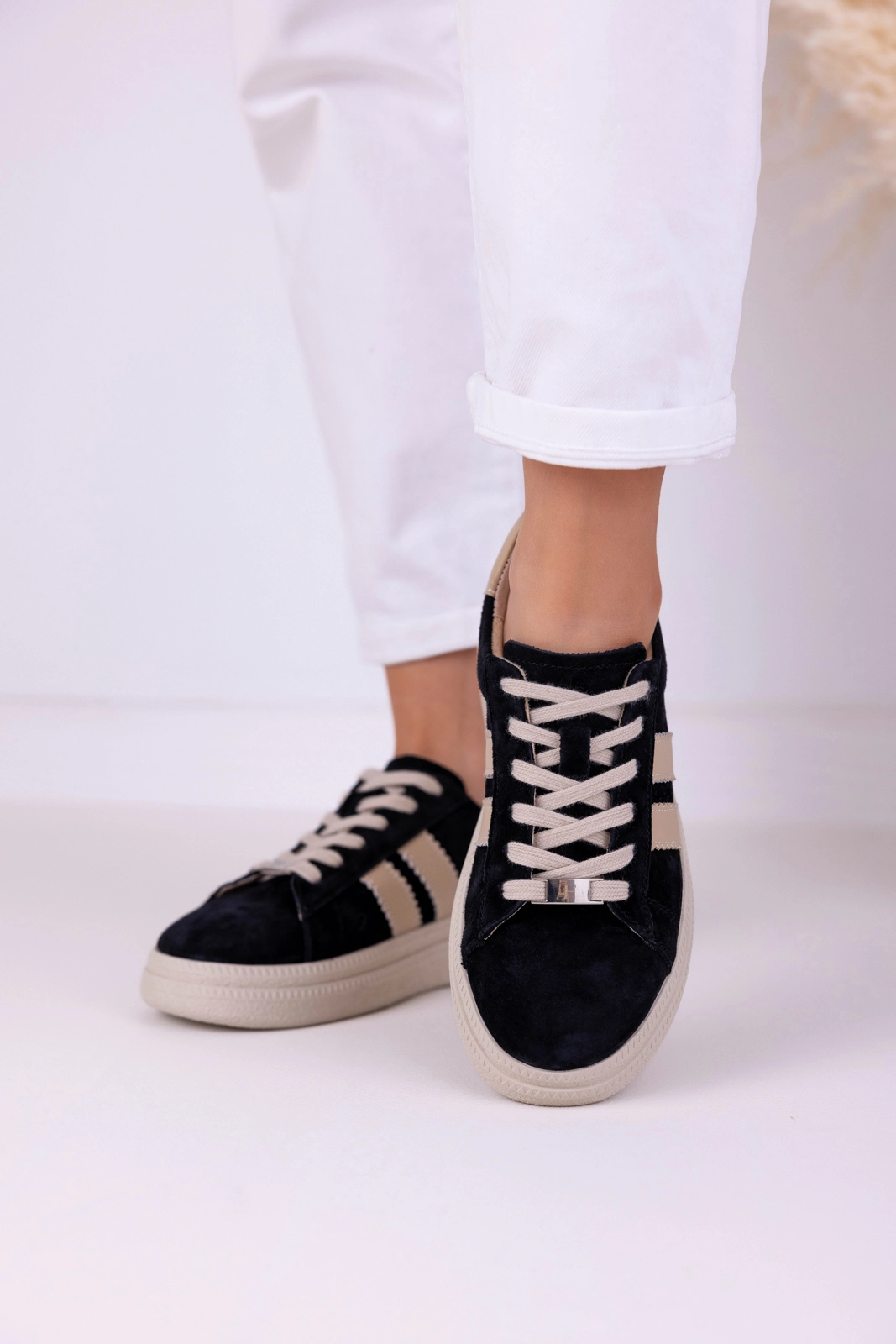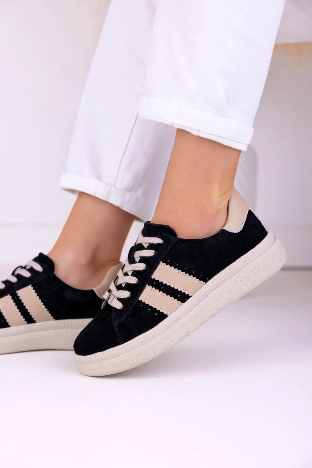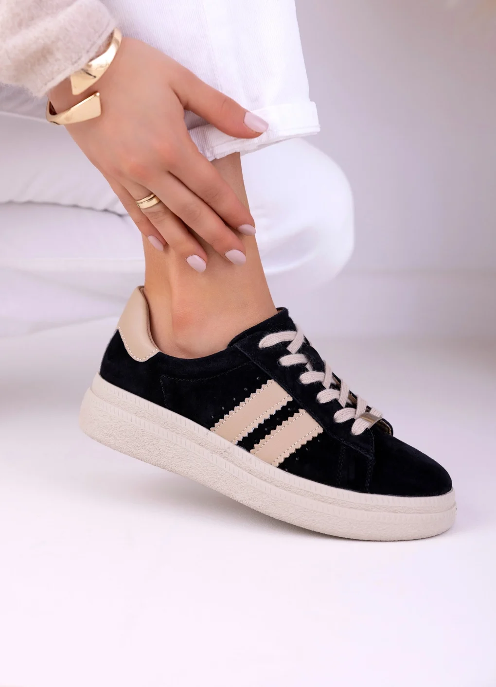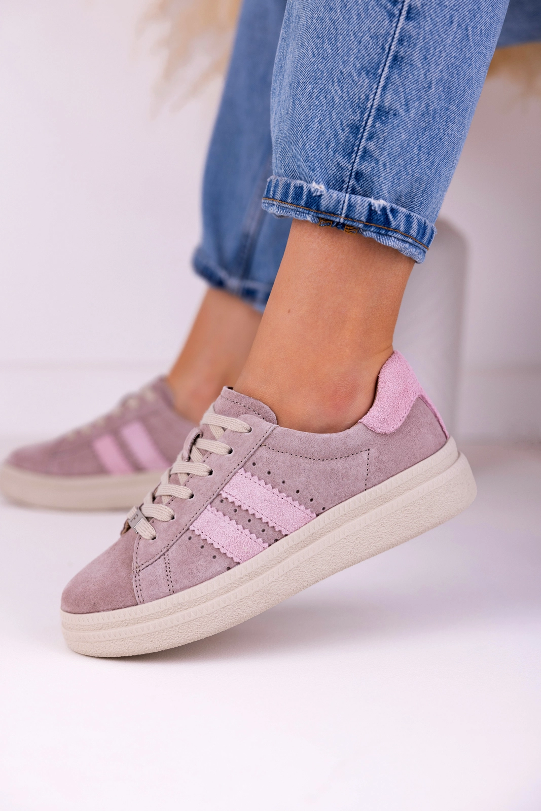 Cholewka została wykonana z naturalnej skóry zamszowej, ponieważ materiał ten jest miękki i przyjemny w dotyku. Dodatkowo dobrze dopasowuje się do stopy, co wpływa na wygodę noszenia. Zamsz nadaje butom elegancki wygląd, a jednocześnie sprawia, że całość prezentuje się nowocześnie. Starannie dopracowane detale podkreślają estetykę modelu, dlatego sneakersy zachowują schludny wygląd przez długi czas.