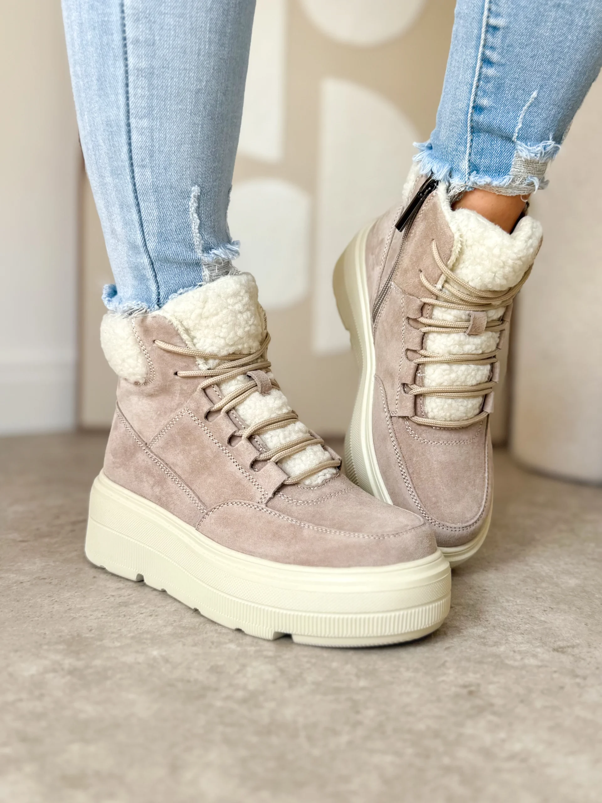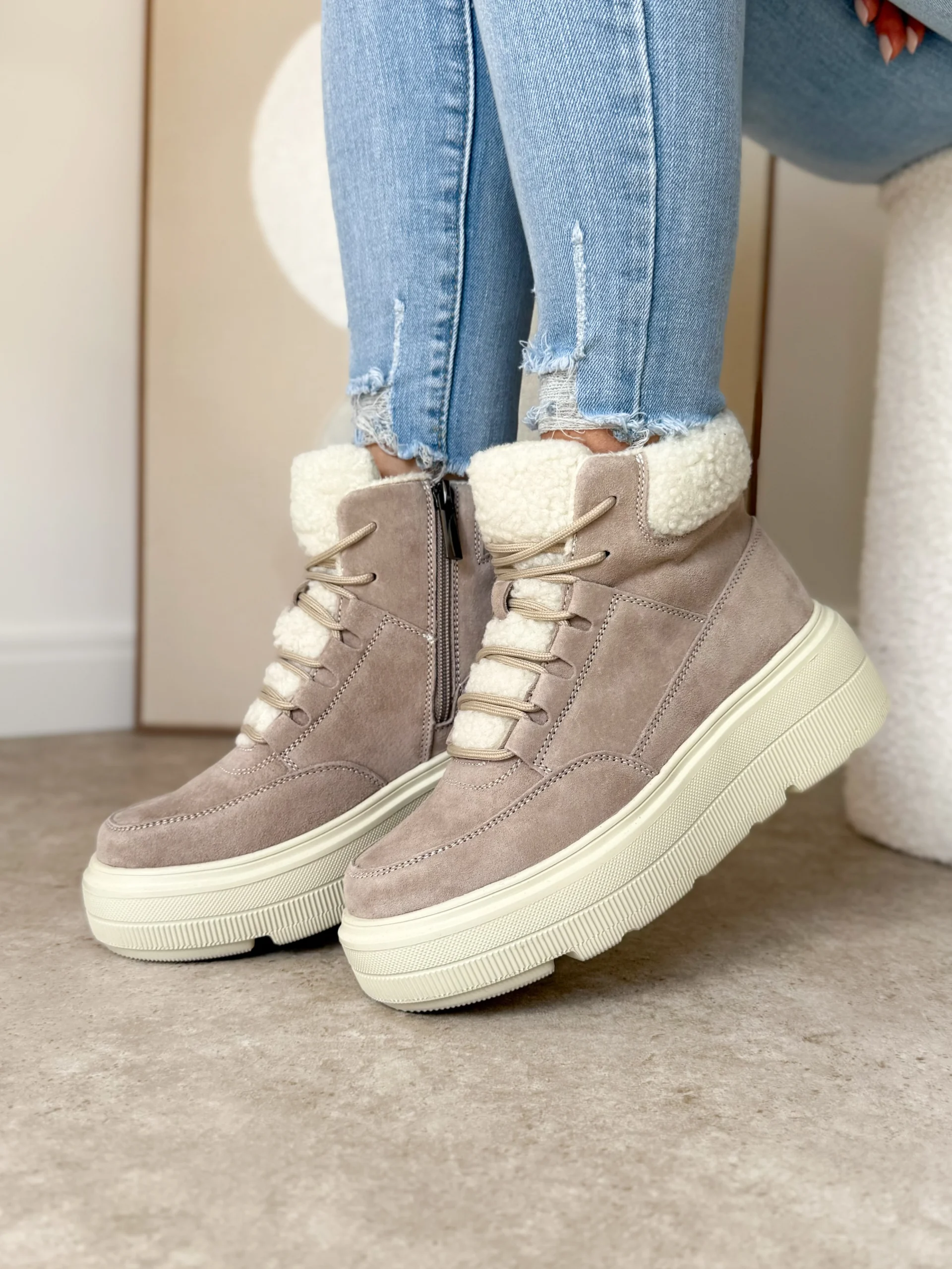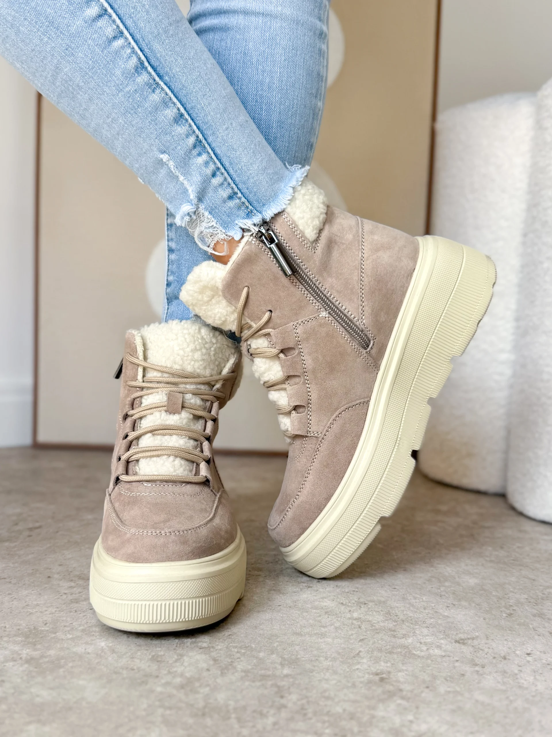Beżowe zimowe sneakersy LULA 105 to doskonałe połączenie nowoczesnego designu oraz praktycznych rozwiązań. Wykonane zostały z wysokiej jakości skóry naturalnej zamszowej, dzięki czemu wyglądają elegancko i ponadczasowo. Co więcej, delikatny beżowy odcień sprawia, że idealnie komponują się z zimowymi stylizacjami – zarówno tymi codziennymi, jak i bardziej casualowymi.