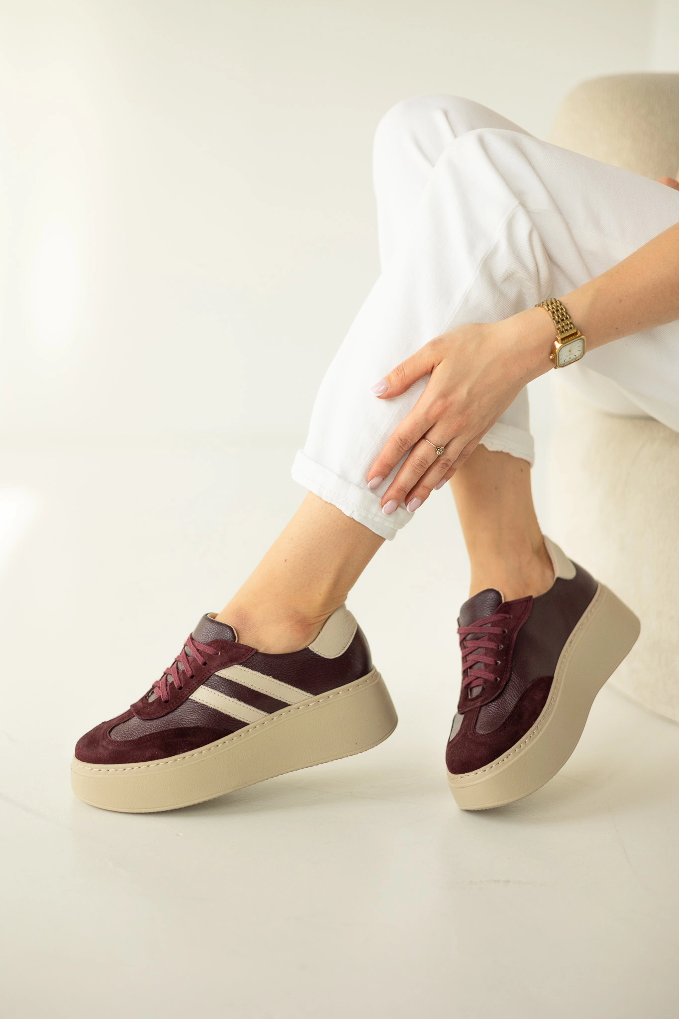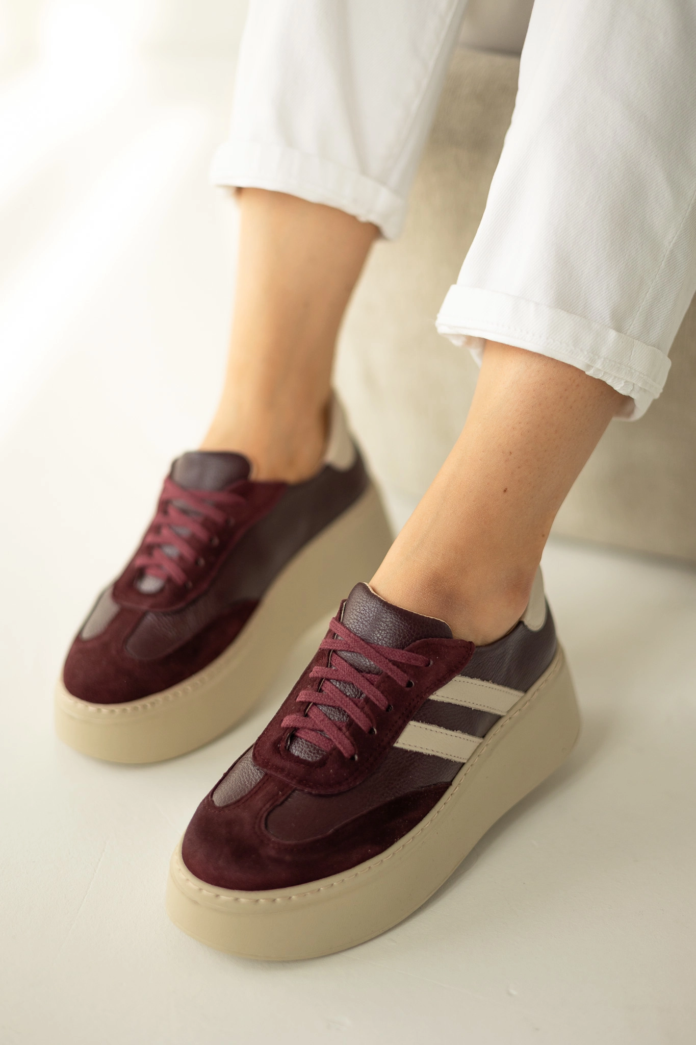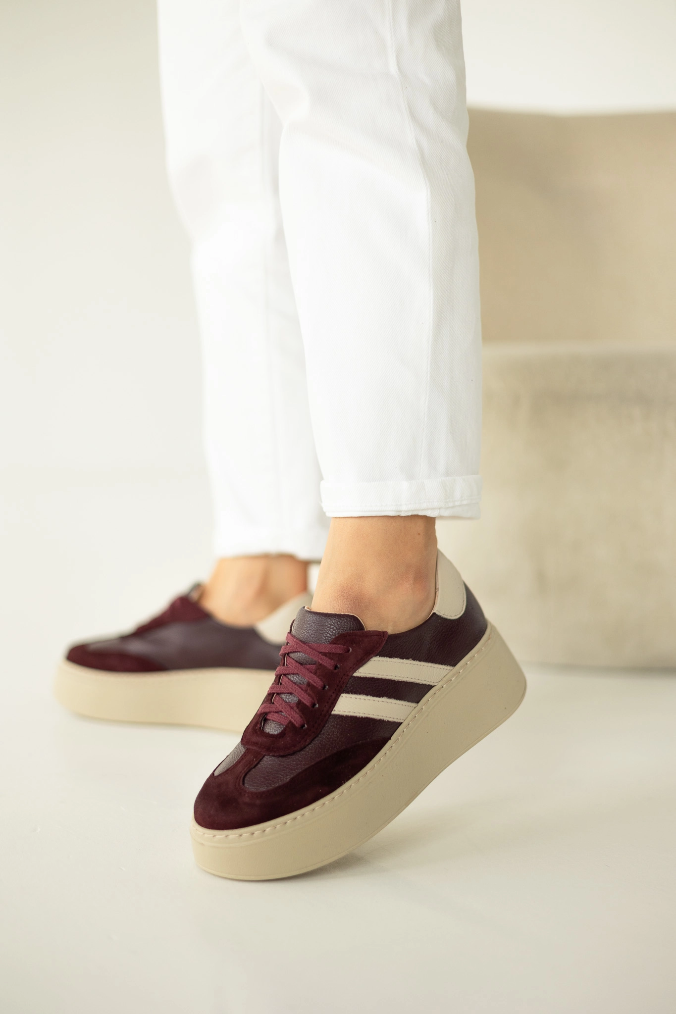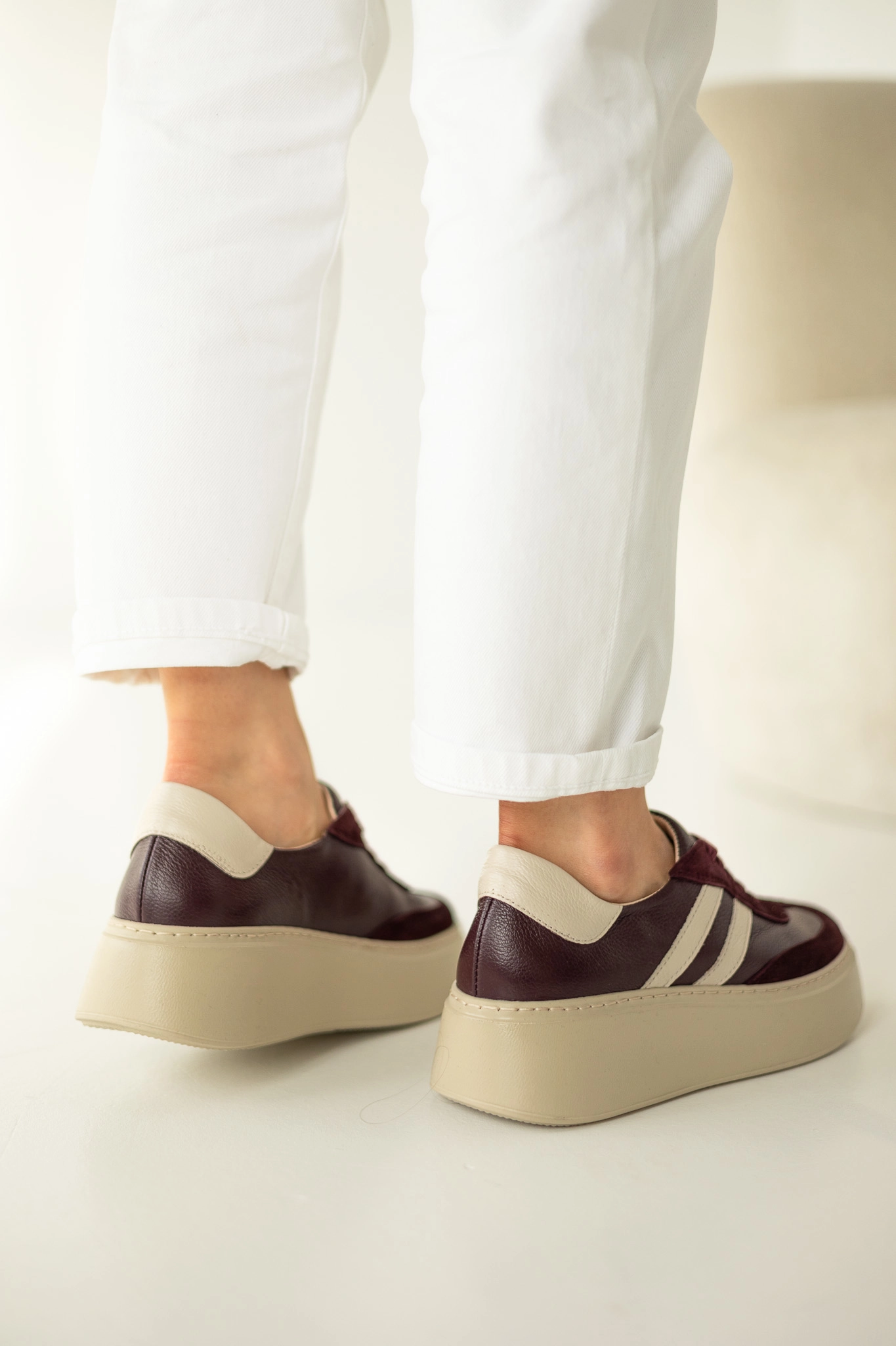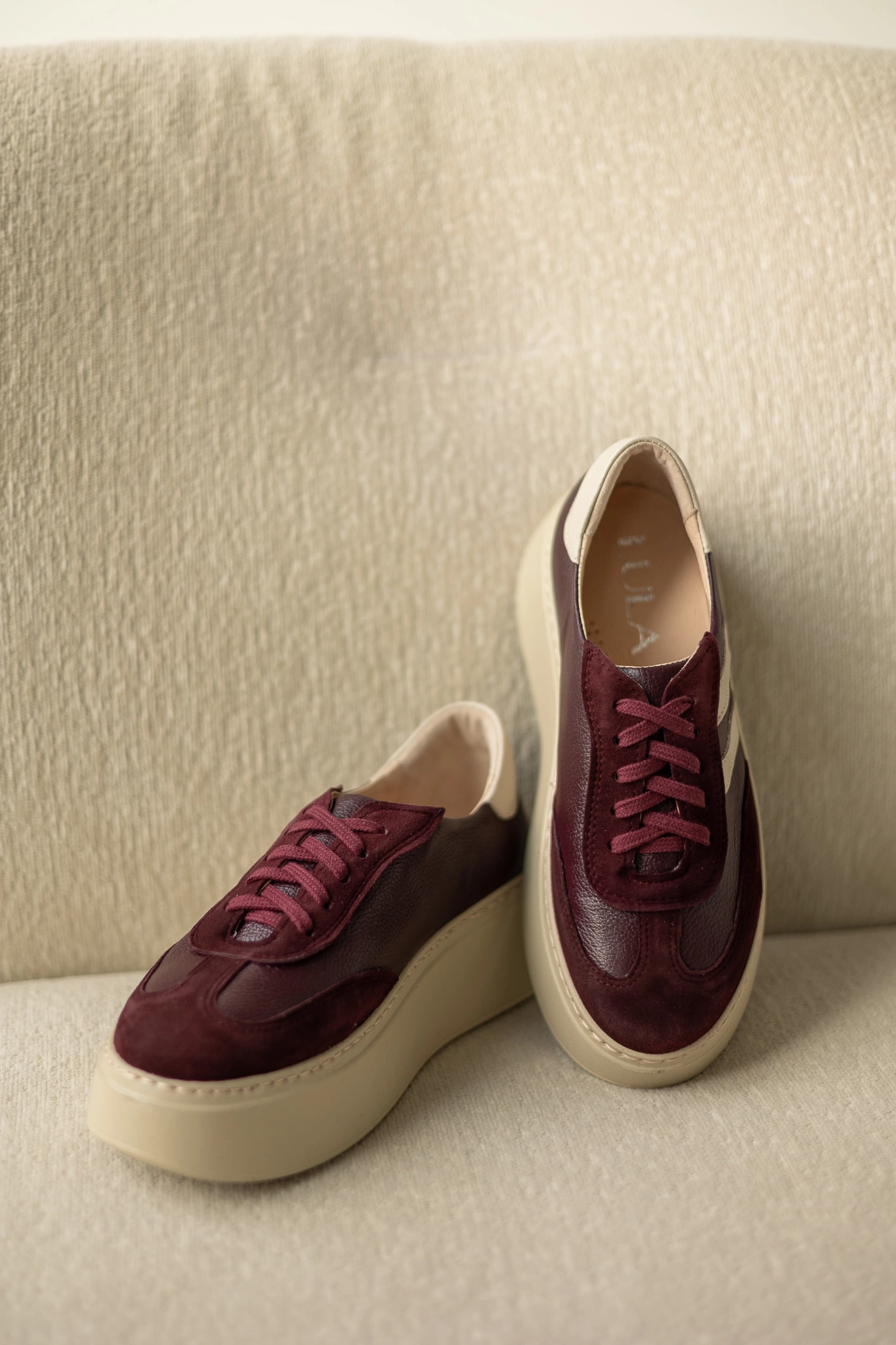 Kolor głębokiego bordo to absolutny trend jesieni i zimy 2025. Dzięki zestawieniu z beżową podeszwą buty prezentują się wyjątkowo stylowo i pasują do wielu stylizacji. Możesz je połączyć z jeansami, eleganckimi spodniami czy sukienką – w każdej odsłonie sneakersy skórzane damskie LULA 111 podkreślą Twój charakter i wyczucie stylu.