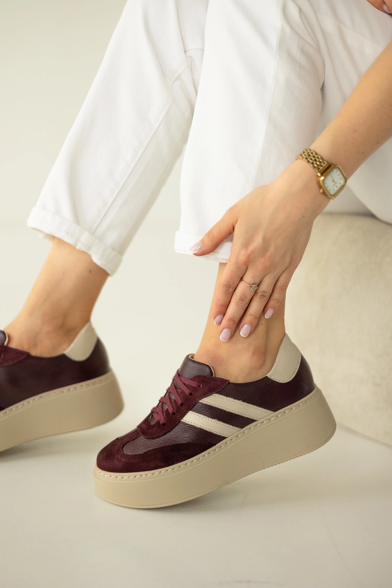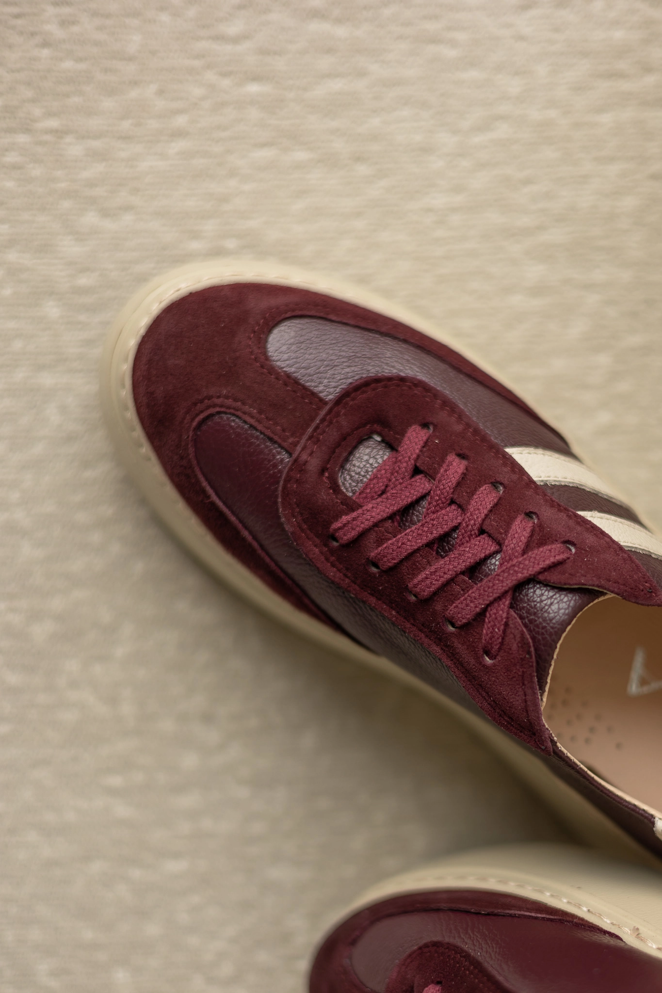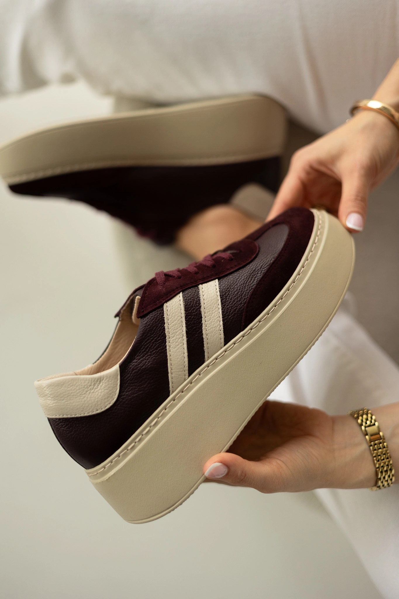 Projektanci postawili na połączenie skóry naturalnej groszkowej w kolorze głębokiego bordo z elementami z naturalnej skóry welurowej koziej. Dzięki temu buty są eleganckie, a jednocześnie wyjątkowo trwałe. Co więcej, beżowe wstawki z groszkowej skóry pięknie kontrastują z bordem, tworząc ponadczasowy design.