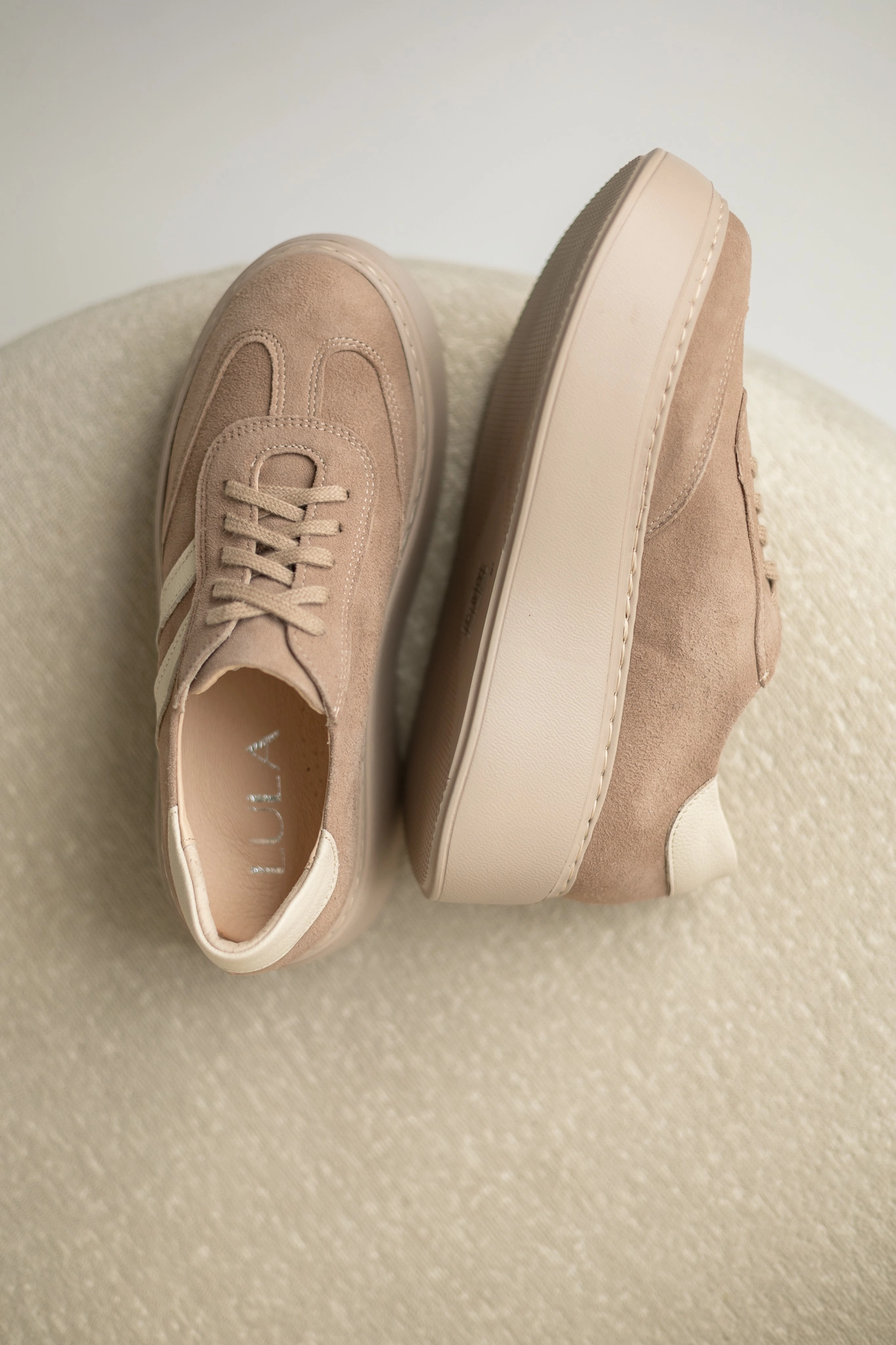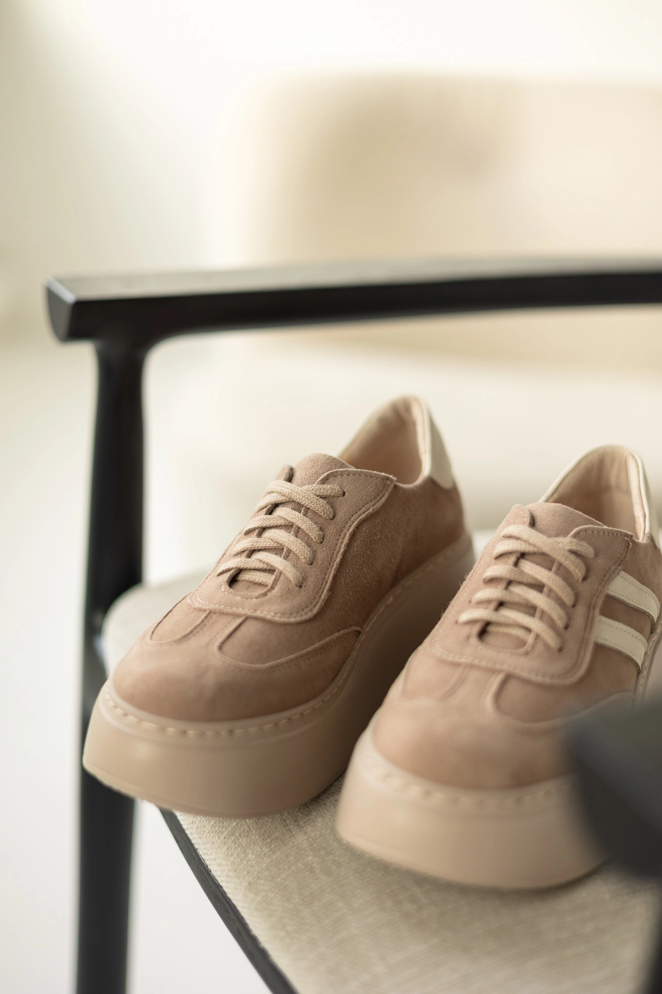 Wnętrze obuwia wyściełano naturalną skórą, dlatego Twoje stopy mogą oddychać przez cały dzień. Skórzana wkładka idealnie dopasowuje się do kształtu stopy, a lekka platforma w kolorze taupe zapewnia wygodę i stabilność przy każdym kroku. Dzięki temu sneakersy sprawdzają się zarówno na spacerach, jak i w pracy czy podczas spotkań.