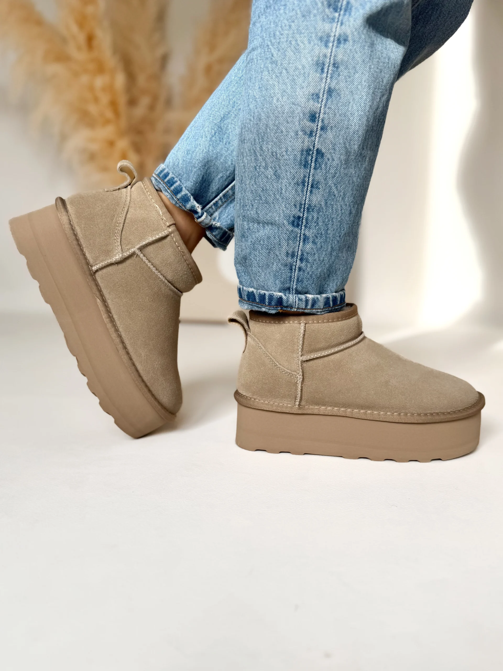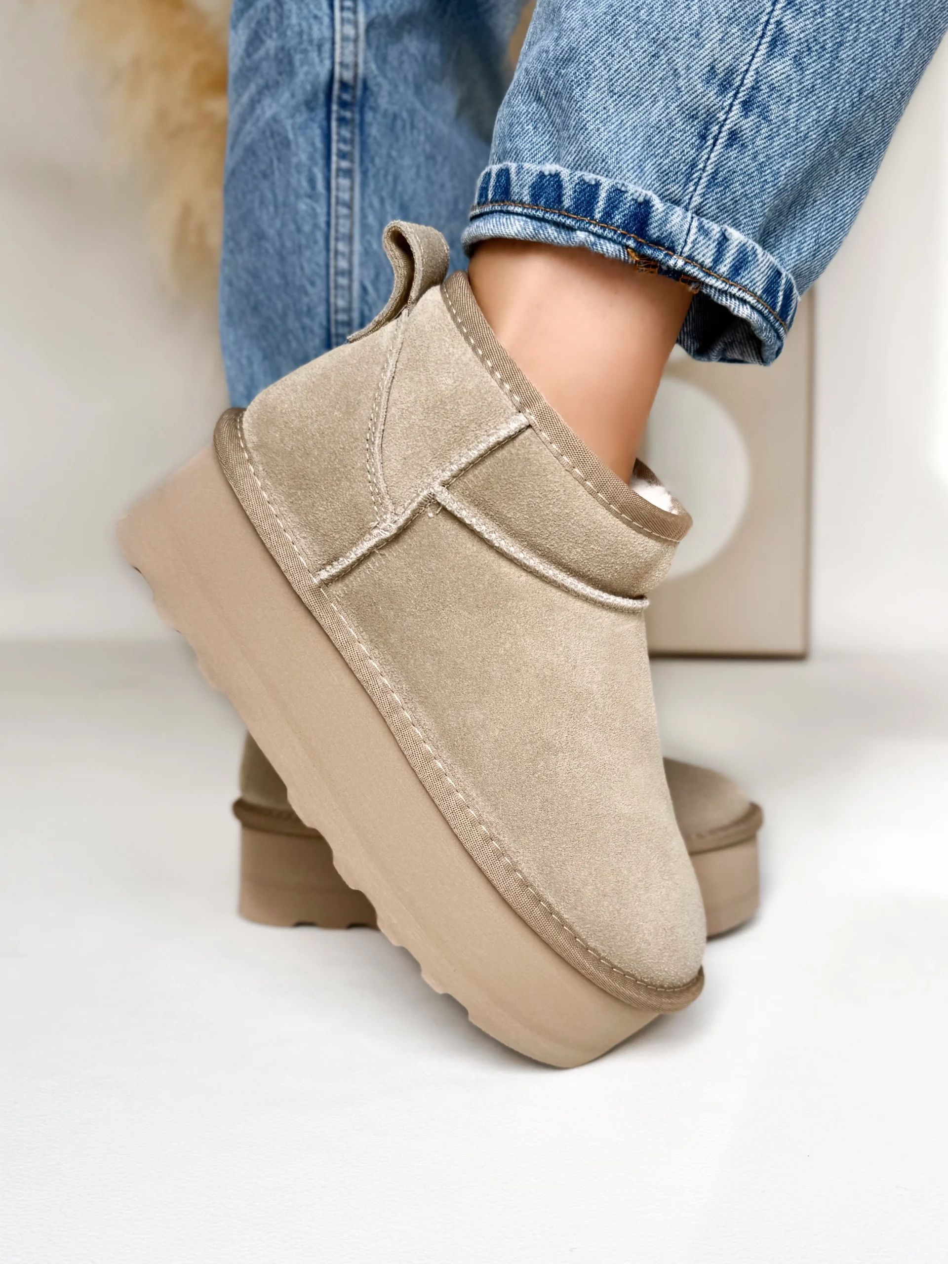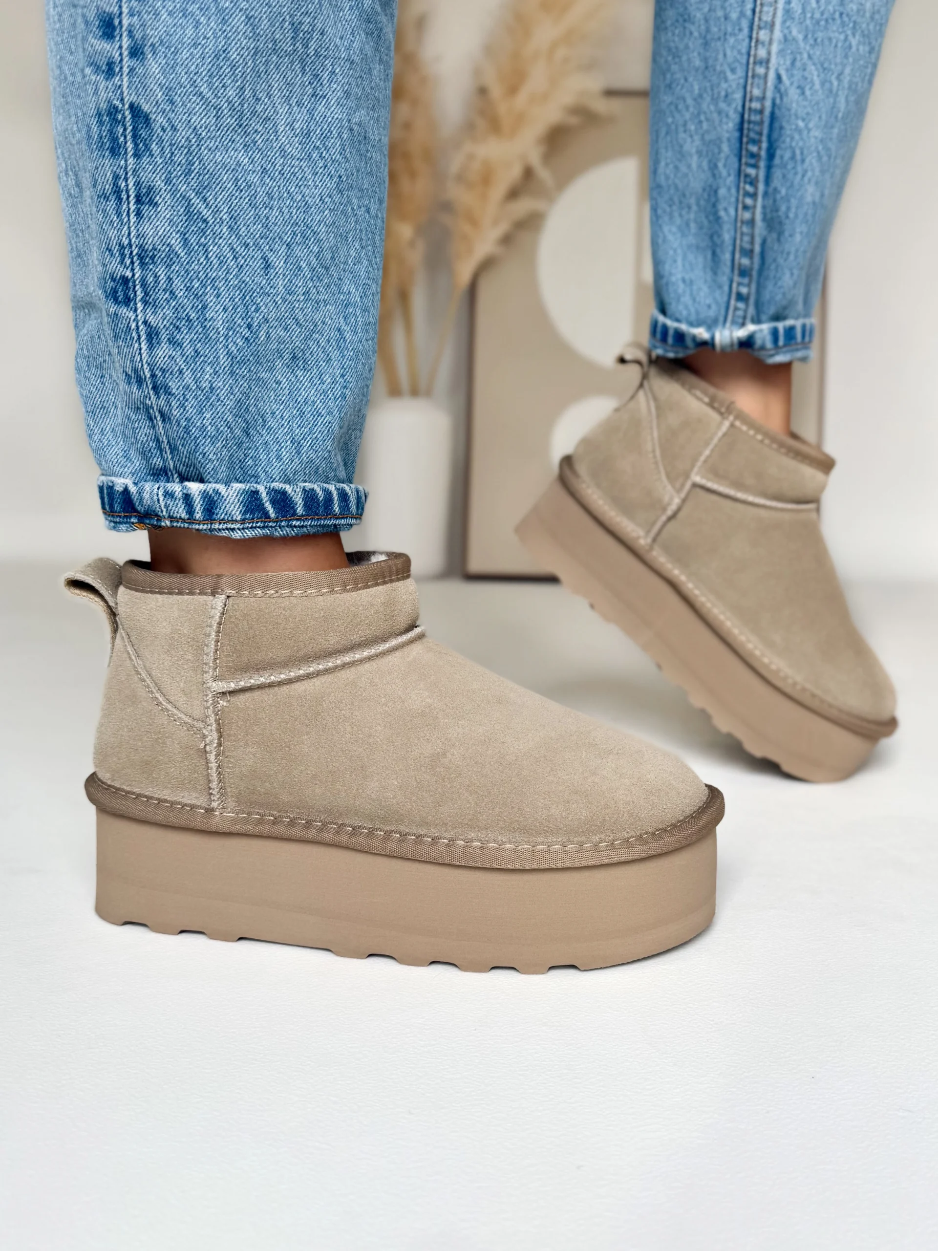 Wnętrze butów zostało w całości ocieplone puszystym futerkiem, dzięki czemu zapewniają przyjemne ciepło nawet podczas mroźnych dni. Co więcej, zastosowana podeszwa o wysokości 5 cm nie tylko dodaje kilku centymetrów wzrostu, ale również świetnie amortyzuje każdy krok. Dzięki temu chodzenie w nich jest niezwykle komfortowe, nawet przez wiele godzin.